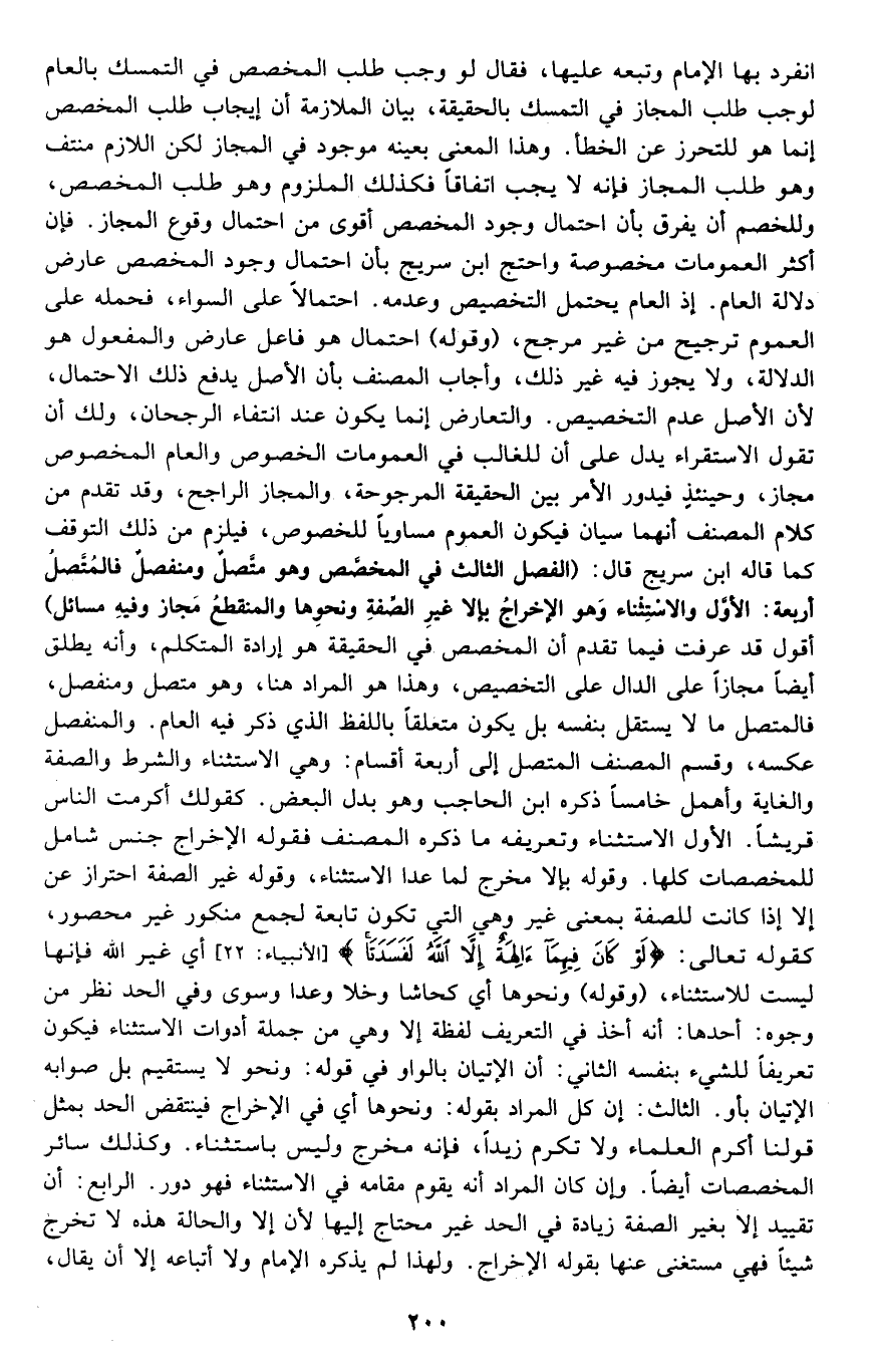قال: "الفصل الثالث: في المخصص وهو متصل ومنفصل, فالمتصل أربعة: الأول, والاستثناء وهو الإخراج بإلا غير الصفة ونحوها والمنقطع مجاز، وفيه مسائل". أقول: قد عرفت فيما تقدم أن المخصص في الحقيقة هو إرادة المتكلم, وأنه يطلق أيضا مجازا على الدال على التخصيص، وهذا هو المراد هنا، وهو متصل ومنفصل، فالمتصل ما لا يستقل بنفسه بل يكون متعلقا باللفظ الذي ذكر فيه العام، والمنفصل عكسه، وقسم المصنف المتصل إلى أربعة أقسام, وهي: الاستثناء والشرط والصفة والغاية وأهمل خامسا ذكره ابن الحاجب وهو بدل البعض كقولك: أكرمت الناس قريشا. الأول: الاستثناء, وتعريفه ما ذكره المصنف فقوله: الإخراج جنس شامل للمخصصات كلها, وقوله: بالإ مخرج لما عدا الاستثناء، وقوله: غير الصفة احتراز عن إلا إذا كانت للصفة بمعنى غير وهي التي تكون تابعة لجمع منكور غير محصور، كقوله تعالى: {لَوْ كَانَ فِيهِمَا آلِهَةٌ إِلَّا اللَّهُ لَفَسَدَتَا} [الأنبياء: 22] أي: غير الله فإنها ليست للاستثناء. وقوله: "ونحوها" أي: كحاشا وخلا وعدا وسوى وفي الحد نظر من وجوه أحدها: أنه أخذ في التعريف لفظة إلا وهي من جملة أدوات الاستثناء فيكون تعريفا للشيء بنفسه. الثاني: أن الإتيان بالواو في قوله: ونحو, لا يستقيم بل صوابه الإتيان بأو. الثالث: إن كان المراد بقوله: ونحوها أي في الإخراج, فينتقض الحد بمثل قولنا: أكرم العلماء ولا تكرم زيدا، فإنه مخرج وليس باستثناء, وكذلك سائر المخصصات أيضا, وإن كان المراد أنه يقوم مقامه في الاستثناء فهو دور. الرابع: أن تقييد إلا بغير الصفة زيادة في الحد غير محتاج إليها؛ لأن إلا والحالة هذه لا تخرج شيئا فهي مستغنى عنها بقوله الإخراج؛ ولهذا لم يذكره الإمام ولا أتباعه إلا أن يقال: