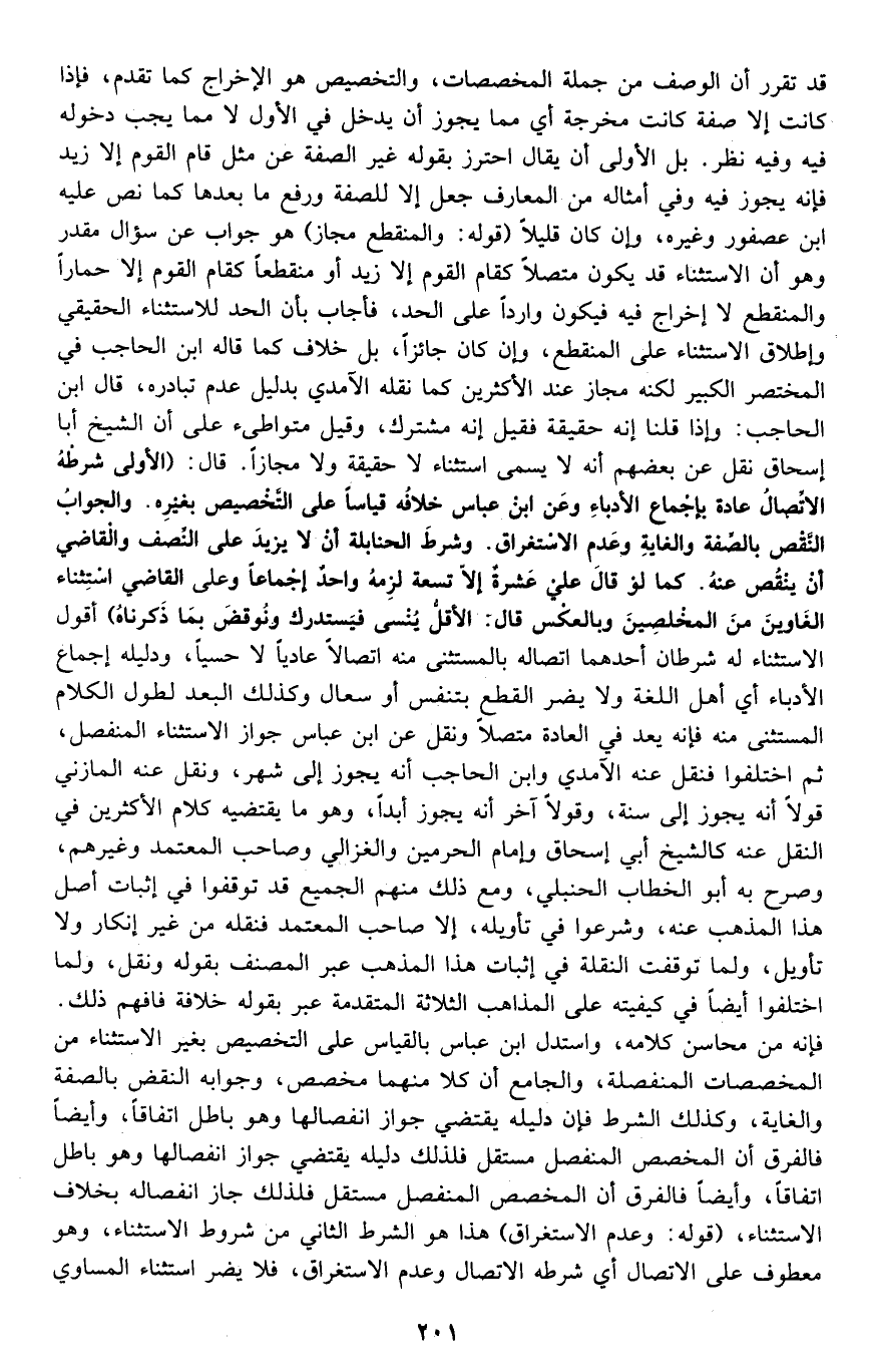 قد تقرر أن الوصف من جملة المخصصات، والتخصيص هو الإخراج كما تقدم، فإذا كانت إلا صفة كانت مخرجة أي: مما يجوز أن يدخل في الأول لا مما يجب دخوله فيه وفيه نظر، بل الأولى أن يقال: احترز بقوله غير الصفة عن مثل: قام القوم إلا زيد فإنه يجوز فيه وفي أمثاله من المعارف جعل إلا للصفة ورفع ما بعدها كما نص عليه ابن عصفور وغيره، وإن كان قليلا. قوله: "والمنقطع مجاز" هو جواب عن سؤال مقدر وهو أن الاستثناء قد يكون متصلا كقام القوم إلا زيدا أو منقطعا كقام القوم إلا حمارًا والمنقطع لا إخراج فيه فيكون واردا على الحد, فأجاب بأن الحد للاستثناء الحقيقي وإطلاق الاستثناء على المنقطع وإن كان جائزا بلا خلاف كما قاله ابن الحاجب في المختصر الكبير, لكنه مجاز عند الأكثرين كما نقله الآمدي بدليل عدم تبادره، قال ابن الحاجب: وإذا قلنا: إنه حقيقة فقيل: إنه مشترك، وقيل: متواطئ على أن الشيخ أبا إسحاق نقل عن بعضهم أنه لا يسمى استثناء لا حقيقة ولا مجازًا. قال: "الأولى شرطه الاتصال عادة بإجماع الأدباء وعن ابن عباس خلافه قياسا على التخصيص بغيره، والجواب النقص بالصفة والغاية وعدم الاستغراق، وشرط الحنابلة أن لا يزيد على النصف والقاضي أن ينقص عنه, كما لو قال: علي عشرة إلا تسعة, لزمه واحد إجماعا وعلى القاضي استثناء الغاوين من المخلصين, وبالعكس قال: الأقل ينسى فيستدرك ونوقض بما ذكرناه". أقول: الاستثناء له شرطان أحدهما: اتصاله بالمستثنى منه اتصالا عاديا لا حسيا، ودليله إجماع الأدباء أي: أهل اللغة ولا يضر القطع بتنفس أو سعال وكذلك البعد لطول الكلام المستثنى منه فإنه يعد في العادة متصلا, ونقل عن ابن عباس جواز الاستثناء المنفصل، ثم اختلفوا فنقل عنه الآمدي وابن الحاجب أنه يجوز إلى شهر، ونقل عنه المازني قولا أنه يجوز إلى سنة, وقولا آخر أنه يجوز أبدا, وهو ما يقتضيه كلام الأكثرين في النقل عنه كالشيخ أبي إسحاق وإمام الحرمين والغزالي وصاحب المعتمد وغيرهم، وصرح به أبو الخطاب الحنبلي، ومع ذلك منهم الجميع قد توقفوا في إثبات أصل هذا المذهب عنه، وشرعوا في تأويله، إلا صاحب المعتمد فنقله من غير إنكار ولا تأويل، ولما توقفت النقلة في إثبات هذا المذهب عبر المصنف بقوله: ونقل، ولما اختلفوا أيضا في كيفيته على المذاهب الثلاثة المتقدمة عبر بقوله: خلافه فافهم ذلك, فإنه من محاسن كلامه، واستدل ابن عباس بالقياس على التخصيص بغير الاستثناء من المخصصات المنفصلة، والجامع أن كلا منهما مخصص، وجوابه النقض بالصفة والغاية، وكذلك الشرط فإن دليله يقتضي جواز انفصالها وهو باطل اتفاقا, وأيضا فالفرق أن المخصص المنفصل مستقل فلذلك دليله يقتضي جواز انفصالها وهو باطل اتفاقا، وأيضا فالفرق أن المخصص المنفصل مستقل فلذلك جاز انفصاله بخلاف الاستثناء. قوله: "وعدم الاستغراق" هذا هو الشرط الثاني من شروط الاستثناء، وهو معطوف على الاتصال أي: شرطه الاتصال وعدم الاستغراق، فلا يضر استثناء المساوي