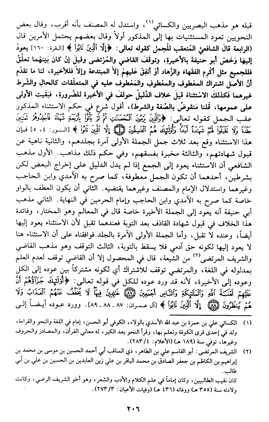 قبله هو مذهب البصريين والكسائي1، واستدل له المصنف بأنه أقرب، وقال بعض النحويين: تعود المستثنيات بها إلى المذكور أولا وقال بعضهم: يحتمل الأمرين. قال: "الرابعة: قال الشافعي: المتعقب للجمل كقوله تعالى: {إِلَّا الَّذِينَ تَابُوا} [البقرة: 160] يعود إليها وخص أبو حنيفة بالأخيرة، وتوقف القاضي والمرتضى وقيل: إن كان بينهما تعلق فللجميع مثل: أكرم الفقهاء والزهاد أو أنفق عليهم إلا المبتدعة وإلا فللأخيرة، لنا ما تقدم أن الأصل اشتراك المعطوف والمعطوف عليه في المتعلقات كالحال والشرط وغيرهما, فكذلك الاستثناء قيل خلاف الدليل حولف في الأخيرة للضرورة, قبقيت الأولى على عمومها, قلنا: منقوض بالصفة والشرط". أقول: شرع في حكم الاستثناء المذكور عقب الجمل كقوله تعالى: {وَالَّذِينَ يَرْمُونَ الْمُحْصَنَاتِ ثُمَّ لَمْ يَأْتُوا بِأَرْبَعَةِ شُهَدَاءَ فَاجْلِدُوهُمْ ثَمَانِينَ جَلْدَةً وَلا تَقْبَلُوا لَهُمْ شَهَادَةً أَبَدًا وَأُولَئِكَ هُمُ الْفَاسِقُونَ، إِلَّا الَّذِينَ تَابُوا} [النور: 4، 5] فإن هذا الاستثناء وقع بعد ثلاث جمل, الجملة الأولى آمرة بجلدهم، والثانية ناهية عن قبول شهادتهم، والثالثة مخبرة بفسقهم، وفي حكم ذلك مذاهب، الأول مذهب الشافعي: أن الاستثناء يعود إلى الجمع إذا لم يدل الدليل على إخراج البعض لكن بشرطين، أحدهما: أن تكون الجمل معطوفة، كما صرح به الآمدي وابن الحاجب وغيرهما واستدلال الإمام والمصنف وغيرهما يقتضيه, الثاني: أن يكون العطف بالواو خاصة كما صرح به الآمدي وابن الحاجب وإمام الحرمين في النهاية. الثاني مذهب أبي حنيفة: أنه يعود إلى الجملة الأخيرة خاصة قال في المعالم: وهو المختار، وفائدة هذا الخلاف في قبول شهادة القاذف بعد التوبة فعندهما تقبل؛ لأن الاستثناء يعود إليها أيضا، وعنده لا تقبل، وأما الجملة الأولى الآمرة بالجلد فوافقناه على أن الاستثناء هنا لا يعود إليها لكونه حق آدمي فلا يسقط بالتوبة. الثالث: التوقف وهو مذهب القاضي والشريف المرتضى2 من الشيعة، قال في المحصول: إلا أن القاضي توقف لعدم العلم بمدلوله في اللغة، والمرتضى توقف للاشتراك أي: لكونه مشتركا بين عوده إلى الكل وعوده إلى الأخيرة؛ لأنه قد ورد عوده للكل في قوله تعالى: {أُولَئِكَ جَزَاؤُهُمْ أَنَّ عَلَيْهِمْ لَعْنَةَ اللَّهِ وَالْمَلائِكَةِ وَالنَّاسِ أَجْمَعِينَ، خَالِدِينَ فِيهَا لا يُخَفَّفُ عَنْهُمُ الْعَذَابُ وَلا هُمْ يُنْظَرُونَ، إِلَّا الَّذِينَ تَابُوا} [آل عمران: 87-89] . وورد عوده أيضا إلى