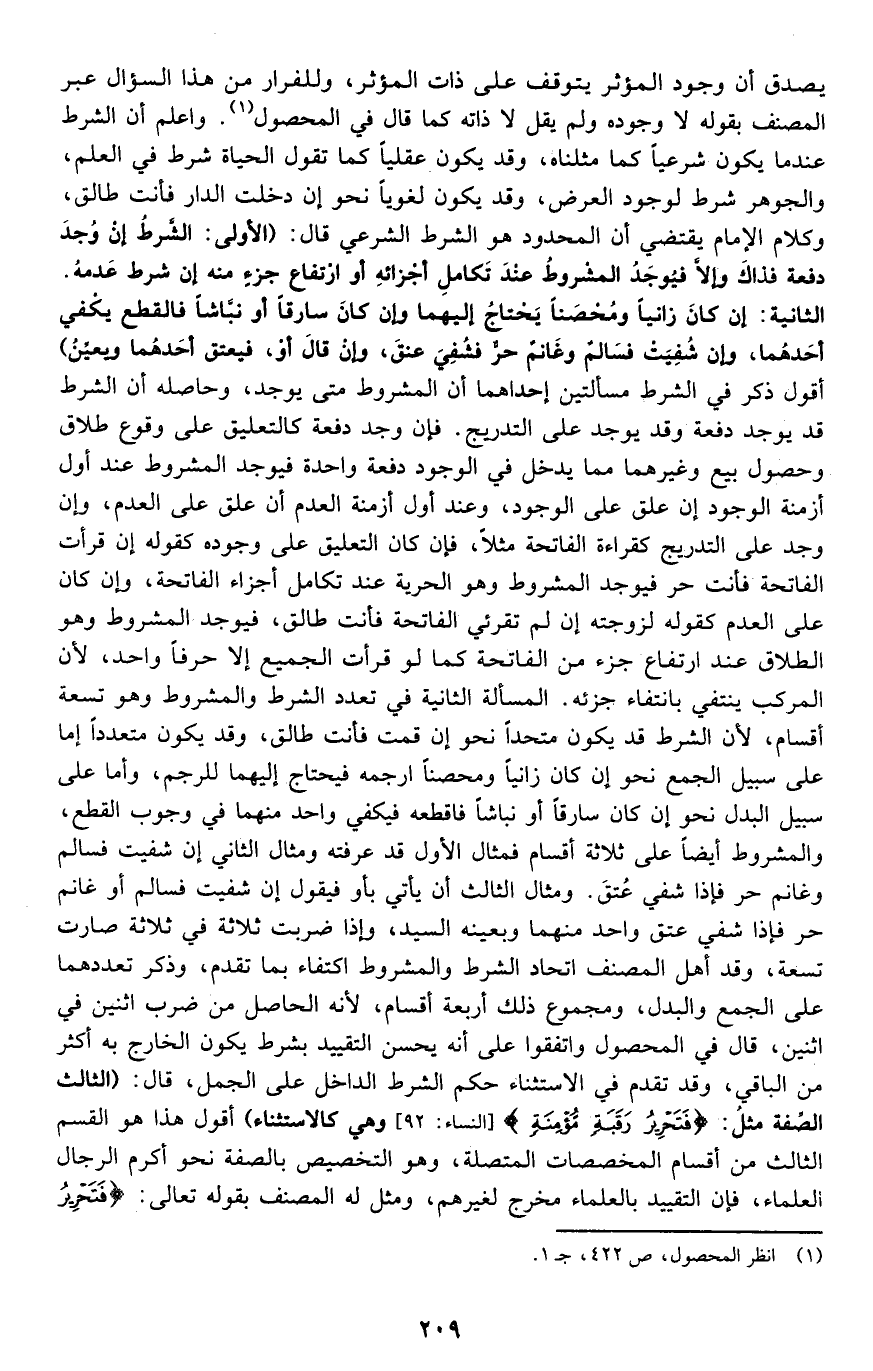 يصدق أن وجود المؤثر يتوقف على ذات المؤثر، وللفرار من هذا السؤال عبر المصنف بقوله: لا وجوده ولم يقل: لا ذاته كما قال في المحصول1. واعلم أن الشرط عندما يكون شرعيا كما مثلناه، وقد يكون عقليا كما تقول: الحياة شرط في العلم, والجوهر شرط لوجود العرض، وقد يكون لغويا نحو: إن دخلت الدار فأنت طالق، وكلام الإمام يقتضي أن المحدود هو الشرط الشرعي. قال: "الأولى: الشرط إن وجد دفعة فذاك, وإلا فيوجد المشروط عند تكامل أجزائه أو ارتفاع جزء منه إن شرط عدمه. الثانية: إن كان زانيا ومحصنا يحتاج إليهما, وإن كان سارقا أو نباشا فالقطع يكفي أحدهما، وإن شفيت فسالم وغانم حر فشفي عتق، وإن قال: أو، فيعتق أحدهما ويعين". أقول: ذكر في الشرط مسألتين, إحداهما: أن المشروط متى يوجد؟ وحاصله أن الشرط قد يوجد دفعة وقد يوجد على التدريج؛ فإن وجد دفعة كالتعليق على وقوع طلاق وحصول بيع وغيرهما مما يدخل في الوجود دفعة واحدة, فيوجد المشروط عند أول أزمنة الوجود إن علق على الوجود، وعند أول أزمنة العدم إن علق على العدم، وإن وجد على التدريج كقراءة الفاتحة مثلا, فإن كان التعليق على وجوده كقوله: إن قرأت الفاتحة فأنت حر, فيوجد المشروط وهو الحرية عند تكامل أجزاء الفاتحة، وإن كان على العدم كقوله لزوجته: إن لم تقرئي الفاتحة فأنت طالق، فيوجد المشروط وهو الطلاق عند ارتفاع جزء من الفاتحة كما لو قرأت الجميع إلا حرفا واحدا؛ لأن المركب ينتفي بانتفاء جزئه. المسألة الثانية: في تعدد الشرط والمشروط, وهو تسعة أقسام؛ لأن الشرط قد يكون متحدا نحو: إن قمت فأنت طالق، وقد يكون متعددا إما على سبيل الجمع نحو: إن كان زانيا ومحصنا ارجمه, فيحتاج إليهما للرجم، وإما على سبيل البدل نحو: إن كان سارقا أو نباشا فاقطعه, فيكفي واحد منهما في وجوب القطع، والمشروط أيضا على ثلاثة أقسام, فمثال الأول قد عرفته ومثال الثاني: إن شفيت فسالم وغانم حر فإذا شفي عتق، ومثال الثالث: أن يأتي بأو فيقول: إن شفيت فسالم أو غانم حر فإذا شفي عتق واحد منهما ويعينه السيد, وإذا ضربت ثلاثة في ثلاثة صارت تسعة، وقد أهمل المصنف اتحاد الشرط والمشروط اكتفاء بما تقدم، وذكر تعددهما على الجمع والبدل, ومجموع ذلك أربعة أقسام؛ لأنه الحاصل من ضرب اثنين في اثنين. قال في المحصول: واتفقوا على أنه يحسن التقييد بشرط يكون الخارج به أكثر من الباقي، وقد تقدم في الاستثناء حكم الشرط الداخل على الجمل. قال: "الثالث: الصفة مثل: {فَتَحْرِيرُ رَقَبَةٍ مُؤْمِنَةٍ} [النساء: 92] وهو كالاستثناء". أقول: هذا هو القسم الثالث من أقسام المخصصات المتصلة, وهو التخصيص بالصفة نحو: أكرم الرجال العلماء، فإن التقييد بالعلماء مخرج لغيرهم، ومثل له المصنف بقوله تعالى: