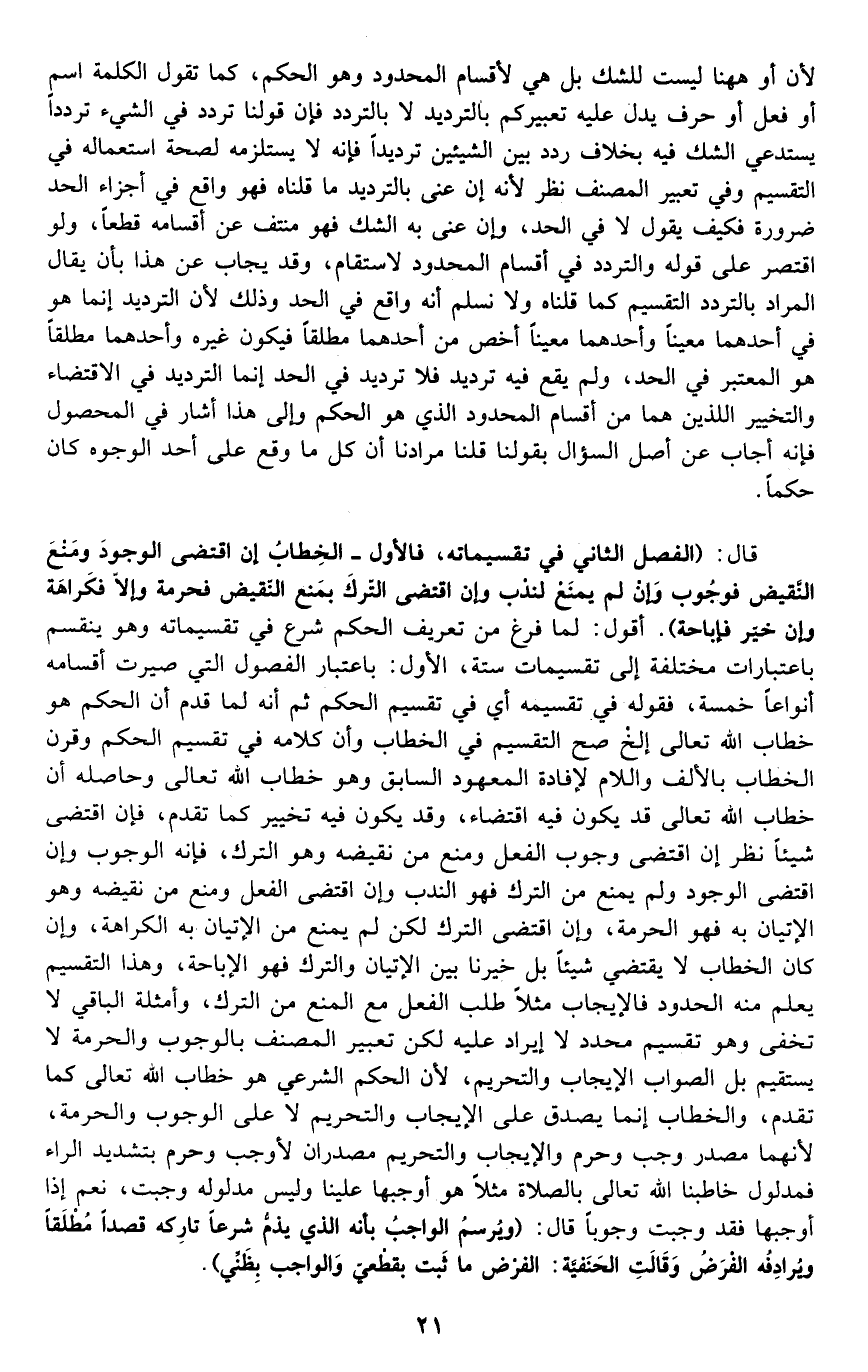 قال: "الفصل الثاني في تقسيماته، فالأول: الخطاب إن اقتضى الوجود ومنع النقيض فوجوب, وإن لم يمنع لندب وإن اقتضى الترك بمنع النقيض فحرمة وإلا فكراهة, وإن خير فإباحة" أقول: لما فرغ من تعريف الحكم شرع في تقسيماته وهو ينقسم باعتبارات مختلفة إلى تقسيمات ستة، الأول: باعتبار الفصول التي صيرت أقسامه أنواعا خمسة، فقول في تقسيمه أي: في تقسيم الحكم ثم إنه لما قدم أن الحكم هو خطاب الله تعالى ... إلخ صح التقسيم في الخطاب وأن كلامه في تقسيم الحكم وقرن الخطاب بالألف واللام لإفادة المعهود السابق وهو خطاب الله تعالى, وحاصله: أن خطاب الله تعالى قد يكون فيه اقتضاء، وقد يكون فيه تخيير كما تقدم، فإن اقتضى شيئا نظر إن اقتضى وجوب الفعل ومنع من نقيضه وهو الترك، فإنه الوجوب وإن اقتضى الوجود ولم يمنع من الترك فهو الندب، وإن اقتضى الفعل ومنع من نقيضه وهو الإتيان به فهو الحرمة, وإن اقتضى الترك لكن لم يمنع من الإتيان به الكراهة، وإن كان الخطاب لا يقتضي شيئا بل خيرنا بين الإتيان والترك فهو الإباحة، وهذا التقسيم يعلم منه الحدود, فالإيجاب مثلا طلب الفعل مع المنع من الترك، وأمثلة الباقي لا تخفى وهو تقسيم محدد لا إيراد عليه لكن تعبير المصنف بالوجوب والحرمة لا يستقيم بل الصواب الإيجاب والتحريم؛ لأن الحكم الشرعي هو خطاب الله تعالى كما تقدم, والخطاب إنما يصدق على الإيجاب والتحريم لا على الوجوب والحرمة؛ لأنهما مصدر وجب وحرم, والإيجاب والتحريم مصدران لأوجب وحرم بتشديد الراء, فمدلول خاطبنا الله تعالى بالصلاة مثلا هو أوجبها علينا وليس مدلوله وجبت، نعم إذا أوجبها فقد وجبت وجوبا قال: "ويرسم الواجب بأنه الذي يذم شرعا تاركه قصدا مطلقا, ويرادفه الفرض وقالت الحنفية: الفرض ما ثبت بقطعي والواجب بظني".