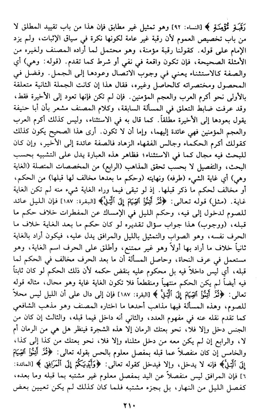 {فَتَحْرِيرُ رَقَبَةٍ مُؤْمِنَةٍ} [النساء: 92] وهو تمثيل غير مطابق, فإن هذا من باب تقييد المطلق لا من باب تخصيص العموم؛ لأن رقبة غير عامة لكونها نكرة في سياق الإثبات، ولم يزد الإمام على قوله، كقولنا: رقبة مؤمنة، وهو محتمل لما أراده المصنف ولغيره من الأمثلة الصحيحة، فأن تكون واقعة في نفي أو شرط كما تقدم. قوله: "وهي" أي: والصفة كالاستثناء يعني في وجوب الاتصال وعودها إلى الجمل، وفضل في المحصول ومختصراته كالحاصل وغيره، فقال: هذا إن كانت الجملة الثانية متعلقة بالأولى نحو: أكرم العرب والعجم المؤمنين، فإن لم تكن فإنها تعود إلى الأخيرة فقط، وقد عرفت ضابط التعلق في المسألة السابقة، وكلام المصنف مشعر بأن أبا حنيفة يقول بعودها إلى الأخيرة مطلقا كما قال به في الاستثناء، وليس كذلك: أكرم العرب والعجم المؤمنين فهي إما عائدة إليهما، وإما أن لا تكون. أرى هذا الصحيح يكون كذلك كقولك: أكرم الحكماء وجالس الفقهاء الزهاد فالصفة عائدة إلى الأخير، وإن كان للبحث فيه مجال كما في الاستثناء فظاهر هذ العبارة يدل على التشبيه بحسب البحث، والتفصيل لا بحسب تحقق المذاهب. "الرابع" من المخصصات المتصلة "الغاية وهي" أي: غاية الشيء "طرفه" ونهايته "وحكم ما بعدها مخالف لها قبلها" من الحكم، أو مخالف لحكم ما ذكر قبلها، إذ لو تبقى فيما وراء الغاية شيء منه لم تكن الغاية غاية "مثل" قوله تعالى: {ثُمَّ أَتِمُّوا الصِّيَامَ إِلَى اللَّيْلِ} [البقرة: 187] فإن {اللَّيْلِ} عائد للصوم لدخول {إِلَى} فيه، وحكم الليل في الإمساك عن المفطرات خلاف حكم ما قبله، "ووجوب" هذا جواب سؤال تقديره: لو كان حكم ما بعد الغاية خلاف ما الحرف نفسه، وهو الصواب والتمثيل بالليل والمرافق يدل عليه، فيكون أراد بالغاية ثانيا خلاف ما أراد بها أولا وهو غير ممتنع، وأطلق على الحرف اسم الغاية، وهو مستعمل في عرف النحاة، وحاصل المسألة أن ما بعد الحرف مخالف في الحكم لما قبله، أي: ليس داخلا فيه بل محكوم عليه بنقض حكمه؛ لأن ذلك الحكم لو كان ثابتا فيه أيضا لم يكن الحكم منتهيا ومنقطعا فلا تكون الغاية غاية وهو محال، مثاله قوله تعالى: {ثُمَّ أَتِمُّوا الصِّيَامَ إِلَى اللَّيْلِ} [البقرة: 187] فإن {إِلَى} دال على أن الليل ليس محلا للصوم، وهذه المسألة فيها مذاهب أحدها: ما اختاره المصنف وهو مذهب الشافعي كما تقدم نقله عنه في مفهوم العدد. والثاني: أنه داخل فيما قبله. والثالث: إن كان من الجنس دخل وإلا فلا، نحو: بعتك الرمان إلا هذه الشجرة, فينظر هل هي من الرمان أم لا؟ والرابع: إن لم يكن معه من دخل مثلناه وإلا فلا، نحو: بعتك من كذا إلى كذا. والخامس: إن كان منفصلا عما قبله بمفصل معلوم بالحس بقوله تعالى: {ثُمَّ أَتِمُّوا الصِّيَامَ إِلَى اللَّيْلِ} فإنه لا يدخل, وإلا فيدخل كقوله تعالى: {وَأَيْدِيَكُمْ إِلَى الْمَرَافِقِ} [المائدة: 6] فإن {الْمَرَافِقِ} ليس منفصلا عن اليد بمفصل معلوم غير مشتبه بما قبله وما بعده، كفصل الليل من النهار، بل بجزء مشتبه فلما كان كذلك لم يكن تعيين بعض