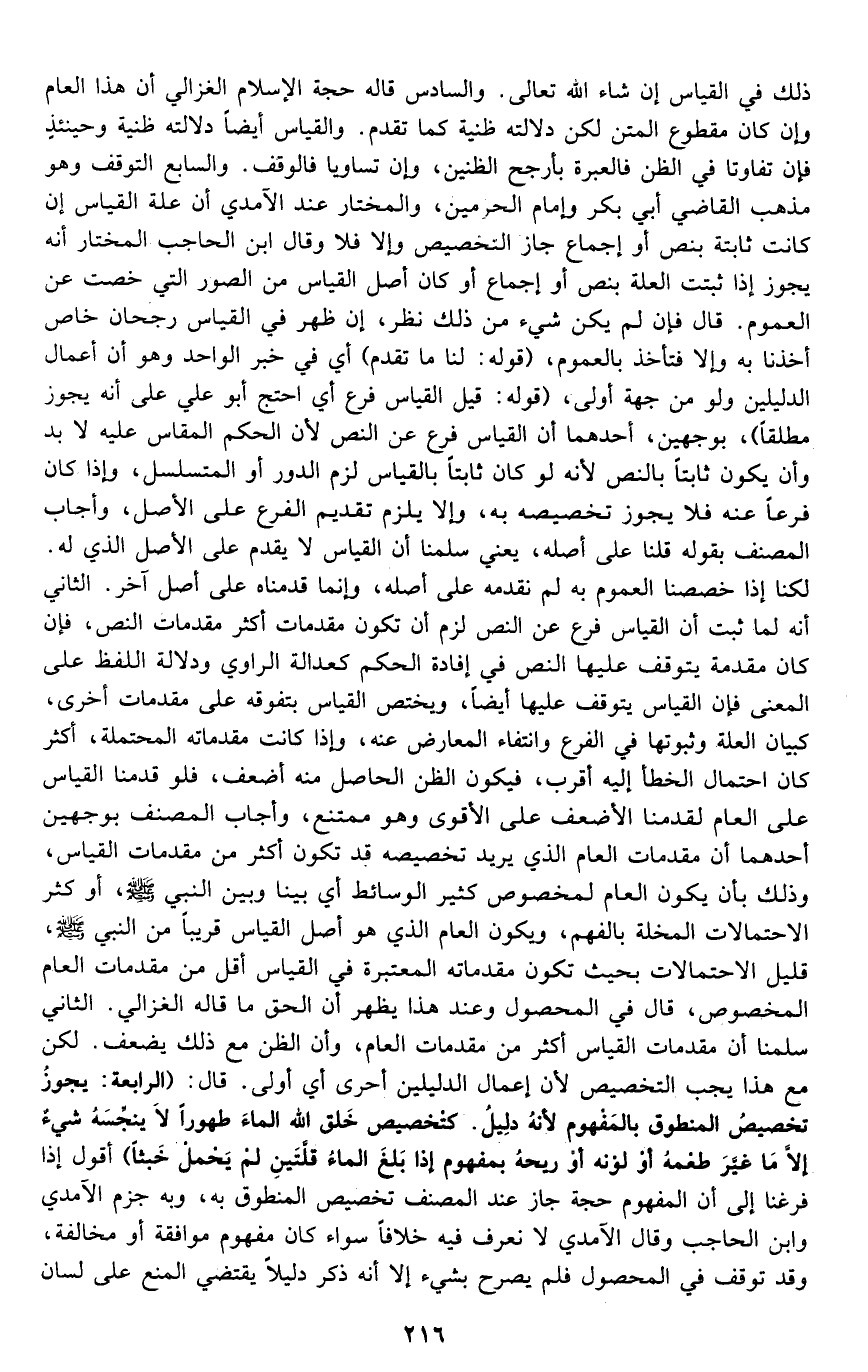 ذلك في القياس إن شاء الله تعالى. والسادس قاله حجة الإسلام الغزالي: أن هذا العام وإن كان مقطوع المتن لكن دلالته ظنية كما تقدم, والقياس أيضا دلالته ظنية وحينئذ فإن تفاوتا في الظن فالعبرة بأرجح الظنين، وإن تساويا فالوقف. والسابع: التوقف وهو مذهب القاضي أبي بكر وإمام الحرمين، والمختار عند الآمدي أن علة القياس إن كانت ثابتة بنص أو إجماع جاز التخصيص وإلا فلا وقال ابن الحاجب: المختار أنه يجوز إذا ثبتت العلة بنص أو إجماع أو كان أصل القياس من الصور التي خصت عن العموم. قال: فإن لم يكن شيء من ذلك نظر، إن ظهر في القياس رجحان خاص أخذنا به وإلا فنأخذ بالعموم. قوله: "لنا ما تقدم" أي: في خبر الواحد وهو أن إعمال الدليلين ولو من جهة أولى. قوله: "قيل: القياس فرع أي: احتج أبو علي على أنه يجوز مطلقا" بوجهين، أحدهما: أن القياس فرع عن النص؛ لأن الحكم المقاس عليه لا بد وأن يكون ثابتا بالنص؛ لأنه لو كان ثابتا بالقياس لزم الدور أو التسلسل، وإذا كان فرعا عنه فلا يجوز تخصيصه به، وإلا يلزم تقديم الفرع على الأصل، وأجاب المصنف بقوله: قلنا على أصله، يعني: سلمنا أن القياس لا يقدم على الأصل الذي له, لكنا إذا خصصنا العموم به لم نقدمه على أصله، وإنما قدمناه على أصل آخر. الثاني: أنه لما ثبت أن القياس فرع عن النص لزم أن تكون مقدماته أكثر مقدمات النص، فإن كانت مقدمة يتوقف عليها النص في إفادة الحكم كعدالة الراوي، ودلالة اللفظ على المعنى فإن القياس يتوقف عليها أيضا، ويختص القياس بتفوقه على مقدمات أخرى، كبيان العلة وثبوتها في الفرع وانتفاء المعارض عنه، وإذا كانت مقدماته المحتملة أكثر, كان احتمال الخطأ إليه أقرب، فيكون الظن الحاصل منه أضعف، فلو قدمنا القياس على العام لقدمنا الأضعف على الأقوى وهو ممتنع، وأجاب المصنف بوجهين أحدهما: أن مقدمات العام الذي يريد تخصيصه قد تكون أكثر من مقدمات القياس، وذلك بأن يكون العام لمخصوص كثير الوسائط أي: بيننا وبين النبي صلى الله عليه وسلم، أو كثير الاحتمالات المخلة بالفهم، ويكون العام الذي هو أصل القياس قريبا من النبي صلى الله عليه وسلم، قليل الاحتمالات بحيث تكون مقدماته المعتبرة في القياس أقل من مقدمات العام المخصوص، قال في المحصول: وعند هذا يظهر أن الحق ما قاله الغزالي. الثاني: سلمنا أن مقدمات القياس أكثر من مقدمات العام، وأن الظن مع ذلك يضعف, لكن مع هذا يجب التخصيص لأن إعمال الدليلين أحرى أي: أولى. قال: "الرابعة: يجوز تخصيص المنطوق بالمفهوم لأنه دليل, كتخصيص "خلق الله الماء طهورا, لا ينجسه شيء إلا ما غير طعمه أو لونه أو ريحه" بمفهوم "وإذا بلغ الماء قلتين لم يحمل خبثا" ". أقول: إذا فرغنا إلى أن المفهوم حجة, جاز عند المصنف تخصيص المنطوق به، وبه جزم الآمدي وابن الحاجب وقال الآمدي: لا نعرف فيه خلافا سواء كان مفهوم موافقة أو مخالفة، وقد توقف في المحصول فلم يصرح بشيء إلا أنه ذكر دليلا يقتضي المنع على لسان