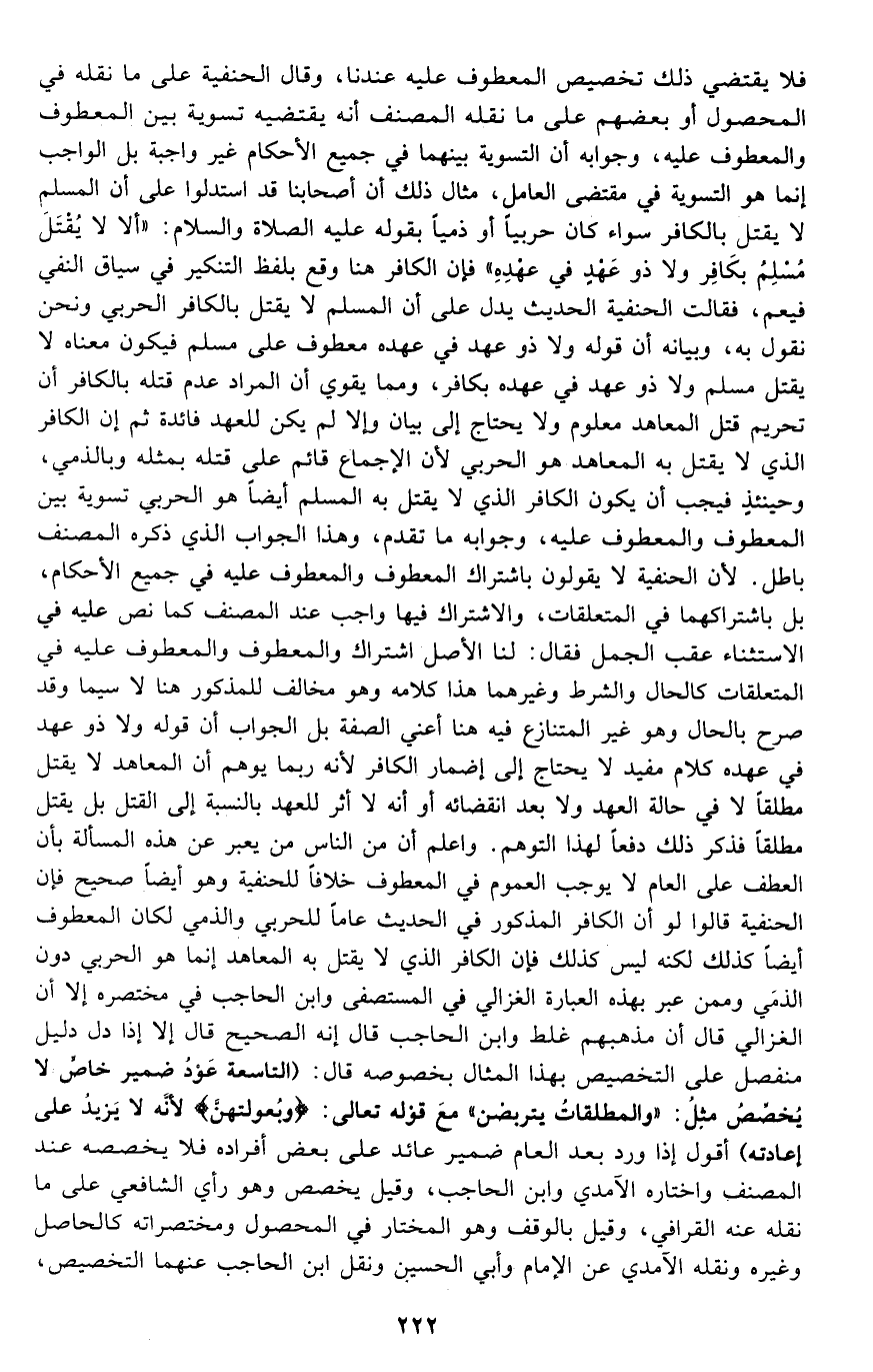 فلا يقتضي ذلك تخصيص المعطوف عليه عندنا، وقال الحنفية على ما نقله في المحصول أو بعضهم على ما نقله المصنف أنه يقتضيه تسوية بين المعطوف والمعطوف عليه، وجوابه أن التسوية بينهما في جميع الأحكام غير واجبة بل الواجب إنما هو التسوية في مقتضى العامل، مثال ذلك أن أصحابنا قد استدلوا على أن المسلم لا يقتل بالكافر سواء كان حربيا أو ذميا بقوله عليه الصلاة السلام: "ألا لا يقتل مسلم بكافر, ولا ذو عهد في عهده" فإن الكافر هنا وقع بلفظ التنكير في سياق النفي فيعم، فقالت الحنفية: الحديث يدل على أن المسلم لا يقتل بالكافر الحربي ونحن نقول به، وبيانه أن قوله: "ولا ذو عهد في عهده" معطوف على "مسلم" فيكون معناه: لا يقتل مسلم ولا ذو عهد في عهده بكافر، ومما يقوي أن المراد عدم قتله بالكافر أن تحريم قتل المعاهد معلوم ولا يحتاج إلى بيان وإلا لم يكن للعهد فائدة ثم إن الكافر الذي لا يقتل به المعاهد هو الحربي؛ لأن الإجماع قائم على قتله بمثله وبالذمي, وحينئذ فيجب أن يكون الكافر الذي لا يقتل به المسلم أيضا هو الحربي تسوية بين المعطوف والمعطوف عليه، وجوابه ما تقدم، وهذا الجواب الذي ذكره المصنف باطل؛ لأن الحنفية لا يقولون باشتراك المعطوف والمعطوف عليه في جميع الأحكام، بل باشتراكهما في المتعلقات، والاشتراك فيها واجب عند المصنف كما نص عليه في الاستثناء عقب الجمل فقال: لنا الأصل اشتراك المعطوف والمعطوف عليه في المتعلقات كالحال والشرط وغيرهما هذا كلامه, وهو مخالف للمذكور هنا لا سيما وقد صرح بالحال وهو غير المتنازع فيه هنا, أعني الصفة, بل الجواب أن قوله: "ولا ذو عهد في عهده" كلام مفيد لا يحتاج إلى إضمار الكافر؛ لأنه ربما يوهم أن المعاهد لا يقتل مطلقا فذكر ذلك دفعا لهذا التوهم. واعلم أن من الناس من يعبر عن هذه المسألة بأن العطف على العام لا يوجب العموم في المعطوف خلافا للحنفية, وهو أيضا صحيح فإن الحنفية قالوا: لو أن الكافر المذكور في الحديث عام للحربي والذمي, لكان المعطوف أيضا كذلك لكنه ليس كذلك, فإن الكافر الذي لا يقتل به المعاهد إنما هو الحربي دون الذمي, وممن عبر بهذه العبارة الغزالي في المستصفى وابن الحاجب في مختصره إلا أن الغزالي قال: إن مذهبهم غلط وابن الحاجب قال: إنه الصحيح قال: إلا إذا دل دليل منفصل على التخصيص بهذا المثال بخصوصه. قال: "التاسعة: عود ضمير خاص لا يخصص مثل: {وَالْمُطَلَّقَاتُ يَتَرَبَّصْنَ} مع قوله تعالى: {وَبُعُولَتُهُنَّ} لأنه لا يزيد على إعادته". أقول: إذا ورد بعد العام ضمير عائد على بعض أفراده فلا يخصصه عند المصنف, واختاره الآمدي وابن الحاجب، وقيل: يخصص وهو رأي الشافعي على ما نقله عنه القرافي، وقيل بالوقف وهو المختار في المحصول ومختصراته كالحاصل وغيره, ونقله الآمدي عن الإمام وأبي الحسين ونقل ابن الحاجب عنهما التخصيص،