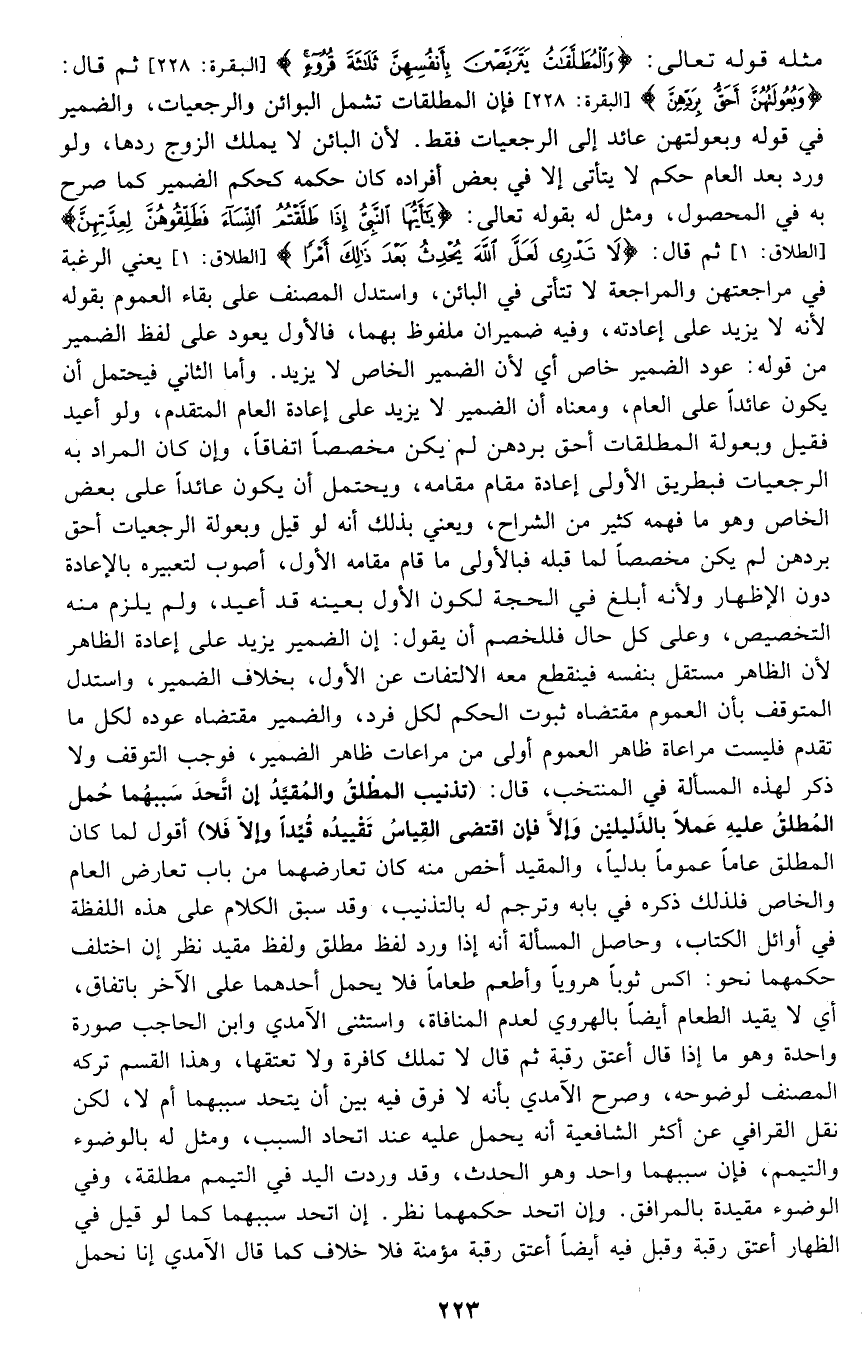 مثله قوله تعالى: {وَالْمُطَلَّقَاتُ يَتَرَبَّصْنَ بِأَنْفُسِهِنَّ ثَلاثَةَ قُرُوءٍ} [البقرة: 228] ثم قال: {وَبُعُولَتُهُنَّ أَحَقُّ بِرَدِّهِنَّ} [البقرة: 228] فإن المطلقات يشملن البوائن والرجعيات، والضمير في قوله: {وَبُعُولَتُهُنَّ} عائد على الرجعيات فقط؛ لأن البائن لا يملك الزوج ردها، ولو ورد بعد العام حكم لا يتأتى إلا في بعض أفراده كان حكمه كحكم الضمير كما صرح به في المحصول، ومثل له بقوله تعالى: {يَا أَيُّهَا النَّبِيُّ إِذَا طَلَّقْتُمُ النِّسَاءَ فَطَلِّقُوهُنَّ لِعِدَّتِهِنَّ} [الطلاق: 1] ثم قال: {لَا تَدْرِي لَعَلَّ اللَّهَ يُحْدِثُ بَعْدَ ذَلِكَ أَمْرًا} [الطلاق: 1] يعني الرغبة في مراجعتهن والمراجعة لا تتأتى في البائن، واستدل المصنف على بقاء العموم بقوله؛ لأنه لا يزيد على إعادته، وفيه ضميران ملفوظ بهما، فالأول يعود على لفظ الضمير من قوله: عود الضمير خاص أي: لأن الضمير الخاص لا يزيد, وأما الثاني فيحتمل أن يكون عائدا على العام، ومعناه أن الضمير لا يزيد على إعادة العام المتقدم، ولو أعيد فقيل: وبعولة المطلقات أحق بردهن لم يكن مخصصا اتفاقا، وإن كان المراد به الرجعيات فبطريق الأولى إعادة ما قام مقامه، ويحتمل أن يكون عائدا على بعض الخاص وهو ما فهمه كثير من الشراح، ويعني بذلك أنه لو قيل: وبعولة الرجعيات أحق بردهن لم يكن مخصصا لما قبله, فبالأولى ما قام مقامه الأول، أصوب لتعبيره بالإعادة دون الإظهار, ولأنه أبلغ في الحجة لكون الأول بعينه قد أعيد، ولم يلزم منه التخصيص، وعلى كل حال فللخصم أن يقول: إن الضمير يزيد على إعادة الظاهر؛ لأن الظاهر مستقل بنفسه فينقطع معه الالتفات عن الأول بخلاف الضمير، واستدل المتوقف بأن العموم مقتضاه ثبوت الحكم لكل فرد، والضمير مقتضاه عوده لكل ما تقدم فليست مراعاة ظاهر العموم أولى من مراعاة ظاهر الضمير، فوجب التوقف ولا ذكر لهذه المسألة في المنتخب. قال: "تذنيب: المطلق والمقيد إن اتحد سببهما حمل المطلق عليه عملا بالدليلين, وإلا فإن اقتضى القياس تقييده قيدا وإلا فلا". أقول: لما كان المطلق عاما عموما بدليا، والمقيد أخص منه كان تعارضهما من باب تعارض العام والخاص فلذلك ذكره في بابه وترجم له بالتذنيب, وقد سبق الكلام على هذه اللفظة في أوائل الكتاب، وحاصل المسألة أنه إذا ورد لفظ مطلق ولفظ مقيد نظر إن اختلف حكمهما نحو: اكس ثوبا هرويا وأطعم طعاما, فلا يحمل أحدهما على الآخر باتفاق, أي: لا يقيد الطعام أيضا بالهروي لعدم المنافاة، واستثنى الآمدي وابن الحاجب صورة واحدة وهو ما إذا قال: أعتق رقبة ثم قال: لا تملك كافرة ولا تعتقها، وهذا القسم تركه المصنف لوضوحه، وصرح الآمدي بأنه لا فرق فيه بين أن يتحد سببهما أم لا، لكن نقل القرافي عن أكثر الشافعية أنه يحمل عليه عند اتحاد السبب، ومثل له بالوضوء والتيمم، فإن سببهما واحد وهو الحدث، وقد وردت اليد في التيمم مطلقة، وفي الوضوء مقيدة بالمرافق, وإن اتحد حكمهما نظر, إن اتحد سببهما كما لو قيل في الظهار: أعتق رقبة وقيل فيه أيضا: أعتق رقبة مؤمنة, فلا خلاف كما قال الآمدي: إنا نحمل