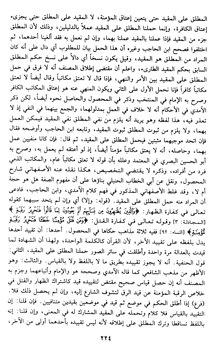 المطلق على المقيد حتى يتعين إعتاق المؤمنة، لا المقيد على المطلق حتى يجزئ إعتاق الكافرة، وإنما حملنا المطلق على المقيد عملا بالدليلين؛ وذلك لأن المطلق جزء من المقيد فإذا عملنا بالمقيد عملنا بهما، وإن لم نعمل به فقد ألغينا أحدهما، ثم اختلفوا فصحح ابن الحاجب وغيره أن هذا الحمل بيان للمطلوب أي: دال على أنه كان المراد من المطلق هو المقيد، وقيل: يكون نسخا أي: دالا على نسخ حكم المطلق السابق بحكم المقيد الطارئ، واعلم أن مقتضى إطلاق المصنف أنه لا فرق في حمل المطلق على المقيد بين الأمر والنهي، فإذا قال: لا تعتق مكاتبا وقال أيضا: لا تعتق مكاتبا كافرا, فإن نحمل الأول على الثاني ويكون المنهي عنه هو إعتاق المكاتب الكافر, وصرح به الإمام في المنتخب وذكر في المحصول والحاصل نحوه أيضا، لكن ذكر الآمدي في الأحكام أنه لا خلاف في العمل بمدلولهما، والجمع بينهما في النفي إذ لا تعذر فيه، هذا لفظه وهو يريد أنه يلزم من نفي المطلق نفي المقيد فيمكن العمل بهما، ولا يلزم من ثبوت المطلق ثبوت المقيد، وتابعه ابن الحاجب وأوضحه فقال: فإن اتحد موجبهما مثبتين فيحمل المطلق على المقيد، ثم قال: فإن كانا منفيين عمل بهما، وحاصله أنه لا يعتق مكاتبا مؤمنا أيضا، إذ لو أعتقه لم يعمل به، وصرح به أبو الحسين البصري في المعتمد وعلله بأن قوله: لا تعتق مكاتبا عام، والمكاتب الذمي فرد من أفراده، وذكره لا يقتضي التخصيص، هكذا نقله عنه الأصفهاني شارح المحصول، ونقل عن أبي الخطاب الحنبلي بناؤها على أن مفهوم الصفة هل هو حجة أم لا؟ وقد غلط الأصفهاني المذكور في فهم كلام الآمدي وابن الحاجب, فادعى أن المراد منه حمل المطلق على المقيد. قوله: "وإلا" أي: وإن لم يتحد سببهما كقوله تعالى في كفارة الظهار: {وَالَّذِينَ يُظَاهِرُونَ مِنْ نِسَائِهِمْ ثُمَّ يَعُودُونَ لِمَا قَالُوا فَتَحْرِيرُ رَقَبَةٍ} [المجادلة: 3] وقوله تعالى في كفارة القتل: {وَمَنْ قَتَلَ مُؤْمِنًا خَطًَا فَتَحْرِيرُ رَقَبَةٍ مُؤْمِنَةٍ} [النساء: 92] ففيه ثلاثة مذاهب حكاها في المحصول, أحدها: أن تقييد أحدها يدل بلفظه على تقييد الآخر؛ لأن القرآن كالكلمة الواحدة، ولهذا فإن الشهادة لما قيدت بالعدالة مرة احدة وأطلقت في سائر الصور حملنا المطلق على المقيد. الثاني قول الحنفية: أنه لا يجوز تقييده بطريق ما لا باللفظ ولا بالقياس. الثالث وهو الأظهر من مذهب الشافعي كما قاله الآمدي وصححه هو والإمام وأتباعهما وجزم به المصنف: أنه إن حصل قياس صحيح مقتضٍ لتقييده قيد كاشتراك الظهار والقتل في خلاص الرقبة المؤمنة عن قيد الرق لتشوف الشارع إليه، وإن لم يحصل ذلك فلا. "فرع": إذا أطلق الحكم في موضع ثم قيد في موضعين بقيدين متنافيين, فإن قلنا: إن التقييد بالقياس فلا كلام وتحمله على المقيد المشارك له في المعنى، وإن قلنا: إنه باللفظ تساقطا وترك المطلق على إطلاقه؛ لأنه ليس تقييده بأحدهما أولى من الآخر,