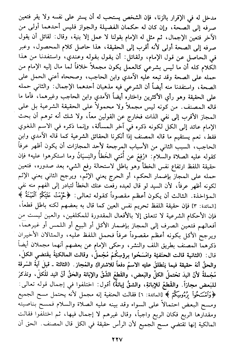 مدخل له في الإقرار بالزنا، فإن الشخص يستحب له أن يستر على نفسه ولا يقر, فتعين صرفه إلى الصحة, وإن كان له حكمان: الفضيلة والجواز, فليس أحدهما أولى من الآخر فتعين الإجمال، ثم مثل له الإمام بقولنا: لا عمل إلا بنية، وقال: لقائل أن يقول: صرفه إلى الصحة أولى لأنه أقرب إلى الحقيقة، هذا حاصل كلام المحصول, وعبر في الحاصل عن قول الإمام, ولقائل أن يقول بقوله وعندي، واستفدنا من هذا الكلام كله أن ما ليس بشرعي كالعمل يكون مجملا خلافا لما مال إليه الإمام من حمله على الصحة وقد تبعه عليه الآمدي وابن الحاجب، وصححاه أعني الحمل على الصحة، واستفدنا منه أيضا أن الشرعي فيه مذهبان أحدهما: الإجمال, والثاني: حمله على الحقيقة وهو رأي الأكثرين واختاره أيضا الآمدي وابن الحاجب وغيرهما، فأما ما قاله المصنف من كونه ليس مجملا ولا محمولا على الحقيقة الشرعية بل على المجاز الأقرب إلى نفي الذات فخارج عن القولين معا، ولا شك أنه توهم أن بحث الإمام عائد إلى الكل لكونه ذكره في آخر المسألة، وإنما ذكره في الاسم اللغوي فقط، نعم يستقيم ما قاله المصنف إذا أنكرنا الحقائق الشرعية كما قاله الآمدي وابن الحاجب. السبب الثاني من الأسباب المرجحة لأحد المجازات: أن يكون أظهر عرفا كقوله -عليه الصلاة والسلام: "رفع عن أمتي الخطأ والنسيان وما استكرهوا عليه" فإن حقيقة اللفظ ارتفاع نفس الخطأ وهو باطل لاستحالة رفع الشيء بعد صدوره، فتعين حمله على المجاز بإضمار الحكم، أو الحرج يعني الإثم ويرجح. الثاني يعني الإثم لكونه أظهر عرفا؛ لأن السيد لو قال لعبده: رفعت عنك الخطأ, لتبادر إلى الفهم منه نفي المؤاخذة. الثالث: أن يكون أعظم مقصودًا كقوله تعالى: {حُرِّمَتْ عَلَيْكُمُ الْمَيْتَةُ} [المائدة: 3] فإن حقيقة اللفظ تحريم نفس العين كما قال به بعضهم لكنه باطل قطعا، فإن الأحكام الشرعية لا تتعلق إلا بالأفعال المقدورة للمكلفين، والعين ليست من أفعالهم فتعين الصرف إلى المجاز بإضمار الأكل أو البيع أو اللمس أو غيرها، ويرجح الأكل بكونه أعظم مقصودا عرفا فحمل اللفظ عليه، والمثالان الأخيران ذكرهما المصنف بطريق اللف والنشر، وحكى الإمام عن بعضهم أنهما مجملان أيضا. قال: "الثانية: قالت الحنفية: {وَامْسَحُوا بِرُؤُوسِكُمْ} مجمل، وقالت المالكية: يقتضي الكل، والحق أنه حقيقة فيما ينطلق عليه الاسم دفعا للاشتراك والمجاز. الثالثة: قيل: آية السرقة مجملة؛ لأن اليد تحتمل الكل والبعض، والقطع الشق والإبانة, والحق أن اليد للكل وتذكر للبعض مجازا، والقطع للإبانة، والشق إبانة". أقول: اختلفوا في إجمال قوله تعالى: {وَامْسَحُوا بِرُؤُوسِكُمْ} [المائدة: 6] فقالت الحنفية: إنه مجمل؛ لأنه يحتمل مسح الجميع ومسح البعض احتمالا على السواء, وقد بينه عليه الصلاة والسلام فمسح بناصيته ومقدارها الربع فكان الربع واجبا، وقال غيرهم: لا إجمال فيها، ثم اختلفوا فقالت المالكية: إنها تقتضي مسح الجميع؛ لأن الرأس حقيقة في الكل قال المصنف: الحق أن