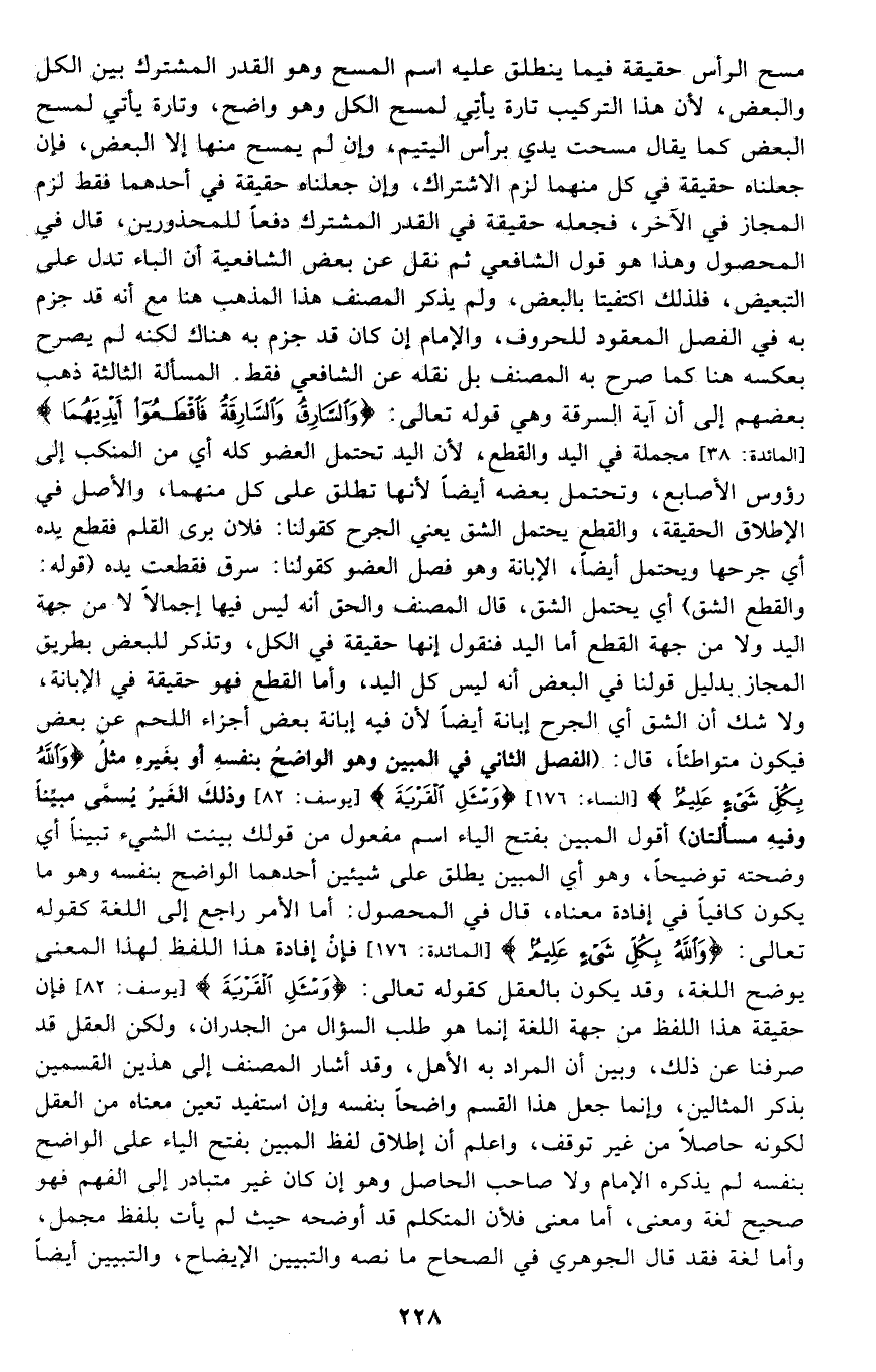 مسح الرأس حقيقة فيما ينطلق عليه اسم المسح, وهو القدر المشترك بين الكل والبعض؛ لأن هذا التركيب تارة يأتي لمسح الكل وهو واضح, وتارة يأتي لمسح البعض كما يقال: مسحت يدي برأس اليتيم، وإن لم يمسح منها إلا البعض، فإن جعلناه حقيقة في كل منهما لزم الاشتراك، وإن جعلناه حقيقة في أحدهما فقد لزم المجاز في الآخر، فجعله حقيقة في القدر المشترك دفعا للمحذورين، قال في المحصول: وهذا هو قول الشافعي ثم نقل عن بعض الشافعية أن الباء تدل على التبعيض، فلذلك اكتفينا بالبعض، ولم يذكر المصنف هذا المذهب هنا مع أنه قد جزم به في الفصل المعقود للحروف، والإمام إن كان قد جزم به هناك لكنه لم يصرح بعكسه هنا كما صرح به المصنف بل نقله عن الشافعي فقط. المسألة الثالثة: ذهب بعضهم إلى أن آية السرقة وهي قوله تعالى: {وَالسَّارِقُ وَالسَّارِقَةُ فَاقْطَعُوا أَيْدِيَهُمَا} [المائدة: 38] مجملة في اليد والقطع؛ لأن اليد تحتمل العضو كله أي: من المنكب إلى رءوس الأصابع, وتحتمل بعضه أيضا لأنها تطلق على كل منهما، والأصل في الإطلاق الحقيقة، والقطع يحتمل الشق يعني الجرح كقولنا: فلان برى القلم فقطع يده أي: جرحها ويحتمل أيضا الإبانة وهو فصل العضو كقولنا: سرق فقطعت يده. قوله: "القطع الشق" أي: يحتمل الشق, قال المصنف: والحق أنه ليس فيها إجمال لا من جهة اليد ولا من جهة القطع أما اليد فنقول: إنها حقيقة في الكل وتذكر للبعض بطريق المجاز بدليل قولنا في البعض: إنه ليس كل اليد، وأما القطع فهو حقيقة في الإبانة، ولا شك أن الشق أي: الجرح إبانة أيضا؛ لأن فيه إبانة بعض أجزاء اللحم عن بعض فيكون متواطئا.