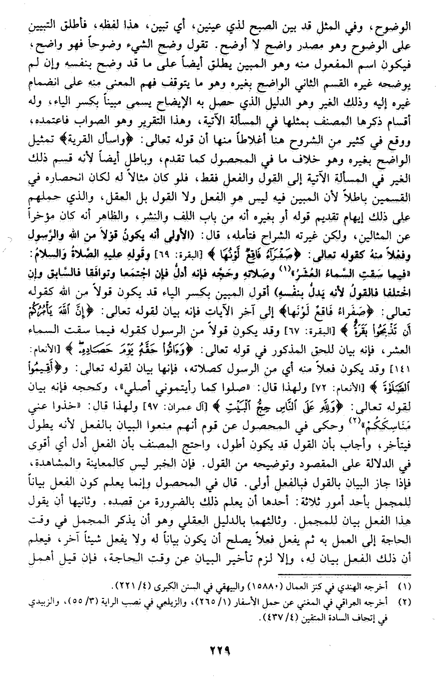 الوضوح، وفي المثل: "قد بين الصبح لذي عينين" أي: تبين، هذا لفظه، فأطلق التبيين على الوضوح وهو مصدر وضح لا أوضح, تقول: وضح الشيء وضوحا فهو واضح، فيكون اسم المفعول منه وهو المبين يطلق أيضا على ما قد وضح بنفسه وإن لم يوضحه غيره. القسم الثاني: الواضح بغيره وهو ما يتوقف فهم المعنى منه على انضمام غيره إليه وذلك الغير وهو الدليل الذي حصل به الإيضاح يسمى مبينا بكسر الياء، وله أقسام ذكرها المصنف بمثلها في المسألة الآتية، وهذا التقرير هو الصواب فاعتمده، ووقع في كثير من الشروح هنا أغلاط منها أن قوله تعالى: {وَاسْأَلِ الْقَرْيَةَ} تمثيل الواضح بغيره وهو خلاف ما في المحصول كما تقدم, وباطل أيضا لأنه قسم ذلك الغير في المسألة الآتية إلى القول والفعل فقط, فلو كان مثالا له لكان انحصاره في القسمين باطلا؛ لأن المبين فيه ليس هو الفعل ولا القول بل العقل، والذي حملهم على ذلك إيهام تقديم قوله: أو بغيره أنه من باب اللف والنشر، والظاهر أن كان مؤخرا عن المثالين، ولكن غيرته الشراح فتأمله. قال: "الأولى أن يكون قولا من الله والرسول, وفعلا منه كقوله تعالى: {صَفْرَاءُ فَاقِعٌ لَوْنُهَا} [البقرة: 69] وقوله عليه الصلاة والسلام: "فيما سقت السماء العشر" 1 وصلاته وحجه, فإنه أدل فإن اجتمعا وتوافقا فالسابق, وإن اختلفا فالقول؛ لأنه يدل بنفسه". أقول: المبين -بكسر الياء- قد يكون قولا من الله كقوله تعالى: {صَفْرَاءُ فَاقِعٌ لَوْنُهَا} إلى آخر الآيات, فإنه بيان لقوله تعالى: {إِنَّ اللَّهَ يَأْمُرُكُمْ أَنْ تَذْبَحُوا بَقَرَةً} [البقرة: 67] وقد يكون قولا من الرسول كقوله: "فيما سقت السماء العشر" فإنه بيان للحق المذكور في قوله تعالى: {وَآتُوا حَقَّهُ يَوْمَ حَصَادِهِ} [الأنعام: 141] وقد يكون فعلا منه أي من الرسول كصلاته، فإنها بيان لقوله تعالى: {وَأَقِيمُوا الصَّلاةَ} [الأنعام: 72] ولهذا قال: "صلوا كما رأيتموني أصلي" وكحجه فإنه بيان لقوله تعالى: {وَلِلَّهِ عَلَى النَّاسِ حِجُّ الْبَيْتِ} [آل عمران: 97] ولهذا قال: "خذوا عني مناسككم" 2 وحكى في المحصول عن قوم أنهم منعوا البيان بالفعل؛ لأنه يطول فيتأخر, وأجاب بأن القول قد يكون أطول, واحتج المصنف بأن الفعل أدل أي: أقوى في الدلالة على المقصود وتوضيحه من القول, فإن الخبر ليس كالمعاينة والمشاهدة، فإذا جاز البيان بالقول فبالفعل أولى. قال في المحصول: وإنما يعلم كون الفعل بيانا للمجمل بأحد أمور ثلاثة, أحدها: أن يعلم ذلك بالضرورة من قصده. وثانيها: أن يقول: هذا الفعل بيان للمجمل. وثالثها بالدليل العقلي: وهو أن يذكر المجمل في وقت الحاجة إلى العمل به, ثم يفعل فعلا يصلح أن يكون بيانا له ولا يفعل شيئا آخر، فيعلم أن ذلك الفعل بيان له، وإلا لزم تأخير البيان عن وقت الحاجة، فإن قيل: أهمل