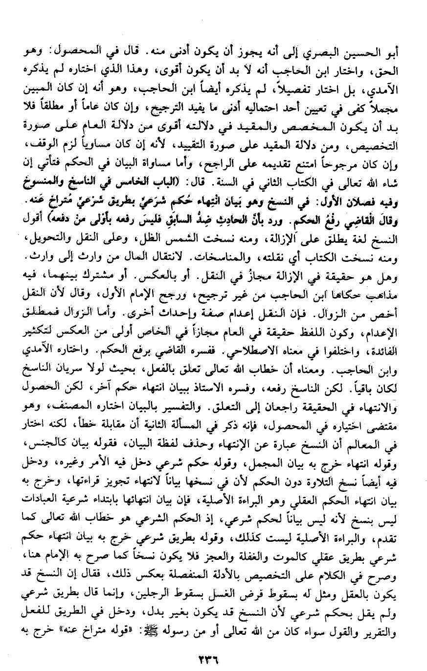 قال: "الباب الخامس: في الناسخ والمنسوخ وفيه فصلان, الأول: في النسخ وهو بيان انتهاء حكم شرعي بطريق شرعي متراخ عنه, وقال القاضي: رفع الحكم ورد بأن الحادث ضد السابق فليس رفعه بأولى من دفعه". أقول: النسخ لغة يطلق على الإزالة، ومنه: نسخت الشمس الظل، وعلى النقل والتحويل، ومنه: نسخت الكتاب أي: نقلته، والمناسخات لانتقال المال من وارث إلى وارث. وهل هو حقيقة في الإزالة مجاز في النقل أو بالعكس أو مشترك بينهما؟ فيه مذاهب حكاها ابن الحاجب من غير ترجيح، ورجح الإمام الأول، وقال: لأن النقل أخص من الزوال, فإن النقل إعدام صفة وإحداث أخرى. وأما الزوال فمطلق الإعدام، وكون اللفظ حقيقة في العام مجازا في الخاص أولى من العكس لتكثير الفائدة، واختلفوا في معناه الاصطلاحي ففسره القاضي برفع الحكم, واختاره الآمدي وابن الحاجب. ومعناه أن خطاب الله تعالى تعلق بالفعل, بحيث لولا سريان الناسخ لكان باقيا، لكن الناسخ رفعه، وفسره الأستاذ ببيان انتهاء حكم آخر, لكن الحصول والانتهاء في الحقيقة راجعان إلى التعلق. والتفسير بالبيان اختاره المصنف, وهو مقتضى اختياره في المحصول، فإنه ذكر في المسألة الثانية أن مقابله خطأ, لكنه اختار في المعالم أن النسخ عبارة عن الانتهاء وحذف لفظة البيان، فقوله: بيان كالجنس، وقوله: انتهاء خرج به بيان المجمل، وقوله: حكم شرعي دخل فيه الأمر وغيره، ودخل فيه أيضا نسخ التلاوة دون الحكم؛ لأن في نسخها بيانا لانتهاء تجويز قراءتها, وخرج به بيان انتهاء الحكم العقلي وهو البراءة الأصلية، فإن بيان انتهائها بابتداء شرعية العبادات ليس بنسخ لأنه ليس بيانا لحكم شرعي، إذ الحكم الشرعي هو خطاب الله تعالى كما تقدم، والبراءة الأصلية ليست كذلك، وقوله: بطريق شرعي خرج به بيان انتهاء حكم شرعي بطريق عقلي كالموت والغفلة والعجز فلا يكون نسخا كما صرح به الإمام هنا، وصرح في الكلام على التخصيص بالأدلة المنفصلة بعكس ذلك، فقال: إن النسخ قد يكون بالعقل ومثل له بسقوط فرض الغسل بسقوط الرجلين، وإنما قال بطريق شرعي ولم يقل بحكم شرعي؛ لأن النسخ قد يكون بغير بدل، ودخل في الطريق للفعل والتقرير والقول سواء كان من الله تعالى أو من رسوله صلى الله عليه وسلم. قوله: "متراخ عنه" خرج به