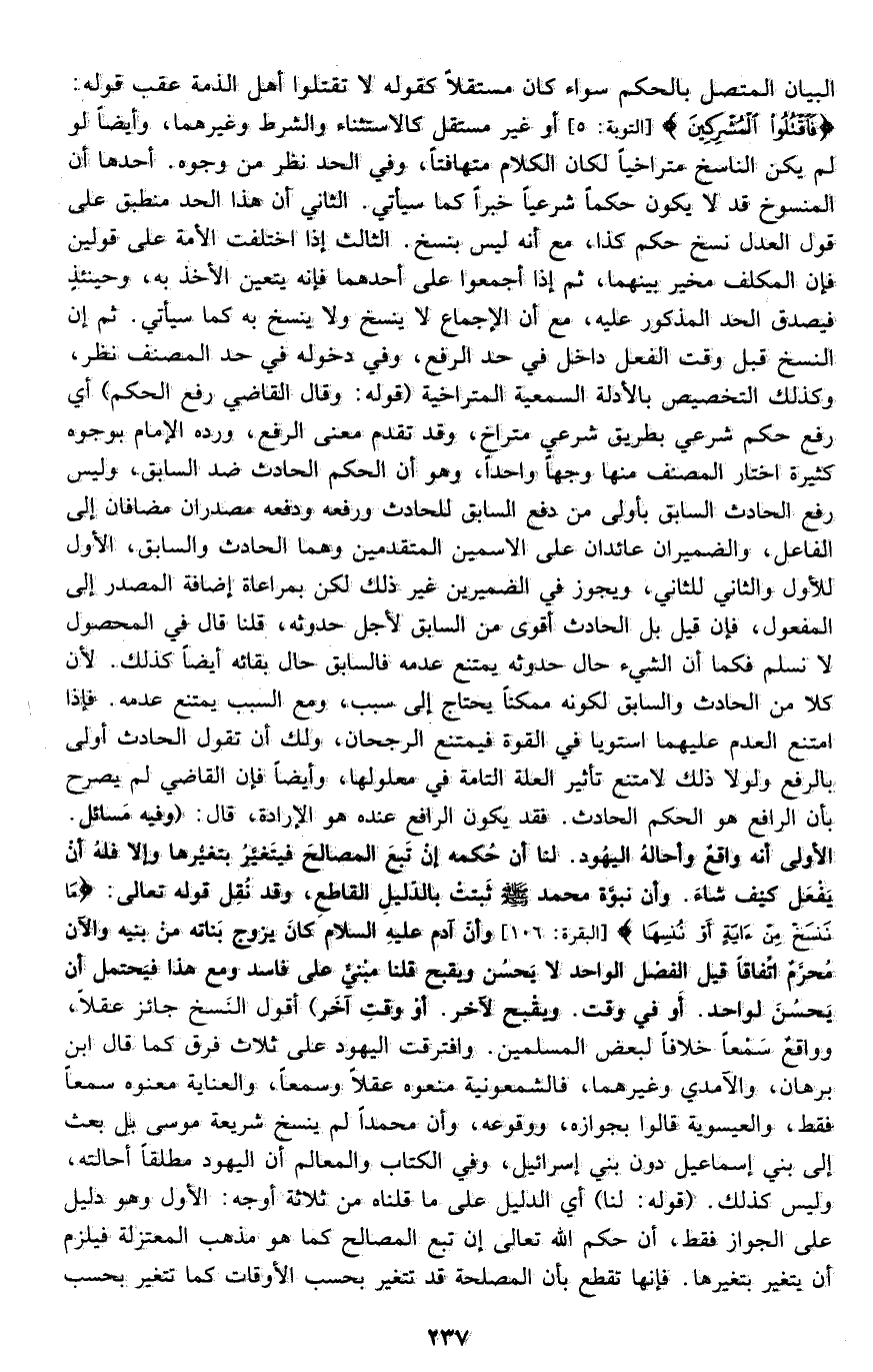 البيان المتصل بالحكم سواء كان مستقلا كقوله: "لا تقتلوا أهل الذمة" عقب قوله: {فَاقْتُلُوا الْمُشْرِكِين} [التوبة: 5] أو غير مستقل كالاستثناء والشرط وغيرهما، وأيضا لو لم يكن الناسخ متراخيا لكان الكلام متهافتا، وفي الحد نظر من وجوه أحدها: أن المنسوخ قد لا يكون حكما شرعيا خبرا كما سياتي. الثاني: أن هذا الحد منطبق على قول العدل: نسخ حكم كذا، مع أنه ليس بنسخ. الثالث: إذا اختلفت الأمة على قولين, فإن المكلف مخير بينهما، ثم إذا أجمعوا على أحدهما فإنه يتعين الأخذ به، وحينئذ فيصدق الحد المذكور عليه، مع أن الإجماع لا ينسخ ولا ينسخ به كما سيأتي. ثم إن النسخ قبل وقت الفعل داخل في حد الرفع, وفي دخوله في حد المصنف نظر، وكذلك التخصيص بالأدلة السمعية المتراخية. قوله: "وقال القاضي: رفع الحكم" أي: رفع حكم شرعي بطريق شرعي متراخ، وقد تقدم معنى الرفع، ورده الإمام بوجوه كثيرة اختار المصنف منها وجها واحدا، وهو أن الحكم الحادث ضد السابق، وليس رفع الحادث السابق بأولى من دفع السابق للحادث, ورفعه ودفعه مصدران مضافان إلى الفاعل، والضميران عائدان على الاسمين المتقدمين وهما الحادث والسابق, الأول للأول والثاني للثاني، ويجوز في الضميرين غير ذلك لكن بمراعاة إضافة المصدر إلى المفعول فإن قيل: بل الحادث أقوى من السابق لأجل حدوثه، قلنا: قال في المحصول: لا نسلم فكما أن الشيء حال حدوثه يمتنع عدمه فالسابق حال بقائه أيضا كذلك؛ لأن كلا من الحادث والسابق لكونه ممكنا يحتاج إلى سبب, ومع السبب يمتنع عدمه, فإذا امتنع العدم عليهما استويا في القوة فيمتنع الرجحان، ولك أن تقول: الحادث أولى بالرفع ولولا ذلك لامتنع تأثير العلة التامة في معلولها، وأيضا فإن القاضي لم يصرح بأن الرافع هو الحكم الحادث, فقد يكون الرافع عنده هو الإرادة. قال: "وفيه مسائل؛ الأولى: أنه واقع وأحاله اليهود. لنا أن حكمه إن تبع المصالح فيتغير بتغيرها وإلا فله أن يفعل كيف شاء, وأن نبوة محمد -صلى الله عليه وسلم- ثبتت بالدليل القاطع، وقد نقل قوله تعالى: {مَا نَنْسَخْ مِنْ آيَةٍ أَوْ نُنْسِهَا} [البقرة: 106] وأن آدم عليه السلام كان يزوج بناته من بنيه والآن محرم اتفاقا قيل: الفصل الواحد لا يحسن ويقبح قلنا: منبي على فاسد ومع هذا فيحتمل أن يحسن لواحد أو في وقت, ويقبح لآخر أو وقت آخر". أقول: النسخ جائز عقلا، وواقع سمعا خلافا لبعض المسلمين, وافترقت اليهود على ثلاث فرق كما قال ابن برهان والآمدي وغيرهما، فالشمعونية منعوه عقلا وسمعا، والعناية منعوه سمعا فقط، والعيسوية قالوا بجوازه ووقوعه، وأن محمدا لم ينسخ شريعة موسى بل بعث إلى بني إسماعيل دون بني إسرائيل، وفي الكتاب والمعالم أن اليهود مطلقا أحالته، وليس كذلك. قوله: "لنا" أي: الدليل على ما قلناه من ثلاثة أوجه, الأول وهو دليل على الجواز فقط: أن حكم الله تعالى إن تبع المصالح كما هو مذهب المعتزلة فيلزم أن يتغير بتغيرها, فإنها تقطع بأن المصلحة قد تتغير بحسب الأوقات كما تتغير بحسب