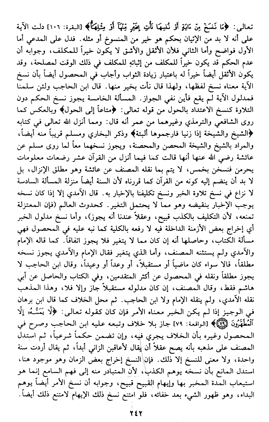 تعالى: {مَا نَنْسَخْ مِنْ آيَةٍ أَوْ نُنْسِهَا نَأْتِ بِخَيْرٍ مِنْهَا أَوْ مِثْلِهَا} [البقرة: 106] ودلت الآية على أنه لا بد من الإتيان بحكم هو خير من المنسوخ أو مثله، فدل على المدعي؛ أما الأول فواضح وأما الثاني فلأن الأثقل والأشق لا يكون خيرا للمكلف، وجوابه أن عدم الحكم قد يكون خيرا للمكلف من إثباته للمكلف في ذلك الوقت لمصلحة، وقد يكون الأثقل أيضا خيرا له باعتبار زيادة الثواب وأجاب في المحصول أيضا بأن نسخ الآية معناه نسخ لفظها؛ ولهذا قال: {نَأْتِ بِخَيْرٍ مِنْهَا} . وقال ابن الحاجب: ولئن سلمنا فمدلول الآية لم يقع, فأين نفي الجواز؟ المسألة الخامسة: يجوز نسخ الحكم دون التلاوة كنسخ الاعتداد بالحول من قوله تعالى: {مَتَاعًا إِلَى الْحَوْلِ} وبالعكس كما روى الشافعي والترمذي وغيرهما عن عمر أنه قال: ومما أنزل الله تعالى في كتابه: "الشيخ والشيخة إذا زنيا فارجموهما البتة" وذكر البخاري ومسلم قريبا منه أيضا، والمراد بالشيخ والشيخة المحصن والمحصنة، ويجوز نسخهما معا لما روى مسلم عن عائشة -رضي الله عنها- قالت: كان فيما أنزل من القرآن عشر رضعات معلومات يحرمن فنسخن بخمس، ولا يتم بما نقله المصنف عن عائشة وهو مطلق الإنزال، بل لا بد أن ينضم إليه كونه من القرآن كما قررناه لأن السنة أيضا منزلة. المسألة السادسة: لا نزاع في نسخ تلاوة الخبر ونسخ تكليفنا بالإخبار به. قال الآمدي: إلا إذا كان نسخه يوجب الإخبار بنقيضه وهو مما لا يحتمل التغير, كحدوث العالم "فإن المعتزلة تمنعه؛ لأن التكليف بالكذب قبيح، وعقلا عندنا أنه يجوز". وأما نسخ مدلول الخبر أي: إخراج بعض الأزمنة الداخلة فيه لا رفعه بالكلية كما نبه عليه في المحصول, فهو مسألة الكتاب، وحاصلها أنه إن كان مما لا يتغير فلا يجوز اتفاقا كما قاله الإمام والآمدي ولم يستثنه المصنف، وأما الذي يتغير فقال الإمام والآمدي: يجوز نسخه مطلقا، قالا: سواء كان ماضيا أو مستقبلا، أو وعدا أو وعيدا، وقال ابن الحاجب: لا يجوز مطلقا ونقله في المحصول عن أكثر المتقدمين، وفي الكتاب والحاصل عن أبي هاشم فقط، وقال المصنف: إن كان مدلوله مستقبلا جاز وإلا فلا، وهذا المذهب نقله الآمدي ولم ينقله الإمام ولا ابن الحاجب. ثم محل الخلاف كما قال ابن برهان في الوجيز إذا لم يكن الخبر معناه الأمر, فإن كان كقوله تعالى: {لا يَمَسُّهُ إِلَّا الْمُطَهَّرُونَ} [الواقعة: 79] جاز بلا خلاف وتبعه عليه ابن الحاجب, وصرح في المحصول وغيره بأن الخلاف يجري فيه وإن تضمن حكما شرعيا، ثم استدل المصنف على مذهبه بأنه يصح عقلا أن يقال: لأعاقبن الزاني أبدا، ثم يقال: أردت سنة واحدة، ولا معنى للنسخ إلا ذلك، فإن النسخ إخراج بعض الزمان وهو موجود هنا، واستدل المانع بأن نسخه يوهم الكذب؛ لأن المتبادر منه إلى فهم السامع إنما هو استيعاب المدة المخبر بها وإيهام القبيح قبيح، وجوابه أن نسخ الأمر أيضا يوهم البداء، وهو ظهور الشيء بعد خفائه، فلو امتنع نسخ ذلك الإيهام لامتنع ذلك أيضا.