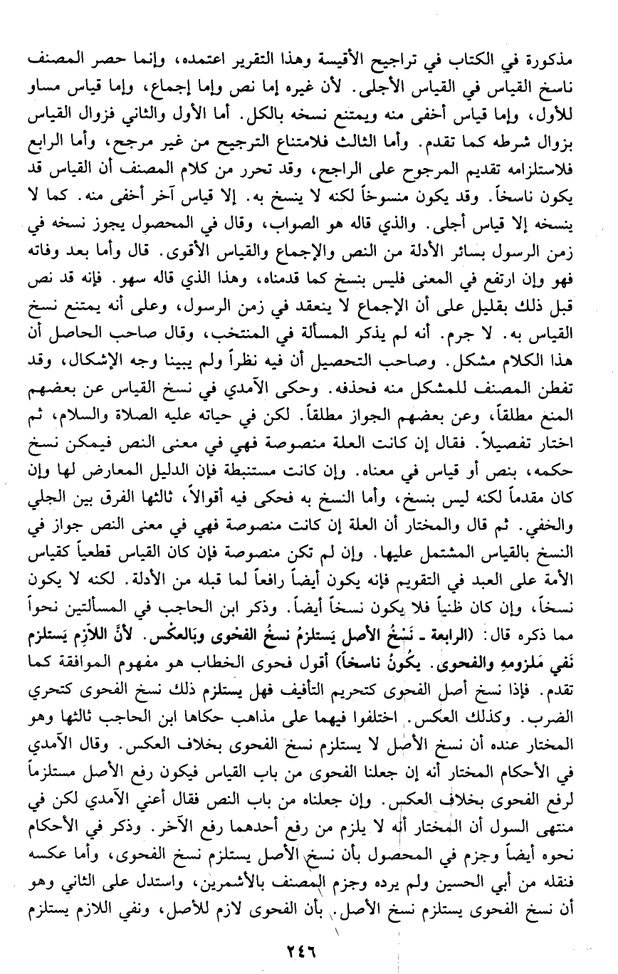 مذكورة في الكتاب في تراجيح الأقيسة وهذا التقرير اعتمده، وإنما حصر المصنف ناسخ القياس في القياس الأجلى؛ لأن غيره إما نص وإما إجماع وإما قياس مساو للأول وإما قياس أخفى منه ويمتنع نسخه بالكل. أما الأول والثاني فزوال القياس بزوال شرطه كا تقدم. وأما الثالث فلامتناع الترجيح من غير مرجح. وأما الرابع فلاستلزامه تقديم المرجوح على الراجح، وقد تحرر من كلام المصنف أن القياس قد يكون ناسخا، وقد يكون منسوخا لكنه لا ينسخ به إلا قياس آخر أخفى منه كما لا ينسخه إلا قياس أجلى. والذي قاله هو الصواب، وقال في المحصول: يجوز نسخه في زمن الرسول بسائر الأدلة من النص والإجماع والقياس الأقوى. قال: وأما بعد وفاته فهو وإن ارتفع في المعنى فليس بنسخ كما قدمناه، وهذا الذي قاله سهو؛ فإنه قد نص قبل ذلك بقليل على أن الإجماع لا ينعقد في زمن الرسول، وعلى أنه يمتنع نسخ القياس به. لا جرم أنه لم يذكر المسألة في المنتخب، وقال صاحب الحاصل: إن هذا الكلام مشكل, وصاحب التحصيل: إن فيه نظرا ولم يبينا وجه الإشكال، وقد تفطن المصنف للمشكل منه فحذفه. وحكى الآمدي في نسخ القياس عن بعضهم المنع مطلقا، وعن بعضهم الجواز مطلقا, لكن في حياته -عليه الصلاة والسلام- ثم اختار تفصيلا فقال: إن كانت العلة منصوصة فهي في معنى النص فيمكن نسخ حكمه بنص أو قياس في معناه، وإن كانت مستنبطة فإن الدليل المعارض لها وإن كان مقدما لكنه ليس بنسخ, وأما النسخ به فحكى فيه أقوالا، ثالثها: الفرق بين الجلي والخفي. ثم قال: والمختار أن العلة إن كانت منصوصة فهي في معنى النص جواز في النسخ بالقياس المشتمل عليها، وإن لم تكن منصوصة فإن كان القياس قطعيا كقياس الأمة على العبد في التقويم فإنه يكون أيضا رافعا لما قبله من الأدلة لكنه لا يكون نسخا، وإن كان ظنيا فلا يكون نسخا أيضا. وذكر ابن الحاجب في المسألتين نحوا مما ذكره. قال: "الرابعة: نسخ الأصل يستلزم نسخ الفحوى وبالعكس؛ لأن اللازم يستلزم نفي ملزومه والفحوى يكون ناسخا". أقول: فحوى الخطاب هو مفهوم الموافقة كما تقدم. فإذا نسخ أصل الفحوى كتحريم التأفيف فهل يستلزم ذلك نسخ الفحوى كتحري الضرب وكذلك العكس؟ اختلفوا فيهما على مذاهب حكاها ابن الحاجب, ثالثها وهو المختار عنده: أن نسخ الأصل لا يستلزم نسخ الفحوى بخلاف العكس. وقال الآمدي في الأحكام: المختار أنه إن جعلنا الفحوى من باب القياس فيكون رفع الأصل مستلزما لرفع الفحوى بخلاف العكس, وإن جعلناه من باب النص فقال أعني الآمدي لكن في منتهى السول أن المختار أنه لا يلزم من رفع أحدهما رفع الآخر، وذكر في الأحكام نحوه أيضا وجزم في المحصول بأن نسخ الأصل يستلزم نسخ الفحوى، وأما عكسه فنقله من أبي الحسين ولم يرده وجزم المصنف بالأشمرين، واستدل على الثاني وهو أن نسخ الفحوى يستلزم نسخ الأصل بأن الفحوى لازم للأصل، ونفي اللازم يستلزم