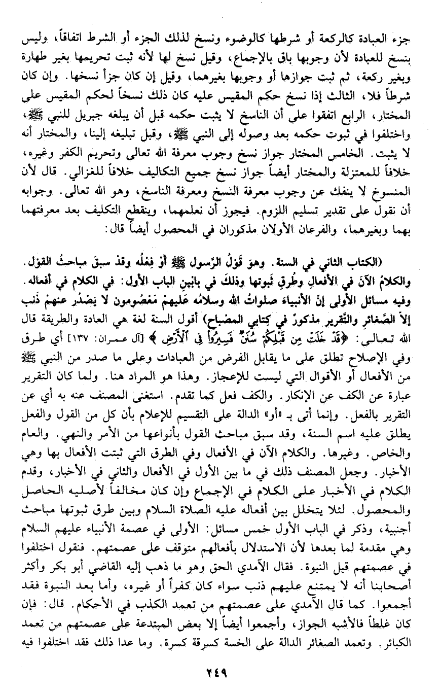 قال: "الكتاب الثاني: في السنة, وهو قول الرسول -صلى الله عليه وسلم- أو فعله وقد سبق مباحث القول, والكلام الآن في الأفعال وطرق ثبوتها وذلك في بابين, الباب الأول: في الكلام في أفعاله, وفيه مسائل الأولى: أن الأنبياء -صلوات الله وسلامه عليهم- معصومون لا يصدر عنهم ذنب إلا الصغائر, والتقرير مذكور في كتابي المصباح". أقول: السنة لغة هي العادة والطريقة قال الله تعالى: {قَدْ خَلَتْ مِنْ قَبْلِكُمْ سُنَنٌ فَسِيرُوا فِي الْأَرْضِ} [آل عمران: 137] أي: طرق, وفي الاصطلاح تطلق على ما يقابل الفرض من العبادات وعلى ما صدر من النبي صلى الله عليه وسلم من الأفعال أو الأقوال التي ليست للإعجاز وهذا هو المراد هنا. ولما كان التقرير عبارة عن الكف عن الإنكار, والكف فعل كما تقدم, استغنى المصنف عنه به أي: عن التقرير بالفعل, وإنما أتى بـ"أو" الدالة على التقسيم للإعلام بأن كلا من القول والفعل يطلق عليه اسم السنة، وقد سبق مباحث القول بأنواعها من الأمر, والنهي، والعام, والخاص, وغيرها. والكلام الآن في الأفعال وفي الطرق التي ثبتت الأفعال بها وهي الأخبار, وجعل المصنف ذلك فيما بين الأول في الأفعال والثاني في الأخبار، وقدم الكلام في الأخبار على الكلام في الإجماع وإن كان مخالفا لأصلية الحاصل والمحصول؛ لئلا يتخلل بين أفعاله عليه الصلاة والسلام وبين طرق ثبوتها مباحث أجنبية، وذكر في الباب الأول خمس مسائل, الأولى: في عصمة الأنبياء -عليهم السلام- وهي مقدمة لما بعدها؛ لأن الاستدلال بأفعالهم متوقف على عصمتهم, فنقول: اختلفوا في عصمتهم قبل النبوة فقال الآمدي: الحق وهو ما ذهب إليه القاضي أبو بكر وأكثر أصحابنا أنه لا يمتنع عليهم ذنب سواء كان كفرا أو غيره، وأما بعد النبوة فقد أجمعوا كما قال الآمدي على عصمتهم من تعمد الكذب في الأحكام. قال: فإن كان غلطا فالأشبه الجواز، وأجمعوا أيضا إلا بعض المبتدعة على عصمتهم من تعمد الكبائر, وتعمد الصغائر الدالة على الخسة كسرقة كسرة, وما عدا ذلك فقد اختلفوا فيه