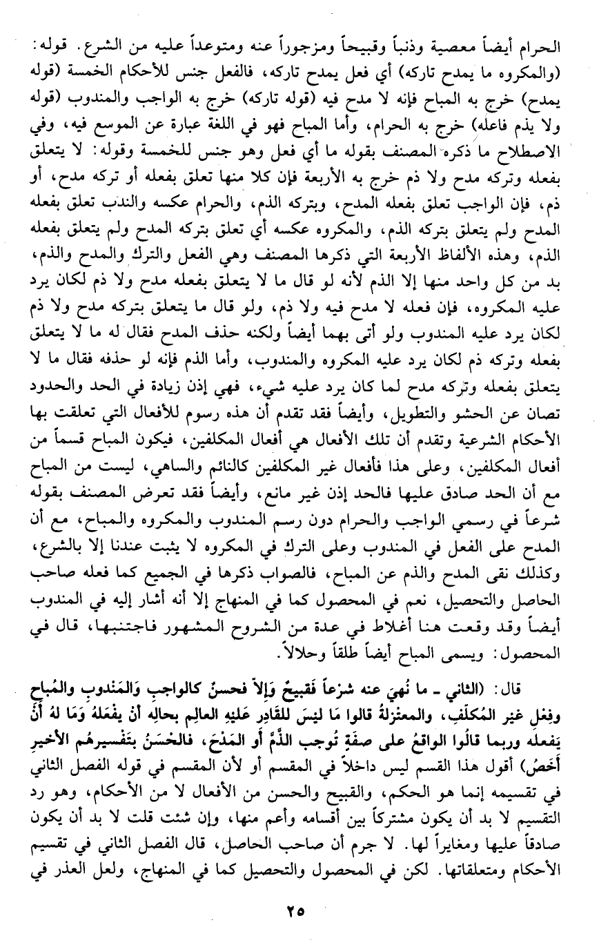 قال: "الثاني: ما نهي عنه شرعا فقبيح وإلا فحسن, كالواجب والمندوب والمباح وفعل غير المكلف، والمعتزلة قالوا: ما ليس للقادر عليه العالم بحاله أن يفعله وما له أن يفعله, وربما قالوا: الواقع على صفة توجب الذم أو المدح، فالحسن بتفسيرهم الأخير أخص" أقول: هذا القسم ليس داخلا في المقسم أو لأن المقسم في قوله: الفصل الثاني في تقسيمه إنما هو الحكم، والقبيح والحسن من الأفعال لا من الأحكام, وهو رد التقسيم لا بد أن يكون مشتركا بين أقسامه وأعم منها، وإن شئت قلت: لا بد أن يكون صادقا عليها ومغايرا لها، لا جرم أن صاحب الحاصل قال: الفصل الثاني في تقسيم الأحكام ومتعلقاتها, لكن في المحصول والتحصيل كما في المنهاج، ولعل العذر في