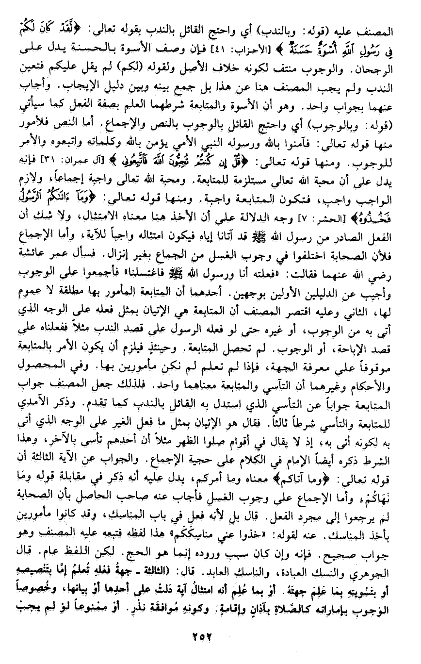المصنف عليه. قوله: "وبالندب" أي: واحتج القائل بالندب بقوله تعالى: {لَقَدْ كَانَ لَكُمْ فِي رَسُولِ اللَّهِ أُسْوَةٌ حَسَنَةٌ} [الأحزاب: 41] فإن وصف الأسوة بالحسنة يدل على الرجحان، والوجوب منتفٍ لكونه خلاف الأصل, ولقوله: {لَكُمْ} لم يقل عليكم فتعين الندب ولم يجب المصنف هنا عن هذا بل جمع بينه وبين دليل الإيجاب، وأجاب عنهما بجواب واحد, وهو أن الأسوة والمتابعة شرطهما العلم بصفة الفعل كما سيأتي. قوله: "وبالجوب" أي: واحتج القائل بالوجوب بالنص والإجماع. أما النص فلأمور منها قوله تعالى: {فَآمِنُوا بِاللَّهِ وَرَسُولِهِ النَّبِيِّ الْأُمِّيِّ الَّذِي يُؤْمِنُ بِاللَّهِ وَكَلِمَاتِهِ وَاتَّبِعُوهُ} والأمر للوجوب. ومنها قوله تعالى: {قُلْ إِنْ كُنْتُمْ تُحِبُّونَ اللَّهَ فَاتَّبِعُونِي} [آل عمران: 31] فإنه يدل على أن محبة الله تعالى مستلزمة للمتابعة، ومحبة الله تعالى واجبة إجماعا، ولازم الواجب واجب، فتكون المتابعة واجبة. ومنها قوله تعالى: {وَمَا آتَاكُمُ الرَّسُولُ فَخُذُوهُ} [الحشر: 7] ووجه الدلالة على أن الأخذ هنا معناه الامتثال، ولا شك أن الفعل الصادر من رسول الله صلى الله عليه وسلم قد آتانا إياه فيكون امتثاله واجبا للآية، وأما الإجماع فلأن الصحابة اختلفوا في وجوب الغسل من الجماع بغير إنزال, فسأل عمر عائشة -رضي الله عنها- فقالت: "فعلته أنا ورسول الله -صلى الله عليه وسلم- فاغتسلنا" فأجمعوا على الوجوب, وأجيب عن الدليلين الأولين بوجهين أحدها: أن المتابعة المأمور بها مطلقة لا عموم لها. الثاني وعليه اقتصر المصنف: أن المتابعة هي الإتيان بمثل فعله على الوجه الذي أتى به من الوجوب، أو غيره حتى لو فعله الرسول على قصد الندب مثلا ففعلناه على قصد الإباحة أو الوجوب، لم تحصل المتابعة؛ وحينئذ فيلزم أن يكون الأمر بالمتابعة موقوفا على معرفة الجهة، فإذا لم تعلم لم نكن مأمورين بها. وفي المحصول والأحكام وغيرهما أن التأسي والمتابعة معناهما واحد؛ فلذلك جعل المصنف جواب المتابعة جوابا عن التأسي الذي استدل به القائل بالندب كما تقدم. وذكر الآمدي للمتابعة والتأسي شرطا ثالثا فقال: هو الإتيان بمثل ما فعل الغير على الوجه الذي أتى به لكونه أتى به، إذ لا يقال في أقوام صلوا الظهر مثلا: إن أحدهم تأسى بالآخر، وهذا الشرط ذكره أيضا الإمام في الكلام على حجية الإجماع. والجواب عن الآية الثالثة أن قوله تعالى: {وَمَا آتَاكُمُ} معناه وما أمركم، ويدل عليه أنه ذكر في مقابلته قوله: {وَمَا نَهَاكُم} ، وأما الإجماع على وجوب الغسل فأجاب عنه صاحب الحاصل بأن الصحابة لم يرجعوا إلى مجرد الفعل. قال: بل لأنه فعل في باب المناسك، وقد كانوا مأمورين بأخذ المناسك عنه لقوله: "خذوا عني مناسككم" هذا لفظه فتبعه عليه المصنف وهو جواب صحيح، فإنه وإن كان سبب وروده إنما هو الحج لكن اللفظ عام. قال الجوهري: والنسك العبادة، والناسك العابد. قال: "الثالثة: جهة فعله تعلم إما بتنصيصه أو بتسويته بما علم جهته أو بما علم أنه امتثال آية دلت على أحدها أو بيانها، وخصوصا الوجوب بأماراته كالصلاة بأذان وإقامة، وكونه موافقة نذر، أو ممنوعا لو لم يجب