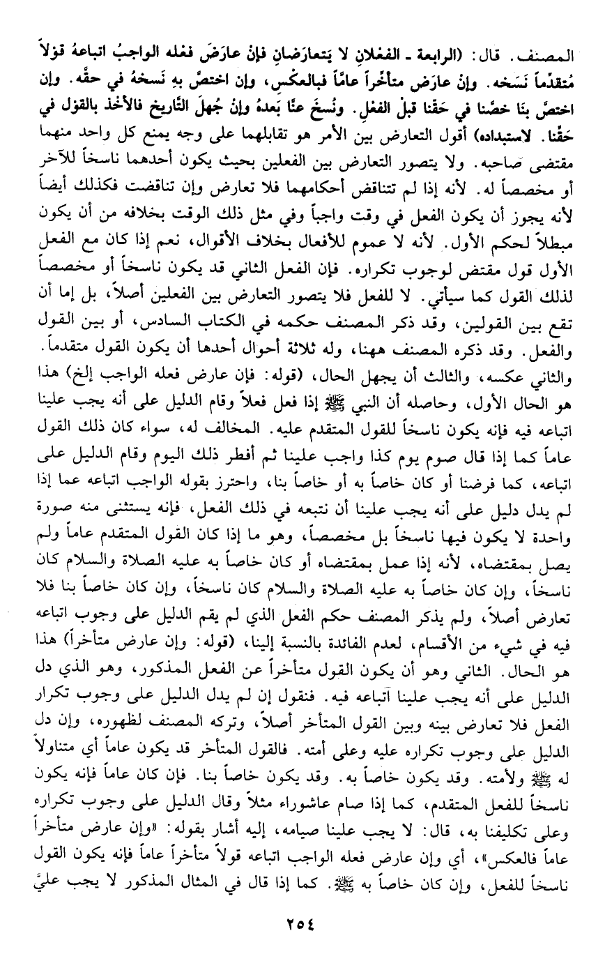 المصنف. قال: "الرابعة: الفعلان لا يتعارضان, فإن عارض فعله الواجب اتباعه قولا متقدما نسخه. وإن عارض متأخرا عاما فبالعكس، وإن اختص به نسخه في حقه, وإن اختص بنا خصنا في حقنا قبل الفعل, ونسخ عنا بعده, وإن جهل التاريخ فالأخذ بالقول في حقنا؛ لاستبداده". أقول: التعارض بين الأمر هو تقابلهما على وجه يمنع كل واحد منهما مقتضى صاحبه, ولا يتصور التعارض بين الفعلين بحيث يكون أحدهما ناسخا للآخر أو مخصصا له؛ لأنه إذا لم تتناقض أحكامهما فلا تعارض وإن تناقضت فكذلك أيضا؛ لأنه يجوز أن يكون الفعل في وقت واجبا وفي مثل ذلك الوقت بخلافه من أن يكون مبطلا لحكم الأول؛ لأنه لا عموم للأفعال بخلاف الأقوال، نعم إذا كان مع الفعل الأول قول مقتضٍ لوجوب تكراره, فإن الفعل الثاني قد يكون ناسخا أو مخصصا لذلك القول كما سيأتي, لا للفعل فلا يتصور التعارض بين الفعلين أصلا، بل إما أن تقع بين القولين، وقد ذكر المصنف حكمه في الكتاب السادس، أو بين القول والفعل وقد ذكره المصنف ههنا, وله ثلاثة أحوال أحدها: أن يكون القول متقدما. والثاني: عكسه، والثالث: أن يجهل الحال. قوله: "فإن عارض فعله الواجب ... إلخ" هذا هو الحال الأول، وحاصله أن النبي صلى الله عليه وسلم إذا فعل فعلا وقام الدليل على أنه يجب علينا اتباعه فيه فإنه يكون ناسخا للقول المتقدم عليه, المخالف له، سواء كان ذلك القول عاما كما إذا قال: صوم يوم كذا واجب علينا ثم أفطر ذلك اليوم وقام الدليل على اتباعه، كما فرضنا أو كان خاصا به أو خاصا بنا، واحترز بقوله: الواجب اتباعه عما إذا لم يدل دليل على أنه يجب علينا أن نتبعه في ذلك الفعل، فإنه يستثنى منه صورة واحدة لا يكون فيها ناسخا بل مخصصا، وهو ما إذا كان القول المتقدم عاما ولم يصل بمقتضاه؛ لأنه إذا عمل بمقتضاه أو كان خاصا به عليه الصلاة والسلام كان ناسخا, وإن كان خاصا به عليه الصلاة والسلام كان ناسخا, وإن كان خاصا بنا فلا تعارض أصلا، ولم يذكر المصنف حكم الفعل الذي لم يقم الدليل على وجوب اتباعه فيه في شيء من الأقسام؛ لعدم الفائدة بالنسبة إلينا. قوله: "وإن عارض متأخرا" هذا هو الحال الثاني وهو أن يكون القول متأخرا عن الفعل المذكور، وهو الذي دل الدليل على أنه يجب علينا اتباعه فيه فنقول: إن لم يدل الدليل على وجوب تكرار الفعل فلا تعارض أصلا بينه وبين القول المتأخر أصلا، وتركه المصنف لظهوره, وإن دل الدليل على وجوب تكراره عليه وعلى أمته, فالقول المتأخر قد يكون عاما أي: متناولا له صلى الله عليه وسلم ولأمته, وقد يكون خاصا به, وقد يكون خاصا بنا, فإن كان عاما فإنه يكون ناسخا للفعل المتقدم، كما إذا صام عاشوراء مثلا وقال: الدليل على وجوب تكراره وعلى تكليفنا به، وقال: لا يجب علينا صيامه، وإليه أشار بقوله: "وإن عارض متأخرا عاما فالعكس" أي: وإن عارض فعله الواجب اتباعه قولا متأخرا عاما فإنه يكون القول ناسخا للفعل، وإن كان خاصا به صلى الله عليه وسلم, كما إذا قال في المثال المذكور: لا يجب علي