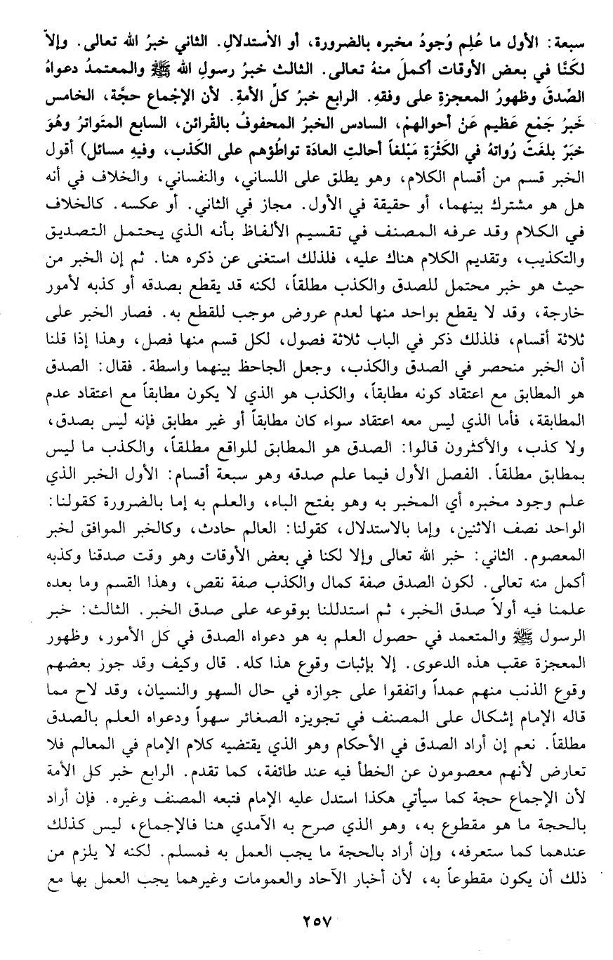 قال: "الباب الثاني: في الأخبار وفيه فصول, الأول: فيما علم صدقة، وهو سبعة, الأول: ما علم وجود مخبره بالضرورة أو بالاستدلال. الثاني: خبر الله تعالى وإلا لكنا في بعض الأوقات أكمل منه تعالى. الثالث: خبر رسول الله -صلى الله عليه وسلم- والمعتمد دعواه الصدق وظهور المعجزة على وفقه. الرابع: خبر كل الأمة؛ لأن الإجماع حجة. الخامس: خبر جمع عظيم عن أحوالهم. السادس: الخبر المحفوف بالقرائن. السابع: المتواتر وهو خبر بلغت رواته في الكثرة مبلغا أحالت العادة تواطؤهم على الكذب، وفيه مسائل". أقول: الخبر قسم من أقسام الكلام، وهو يطلق على اللساني والنفساني، والخلاف في أنه هل هو مشترك بينهما، أو حقيقة في الأول مجاز في الثاني, أو عكسه؟ كالخلاف في الكلام وقد عرفه المصنف في تقسيم الألفاظ بأنه الذي يحتمل التصديق أو التكذيب، وتقديم الكلام هناك عليه؛ فلذلك استغنى عن ذكره هنا. ثم إن الخبر من حيث هو خبر محتمل للصدق والكذب مطلقا، لكنه قد يقطع بصدقه أو كذبه لأمور خارجة، وقد لا يقطع بواحد منها لعدم عروض موجب للقطع به, فصار الخبر على ثلاثة أقسام؛ فلذلك ذكر في الباب ثلاثة فصول، لكل قسم منها فصل, وهذا إذا قلنا: إن الخبر منحصر في الصدق والكذب، وجعل الجاحظ بينهما واسطة فقال: الصدق هو المطابق مع اعتقاد كونه مطابقا، والكذب هو الذي لا يكون مطابقا مع اعتقاد عدم المطابقة، فأما الذي ليس معه اعتقاد سواء كان مطابقا أو غير مطابق فإنه ليس بصدق ولا كذب، والأكثرون قالوا: الصدق هو المطابق للواقع مطلقا، والكذب ما ليس بمطابق مطلقا. الفصل الأول: فيما علم صدقه, وهو سبعة أقسام الأول: الخبر الذي علم وجود مخبره أي: المخبر به وهو بفتح الباء، والعلم به إما بالضرورة كقولنا: الواحد نصف الاثنين، وإما بالاستدلال كقولنا: العالم حادث، وكالخبر الموافق لخبر المعصوم. الثاني: خبر الله تعالى وإلا لكنا في بعض الأوقات وهو وقت صدقنا وكذبه أكمل منه تعالى؛ لكون الصدق صفة كمال والكذب صفة نقص، وهذا القسم وما بعده علمنا فيه أولا صدق الخبر، ثم استدللنا بوقوعه على صدق الخبر. الثالث: خبر الرسول -صلى الله عليه وسلم- والمعتمد في حصول العلم به وهو دعواه الصدق في كل الأمور، وظهور المعجزة عقب هذه الدعوى, إلا بإثبات وقوع هذا كله. قال: وكيف؟ وقد جوز بعضهم وقوع الذنب منهم عمدا واتفقوا على جوازه في حال السهو والنسيان، وقد لاح مما قاله الإمام إشكال على المصنف في تجويزه الصغائر سهوا, ودعواه العلم بالصدق مطلقا. نعم إن أراد الصدق في الأحكام وهو الذي يقتضيه كلام الإمام في المعالم, فلا تعارض؛ لأنهم معصومون عن الخطأ فيه عند طائفة كما تقدم. الرابع: خبر كل الأمة؛ لأن الإجماع حجة كما سيأتي, هكذا استدل عليه الإمام فتبعه المصنف وغيره؛ فإن أراد بالحجة ما هو مقطوع به، وهو الذي صرح به الآمدي هنا فالإجماع ليس كذلك عندهما كما ستعرفه، وإن أراد بالحجة ما يجب العمل به فمسلم, لكنه لا يلزم من ذلك أن يكون مقطوعا به؛ لأن أخبار الآحاد والعمومات وغيرهما يجب العمل بها مع