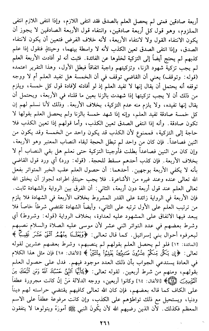 أربعة صادقين, فمتى لم يحصل العلم بالصدق فقد انتفى اللازم، وإذا انتفى اللازم انتفى الملزوم، وهو قول كل أربعة صادقين، وانتفاء قول الأربعة الصادقين لا يجوز أن يكون لانتفاء القول ولا لانتفاء الأربعة؛ لأنه خلاف الفرض فتعين أن يكون لانتفاء الصدق، وإذا انتفى الصدق تعين الكذب؛ لأنه لا واسطة بينهما، وحينئذ فنقول: إذا علم كذبهم لم يحتج أيضا إلى التزكية لخلوها عن الفائدة، فثبت أنه لو أفادت الأربعة العلم لم يجب تزكية شهود الزنا, وتزكيتهم واجبة اتفاقا فبطل الأول، وهذا التقرير اعتمده. قوله: "وتوقف" يعني: أن القاضي توقف في أن الخمسة هل تفيد العلم أم لا؟ ووجه توقفه أنه يحتمل أن يقال: إنها لا تفيد العلم إذ لو أفادته لأفادت قول كل خمسة، ويلزم من ذلك أن لا يجب تزكيتها إذا شهدت بالزنا بعين ما قلناه في الأربعة، ويحتمل أن يقال: إنها تفيده، ولا يلزم منه عدم التزكية بخلاف الأربعة؛ وذلك لأنا نسلم لهم أن كل خمسة صادقة تفيد العلم, وأنه إذا شهد خمسة بالزنا ولم يحصل العلم بقولها لا تكون صادقة, وأنه إذا انتفى الصدق تعين الكذب، وأما قولهم: إذا تعين الكذب فلا حاجة إلى التزكية فممنوع؛ لأن الكذب قد يكون واحدا من الخمسة وقد يكون من اثنين فصاعدا، فإن كان من واحد لم تبطل الحجة لبقاء النصاب المعتبر وهو الأربعة، وإن كان من اثنين فصاعدا بطلت, فأوجبنا التزكية حتى نعلم هل بقي النصاب أم لا بخلاف الأربعة؟ فإن كذب أحدهم مسقط للحجة. قوله: "ورد" أي: ورد قول القاضي بأنه لا يكفي الأربعة بوجهين أحدهما: أن حصول العلم عقب الخبر المتواتر بفعل الله تعالى عنده وعند غيره من الأشاعرة, فلا يجب حينئذ اطراده لجواز أن يخلق الله تعالى العلم عند قول أربعة دون أربعة. الثاني: أن الفرق بين الرواية والشهادة ثابت, فإن الأربعة في الرواية زائدة على القدر المشروط بخلاف الأربعة في الشهادة, فلا يلزم من ترتيب العلم على الأول ترتبه على الثاني، وأيضا الشهادة تقتضي شرطا خاصا فلا يبعد فيها الاتفاق على المشهود عليه لعداوة، بخلاف الرواية. قوله: "وشروط" أي: وشرط بعضهم في عدد التواتر اثني عشر؛ لأن موسى عليه السلام نصبهم ليعرفوه أحوال بني إسرائيل, كما قال تعالى: {وَبَعَثْنَا مِنْهُمُ اثْنَيْ عَشَرَ نَقِيبًا} [المائدة: 12] فلو لم يحصل العلم بقولهم لم ينصبهم، وشرط بعضهم عشرين لقوله تعالى: {إِنْ يَكُنْ مِنْكُمْ عِشْرُونَ صَابِرُونَ يَغْلِبُوا مِائَتَيْنِ} [الأنفال: 65] فإن مثل هذا الكلام في العادة يستدعي الجواب بأن ذلك العدد موجود فيهم, فدل على حصول العلم بقولهم، ومنهم من شرط أربعين لقوله تعالى: {يَا أَيُّهَا النَّبِيُّ حَسْبُكَ اللَّهُ وَمَنِ اتَّبَعَكَ مِنَ الْمُؤْمِنِينَ} [الأنفال: 64] وكانوا أربعين، ووجه الدلالة: مَنْ إن كانت مجرورة عطفا على الكاف كما قاله بعضهم، فإن كان الله تعالى كافيهم فإنه يقتضي حراسته لهم دينا ودنيا، ويستحيل مع ذلك تواطؤهم على الكذب, وإن كانت مرفوعة عطفا على الاسم المعظم فكذلك؛ لأن الذين رضيهم الله لأن يكون النبي -صلى الله عليه وسلم- أموره ويتولوها, لا يتفقون