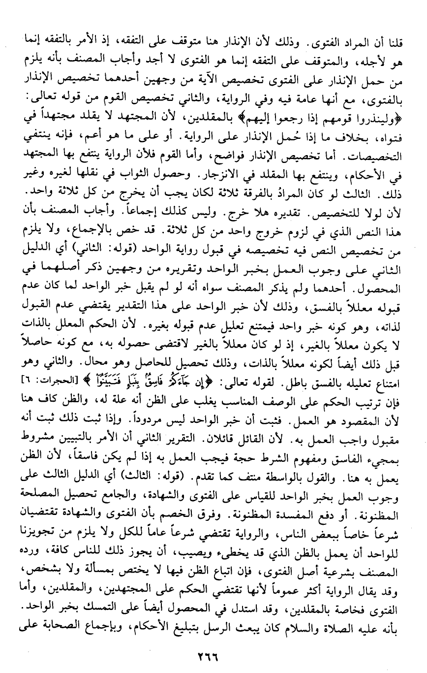 قلنا: إن المراد الفتوى؛ وذلك لأن الإنذار هنا متوقف على التفقه، إذ الأمر بالتفقه إنما هو لأجله، والمتوقف على التفقه إنما هو الفتوى لا أحد, وأجاب المصنف بأنه يلزم من حمل الإنذار على الفتوى تخصيص الآية من وجهين أحدهما: تخصيص الإنذار بالفتوى مع أنها عامة فيه وفي الرواية. الثاني: تخصيص القوم من قوله تعالى: {وَلِيُنْذِرُوا قَوْمَهُمْ إِذَا رَجَعُوا إِلَيْهِمْ} بالمقلدين؛ لأن المجتهد لا يقلد مجتهدا في فتواه، بخلاف ما إذا حمل الإنذار على الرواية أو على ما هو أعم، فإنه ينتفي التخصيصات, أما تخصيص الإنذار فواضح، وأما القوم فلأن الرواية ينتفع بها المجتهد في الأحكام، وينتفع بها المقلد في الانزجار, وحصول الثواب في نقلها لغيره وغير ذلك. الثالث: لو كان المراد بالفرقة ثلاثة لكان يجب أن يخرج من كل ثلاثة واحد؛ لأن لولا للتخصيص تقديره: هلا خرج وليس كذلك إجماعا. وأجاب المصنف بأن هذا النص الذي في لزوم خروج واحد من كل ثلاثة قد خص بالإجماع، ولا يلزم من تخصيص النص فيه تخصيصه في قبول رواية الواحد. قوله: "الثاني" أي: الدليل الثاني على وجوب العمل بخبر الواحد, وتقريره من وجهين ذكر أصلهما في المحصول أحدهما ولم يذكر المصنف سواه: أنه لو لم يقبل خبر الواحد لما كان عدم قبوله معللا بالفسق؛ وذلك لأن خبر الواحد على هذا التقدير يقتضي عدم القبول لذاته، وهو كونه خبر واحد فيمتنع تعليل عدم قبوله بغيره؛ لأن الحكم المعلل بالذات لا يكون معللا بالغير، إذ لو كان معللا بالغير لاقتضى حصوله به، مع كونه حاصلا قبل ذلك أيضا لكونه معللا بالذات، وذلك تحصيل للحاصل وهو محال. والثاني: وهو امتناع تعليله بالفسق باطل لقوله تعالى: {إِنْ جَاءَكُمْ فَاسِقٌ بِنَبَأٍ فَتَبَيَّنُوا} [الحجرات: 6] فإن ترتيب الحكم على الوصف المناسب يغلب على الظن أنه علة له، والظن كاف هنا لأن المقصود هو العمل, فثبت أن خبر الواحد ليس مردودًا. وإذا ثبت ذلك ثبت أنه مقبول واجب العمل به؛ لأن القائل قائلان. التقرير الثاني: أن الأمر بالتبيين مشروط بمجيء الفاسق ومفهوم الشرط حجة, فيجب العمل به إذا لم يكن فاسقا؛ لأن الظن يعمل به هنا، والقول بالواسطة منتف كما تقدم. قوله: "الثالث" أي: الدليل الثالث على وجوب العمل بخبر الواحد القياس على الفتوى والشهادة، والجامع تحصيل المصلحة المظنونة أو دفع المفسدة المظنونة. وفرق الخصم بأن الفتوى والشهادة تقتضيان شرعا خاصا ببعض الناس، والرواية تقتضي شرعا عاما للكل ولا يلزم من تجويزنا للواحد أن يعمل بالظن الذي قد يخطئ ويصيب، أن يجوز ذلك للناس كافة، ورده المصنف بشرعية أصل الفتوى، فإن اتباع الظن فيها لا يختص بمسألة ولا بشخص، وقد يقال: الرواية أكثر عموما؛ لأنها تقتضي الحكم على المجتهدين والمقلدين، وأما الفتوى فخاصة بالمقلدين، وقد استدل في المحصول أيضا على التمسك بخبر الواحد, بأنه -عليه الصلاة والسلام- كان يبعث الرسل بتبليغ الأحكام، وبإجماع الصحابة على