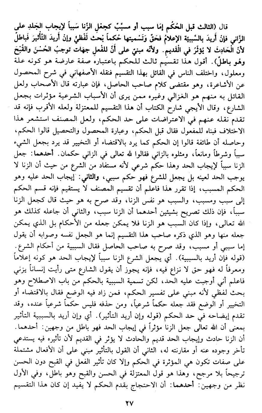 قال: "الثالث قبل الحكم إما سبب أو مسبب, كجعل الزنا سببا لإيجاب الجلد على الزاني, فإن أريد بالسببية الإعلام فحق وتسميتها حكما بحث لفظي, وإن أريد التأثير فباطل لأن الحادث لا يؤثر في القديم، ولأنه مبني على أن للفعل جهات توجب الحسن والقبح وهو باطل". أقول: هذا تقسيم ثالث للحكم باعتباره صفة عارضة هو كونه علة ومعلولا، واختلف الناس في القائل بهذا التقسيم فنقله الأصفهاني في شرح المحصول عن الأشاعرة، وهو مقتضى كلام صاحب الحاصل، فإن عبارته: قال الأصحاب, ولعل القائل به منهم هو الغزالي وغيره ممن يرى أن الأسباب الشرعية مؤثرات بجعل الشارع، وقال الأيجي شارح الكتاب: إن هذا التقسيم للمعتزلة ولعله الأقرب, فإنه قد تقدم نقله عنهم في الاعتراضات على حد الحكم، ولعل المصنف استشعر هذا الاختلاف فبناه للمفعول فقال قبل الحكم، وعبارة المحصول والتحصيل قالوا: الحكم، وحاصله أن طائفة قالوا: إن الحكم كما يرد بالاقتضاء أو التخيير قد يرد بجعل الشيء سببا وشرطا ومانعا، ومثلوه بالزاني فقالوا: لله تعالى في الزاني حكمان, أحدهما: جعل الزنا سببا لإيجاب الحد وهذا حكم شرعي لأنه مستفاد من الشرع من حيث إن الزنا لا يوجب الحد لعينه, بل يجعل للشرع فهو حكم سببي، والثاني: إيجاب الحد عليه وهو الحكم المسبب، إذا تقرر هذا فاعلم أن تقسيم المصنف لا يستقيم فإنه قسم الحكم إلى سبب ومسبب، والسبب هو نفس الزنا، وقد صرح به هو حيث قال: كجعل الزنا سببا، فإن ذلك تصريح بشيئين أحدهما: أن الزنا سبب، والثاني: أن جاعله كذلك هو الله تعالى، وإذا كان السبب هو الزنا فلا يمكن جعله من الأحكام بل الذي يمكن جعله منها وهو الذي ذكره صاحب هذا التقسيم إنما هو الجعل نفسه وصوابه أن يقول: إما سببي أو مسبب، وقد صرح به صاحب الحاصل فقال: السببية من أحكام الشرع.