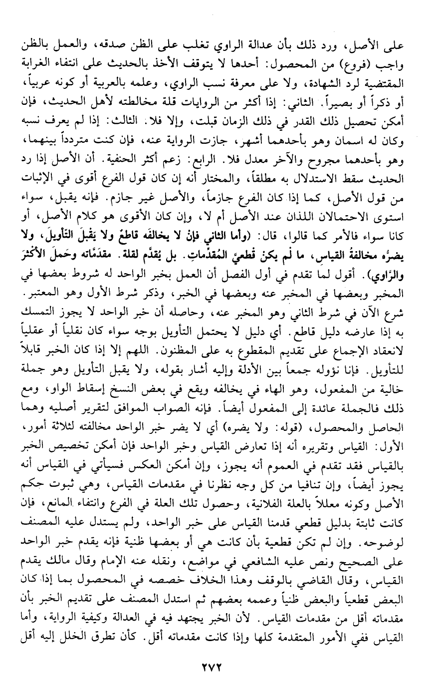 على الأصل، ورد ذلك بأن عدالة الراوي تغلب على الظن صدقه، والعمل بالظن واجب. "فروع" من المحصول أحدها: لا يتوقف الأخذ بالحديث على انتفاء الغرابة المقتضية لرد الشهادة، ولا على معرفة نسب الراوي، وعلمه بالعربية أو كونه عربيا أو ذكرا أو بصيرا. الثاني: إذا أكثر من الروايات قلة مخالطته لأهل الحديث، فإن أمكن تحصيل ذلك القدر في ذلك الزمان قبلت، وإلا فلا. الثالث: إذا لم يعرف نسبه وكان له اسمان وهو بأحدهما أشهر، جازت الرواية عنه، فإن كنت مترددا بينهما وهو بأحدهما مجروح والآخر معدل فلا. الرابع: زعم أكثر الحنفية أن الأصل إذا رد الحديث سقط الاستدلال به مطلقا، والمختار أنه إن كان قول الفرع أقوى في الإثبات من قول الأصل، كما إذا كان الفرع جازما، والأصل غير جازم, فإنه يقبل سواء استوى الاحتمالان اللذان عند الأصل أم لا، وإن كان الأقوى هو كلام الأصل، أو كانا سواء فالأمر كما قالوا. قال: "وأما الثاني فإن لا يخالفه قاطع ولا يقبل التأويل، ولا يضره مخالفة القياس، وما لم يكن قطعي المقدمات، بل يقدم لقلة مقدماته, وحمل الأكثر والراوي". أقول: لما تقدم في أول الفصل أن العمل بخبر الواحد له شروط بعضها في المخبر وبعضها في المخبر عنه وبعضها في الخبر، وذكر شرط الأول وهو المعتبر, شرع الآن في شرط الثاني وهو المخبر عنه، وحاصله أن خبر الواحد لا يجوز التمسك به إذا عارضه دليل قاطع أي: دليل لا يحتمل التأويل بوجه, سواء كان نقليا أو عقليا لانعقاد الإجماع على تقديم المقطوع به على المظنون، اللهم إلا إذا كان الخبر قابلا للتأويل, فإنا نؤوله جمعا بين الأدلة وإليه أشار بقوله: ولا يقبل التأويل وهو جملة خالية من المفعول، وهو الهاء في: يخالفه ويقع في بعض النسخ إسقاط الواو، ومع ذلك فالجملة عائدة إلى المفعول أيضا، فإنه الصواب الموافق لتقرير أصليه وهما: الحاصل والمحصول. قوله: "ولا يضره" أي: لا يضر خبر الواحد مخالفته لثلاثة أمور، الأول: القياس وتقريره أنه إذا تعارض القياس وخبر الواحد فإن أمكن تخصيص الخبر بالقياس فقد تقدم في العموم أنه يجوز، وإن أمكن العكس فسيأتي في القياس أنه يجوز أيضا، وإن تنافيا من كل وجه نظرنا في مقدمات القياس، وهي ثبوت حكم الأصل, وكونه معللا بالعلة الفلانية، وحصول تلك العلة في الفرع وانتفاء المانع، فإن كانت ثابتة بدليل قطعي قدمنا القياس على خبر الواحد، ولم يستدل عليه المصنف لوضوحه, وإن لم تكن قطعية بأن كانت هي أو بعضها ظنية فإنه يقدم خبر الواحد على الصحيح, ونص عليه الشافعي في مواضع ونقله عنه الإمام, وقال مالك: يقدم القياس، وقال القاضي بالوقف وهذا الخلاف خصصه في المحصول بما إذا كان البعض قطعيا والبعض ظنيا وعممه بعضهم, ثم استدل المصنف على تقديم الخبر بأن مقدماته أقل من مقدمات القياس؛ لأن الخبر يجتهد فيه في العدالة وكيفية الرواية، وأما القياس ففي الأمور المتقدمة كلها وإذا كانت مقدماته أقل, كأن تطرق الخلل إليه أقل