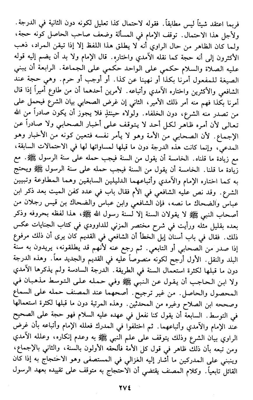 فربما اعتقد شيئا ليس مطابقا, فقوله: لاحتمال كذا تعليل لكونه دون الثانية في الدرجة. ولأجل هذا الاحتمال توقف الإمام في المسألة وضعف صاحب الحاصل كونه حجة، ولما كان الظاهر من حال الراوي أنه لا يطلق هذا اللفظ إلا إذا تيقن المراد، ذهب الأكثرون إلى أنه حجة كما نقله الآمدي واختاره. قال الإمام: ولا بد أن يضم إليه قوله -عليه الصلاة والسلام: "حكمي على الواحد حكمي على الجماعة". الرابعة: أن يبني الصيغة للمفعول: أُمرنا بكذا أو نُهينا عن كذا أو أوجب أو حرم, وهي حجة عند الشافعي والأكثرين واختاره الآمدي وأتباعه لأمرين, أحدهما: أن من طاوع أميرا إذا قال: أمرنا بكذا فهم منه أمر ذلك الأمير. الثاني: أن غرض الصحابي بيان الشرع فيحمل على من تصدر منه الشرع دون الخلفاء, ولولاه حينئذ فلا يجوز أن يكون صادرا من الله تعالى؛ لأن أمره ظاهر لكل أحد لا يتوقف على أخبار الصحابي, ولا صادرا عن الإجماع؛ لأن الصحابي من الأمة وهو لا يأمر نفسه فتعين كونه من الأخبار وهو المدعي، وإنما كانت هذه الدرجة دون ما قبلها لمساواتها لها في الاحتمالات السابقة مع زيادة ما قلناه. الخامسة: أن يقول من السنة فيجب حمله على سنة الرسول -صلى الله عليه وسلم- ويحتج به كما اختاره الإمام والآمدي وأتباعهما للدليلين السابقين وهما: المطاوعة وتبيين الشرع. وقد نص عليه الشافعي في الأم فقال: باب في عدد كفن الميت بعد ذكر ابن عباس والضحاك ما نصه، قال الشافعي: وابن عباس والضحاك بن قيس رجلان من أصحاب النبي صلى الله عليه وسلم لا يقولان السنة إلا لسنة رسول الله -صلى الله عليه وسلم، هذا لفظه بحروفه, وذكر بعده بقليل مثله, ورأيت في شرح مختصر المزني للداودي في كتاب الجنايات عكس ذلك فقال في باب أسنان إبل: الخطأ أن الشافعي في القديم كان يرى أن ذلك مرفوع إذا صدر من الصحابي أو التابعي, ثم رجع عنه؛ لأنهم قد يطلقونه، يريدون به سنة البلد والنقل. والأول أرجح لكونه منصوصا عليه في القديم والجديد معا, وهذه الدرجة دون ما قبلها لكثرة استعمالالسنة في الطريقة. الدرجة السادسة ولم يذكرها الآمدي ولا ابن الحاجب: أن يقول عن النبي -صلى الله عليه وسلم- وفي حمله على التوسط مذهبان في المحصول والحاصل من غير ترجيح, أصحهما عند المصنف: حمله على السماع وصححه ابن الصلاح وغيره من المحدثين. وهذه المرتبة دون ما قبلهالكثرة استعمالها في التوسط. السابعة: أن يقول: كنا نفعل في عهده -عليه الصلاة والسلام- فهوحجة على الصحيح عند الإمام والآمدي وأتباعهما. ثم اختلفوا في المدرك فعلله الإمام وأتباعه بأن غرض الراوي بيان الشرع وذلك يتوقف على علم النبي صلى الله عليه وسلم به وعدم إنكاره، وعلله الآمدي ومن تبعه بأن ذلك ظاهر في قول كل الأمة, فألحقه الأولون بالسنة, والثاني بالإجماع، وينبني على المدركين ما أشار إليه الغزالي في المستصفى وهو الاحتجاج به إذا كان القائل تابعيا. وكلام المصنف يقتضي أن الاحتجاج به متوقف على تقييده بعهد الرسول