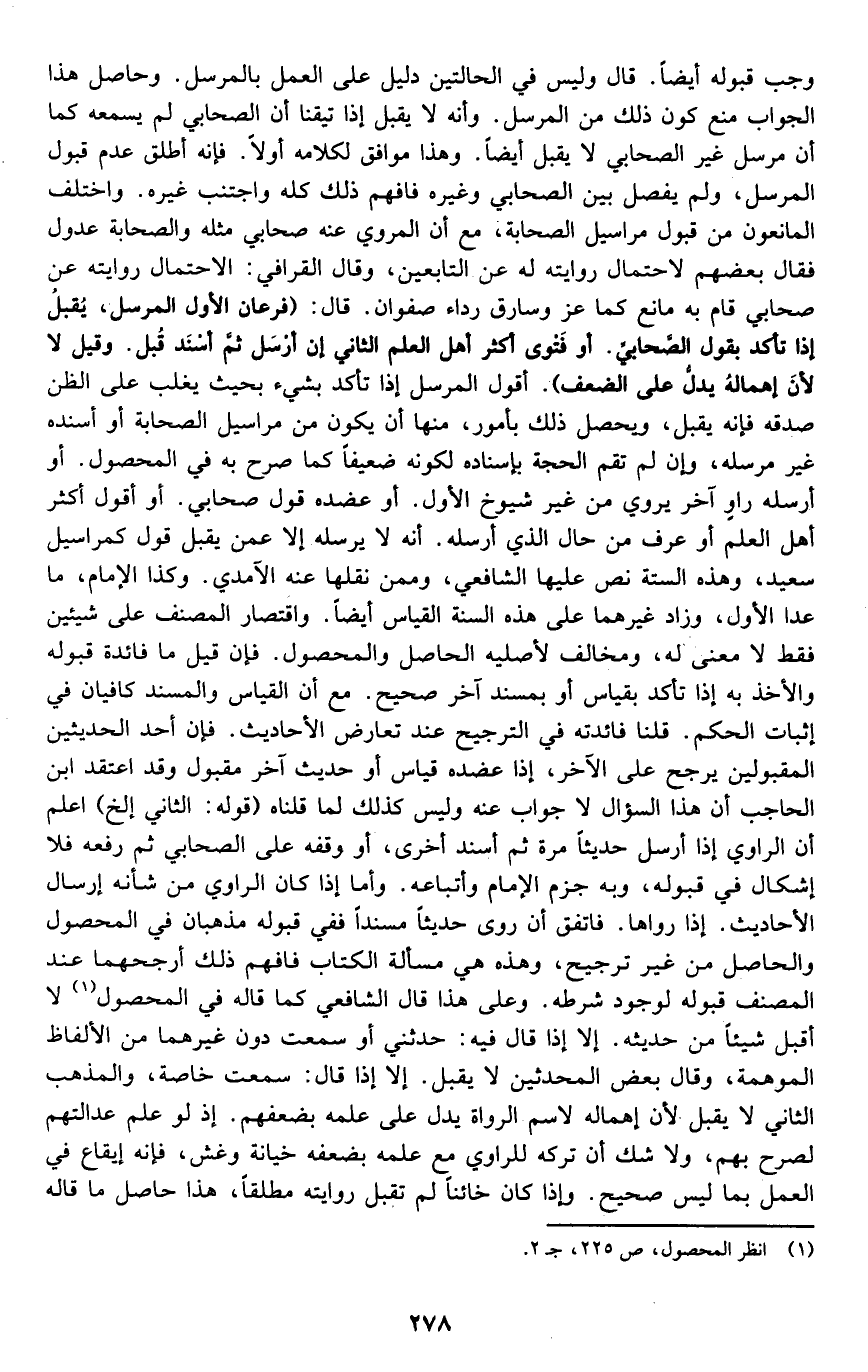 وجب قبوله أيضا. قال: وليس في الحالتين دليل على العمل بالمرسل, وحاصل هذا الجواب منع كون ذلك من المرسل, وأنه لا يقبل إذا تيقنا أن الصحابي لم يسمعه كما أن مرسل غير الصحابي لا يقبل أيضا. وهذا موافق لكلامه أولا؛ فإنه أطلق عدم قبول المرسل، ولم يفصل بين الصحابي وغيره فافهم ذلك كله واجتنب غيره. واختلف المانعون من قبول مراسيل الصحابة، مع أن المروي عنه صحابي مثله والصحابة عدول فقال بعضهم: لاحتمال روايته له عن التابعين، وقال القرافي: لاحتمال روايته عن صحابي قام به مانع, كماعز وسارق رداء صفوان. قال: "فرعان: الأول: المرسل، يقبل إذا تأكد بقول الصحابي أو فتوى أكثر أهل العلم. الثاني: إن أرسل ثم أسند قُبِل, وقيل: لا؛ لأن إهماله يدل على الضعف". أقول: المرسل إذا تأكد بشيء بحيث يغلب على الظن صدقه فإنه يقبل، ويحصل ذلك بأمور، منها أن يكون من مراسيل الصحابة أو أسنده غير مرسله، وإن لم تقم الحجة بإسناده لكونه ضعيفا كما صرح به في المحصول, أو أرسله راوٍ آخر يروي من غير شيوخ الأول, أو عضده قولصحابي, أو قول أكثر أهل العلم أو عرف من حال الذي أرسله أنه لا يرسله إلا عمن يقبل قوله كمراسيل سعيد، وهذه الستة نص عليها الشافعي، وممن نقلها عنه الآمدي وكذا الإمام، ما عدا الأول، وزاد غيرهما على هذه الستة القياس أيضا. واقتصار المصنف على شيئين فقط لا معنى له، ومخالف لأصليه: الحاصل والمحصول, فإن قيل: ما فائدة قبوله والأخذ به إذا تأكد بقياس أو بمسند آخر صحيح, مع أن القياس والمسند كافيان في إثبات الحكم؟ قلنا: فائدته في الترجيح عند تعارض الأحاديث, فإن أحد الحديثين المقبولين يرجح على الآخر، إذا عضده قياس أو حديث آخر مقبول, وقد اعتقد ابن الحاجب أن هذا السؤال لا جواب له وليس كذلك لما قلناه. قوله: "الثاني ... إلخ" اعلم أن الراوي إذا أرسل حديثا مرة ثم أسند أخرى، أو وقفه على الصحابي ثم رفعه, فلا إشكال في قبوله، وبه جزم الإمام وأتباعه. وأما إذا كان الراوي من شأنه إرسال الأحاديث إذا رواها, فاتفق أن روى حديثا مسندا, ففي قبوله مذهبان في المحصول والحاصل من غير ترجيح، وهذه هي مسألة الكتاب فافهم ذلك, وأرجحهما عند المصنف قبوله لوجود شرطه, وعلى هذا قال الشافعي كما قال في المحصول1: لا أقبل شيئا من حديثه إلا إذا قال فيه: حدثني أو سمعت, دون غيرهما من الألفاظ الموهمة. وقال بعض المحدثين: لا يقبل إلا إذا قال: سمعت خاصة. والمذهب الثاني: لا يقبل؛ لأن إهماله لاسم الرواة يدل على علمه بضعفهم, إذ لو علم عدالتهم لصرح بهم، ولا شك أن تركه للراوي مع علمه بضعفه خيانة وغش، فإنه إيقاع في العمل بما ليس صحيحا, وإذا كان خائنا لم تقبل روايتهمطلقا، هذا حاصل ما قاله