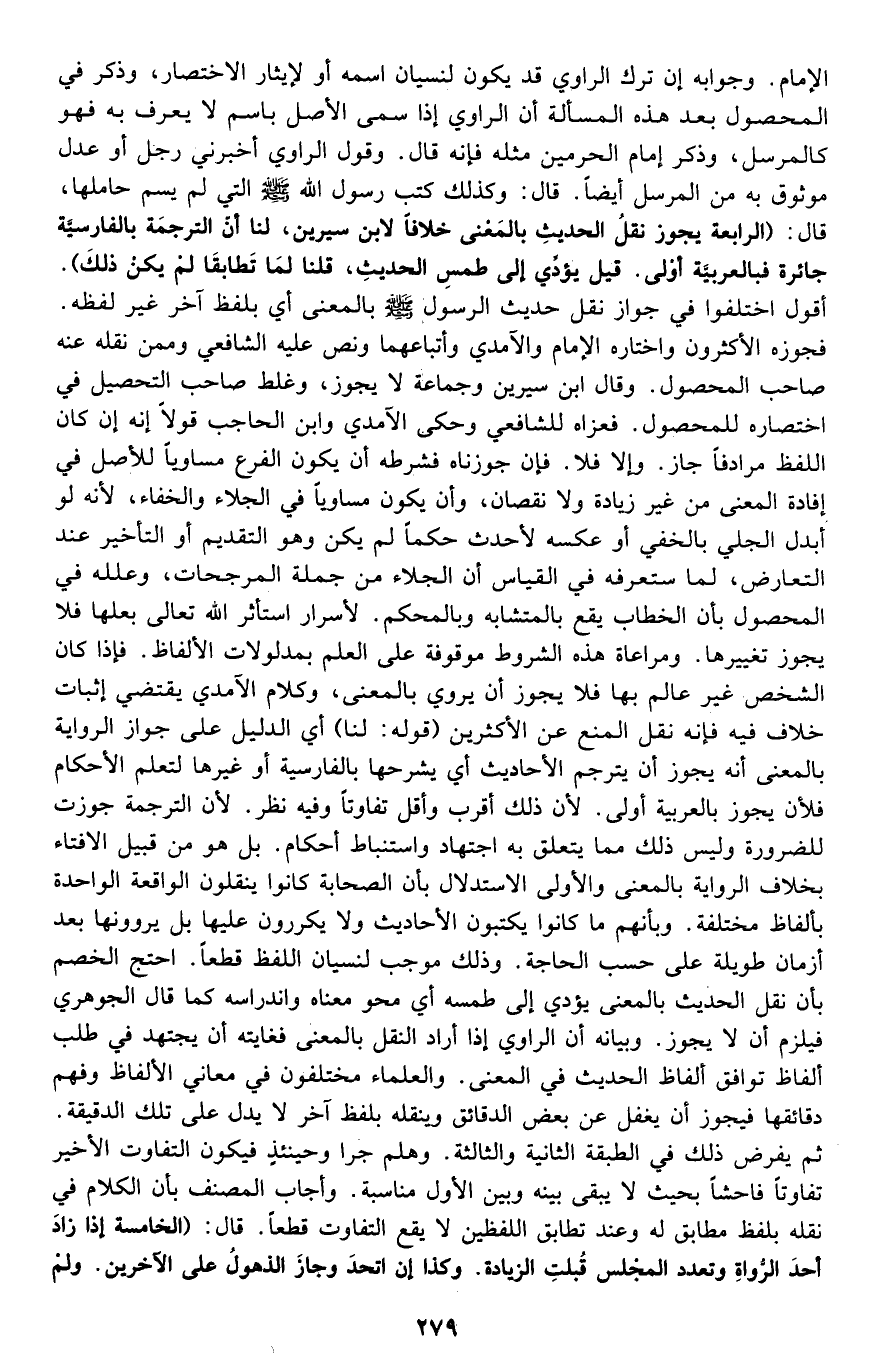 الإمام, وجوابه أن ترك الراوي قد يكون لنسيان اسمه أو لإيثار الاختصار، وذكر في المحصول بعد هذه المسألة أن الراوي إذا سمى الأصل باسم لا يعرف به فهو كالمرسل، وذكر إمام الحرمين مثله فإنه قال: وقول الراوي: أخبرني رجل أو عدل موثوق به من المرسل أيضا. قال: وكذلك كتب رسول الله -صلى الله عليه وسلم- التي لم يسم حاملها. قال: "الرابعة: يجوز نقل الحديث بالمعنى خلافا لابن سيرين, لنا أن الترجمة بالفارسية جائزة فبالعربية أولى. قيل: يؤدي إلى طمس الحديث، قلنا: لما تطابقا لم يكن ذلك". أقول: اختلفوا في جواز نقل حديث الرسول -صلى الله عليه وسلم- بالمعنى أي: بلفظ آخر غير لفظه, فجوزه الأكثرون واختاره الإمام والآمدي وأتباعهما ونص عليه الشافعي وممن نقله عنه صاحب المحصول, وقال ابن سيرين وجماعة: لا يجوز، وغلط صاحب التحصيل في اختصاره للمحصول, فعزاه للشافعي وحكى الآمدي وابن الحاجب قولا: إنه إن كان اللفظ مرادفا جاز وإلا فلا, فإن جوزناه فشرطه أن يكون الفرع مساويا للأصل في إفادة المعنى من غير زيادة ولا نقصان، وأن يكون مساويا في الجلاء والخفاء؛ لأنه لو أبدل الجلي بالخفي أو عكسه لأحدث حكما لم يكن وهو التقديم أو التأخير عند التعارض، لما ستعرفه في القياس أن الجلاء من جملة المرجحات، وعلله في المحصول بأن الخطاب يقع بالمتشابه وبالمحكم لأسرار استأثر الله تعالى بعلها فلا يجوز تغييرها, ومراعاة هذه الشروط موقوفة على العلم بمدلولات الألفاظ, فإذا كان الشخص غير عالم بها فلا يجوز أن يروي بالمعنى، وكلام الآمدي يقتضي إثبات خلاف فيه, فإنه نقل المنع عن الأكثرين. قوله: "لنا" أي: الدليل على جواز الرواية بالمعنى أنه يجوز أن يترجم الأحاديث أي: يشرحها بالفارسية أو غيرها لتعلم الأحكام فلأن يجوز بالعربية أولى؛ لأن ذلك أقرب وأقل تفاوتا وفيه نظر؛ لأن الترجمة جوزت للضرورة وليس ذلك مما يتعلق به اجتهاد واستنباط أحكام, بل هو من قبيل الإفتاء بخلاف الرواية بالمعنى, والأولى الاستدلال بأن الصحابة كانوا ينقلون الواقعة الواحدة بألفاظ مختلفة, وبأنهم ما كانوا يكتبون الأحاديث ولا يكررون عليها بل يروونها بعد أزمان طويلة على حسب الحاجة وذلك موجب لنسيان اللفظ قطعا. احتج الخصم بأن نقل الحديث بالمعنى يؤدي إلى طمسه أي: محو معناه واندراسه كما قال الجوهري فيلزم أن لا يجوز, وبيانه: أن الراوي إذا أراد النقل بالمعنى فغايته أن يجتهد في طلب ألفاظ توافق ألفاظ الحديث في المعنى, والعلماء مختلفون في معاني الألفاظ وفهم دقائقها, فيجوز أن يغفل عن بعض الدقائق وينقله بلفظ آخر لا يدل على تلك الدقيقة, ثم يفرض ذلك في الطبقة الثانية والثالثة وهلم جرا, وحينئذ فيكون التفاوت الأخير تفاوتا فاحشا بحيث لا يبقى بينه وبين الأول مناسبة. وأجاب المصنف بأن الكلام في نقله بلفظ مطابق له وعند تطابقاللفظين لا يقع التفاوت قطعا. قال: "الخامسة: إذا زاد أحد الرواة وتعدد المجلس قبلت الزيادة. وكذا إن اتحد وجاز الذهول على الآخرين ولم