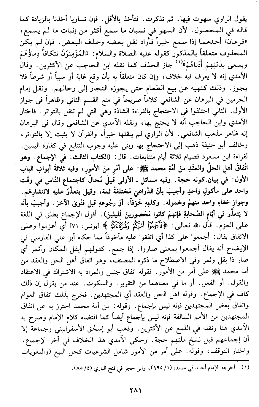 قال: "الكتاب الثالث: في الإجماع, وهو اتفاق أهل الحل والعقد من أمة محمد -صلى الله عليه وسلم- على أمر من الأمور، وفيه ثلاثة أبواب: الباب الأول: في بيان كونه حجة, وفيه مسائل: الأولى: قيل: محال كاجتماع الناس في وقت واحد على مأكول واحد, وأجيب بأن الدواعي مختلفة ثمة، وقيل: يتعذر عليه لانتشارهم, وجواز خفاء واحد منهم وخموله وكذبه خوفا، أو رجوعه قبل فتوى الآخر. وأجيب بأنه لا يتعذر في أيام الصحابة, فإنهم كانوا محصورين قليلين". أقول: الإجماع يطلق في اللغة على العزم, قال الله تعالى: {فَأَجْمِعُوا أَمْرَكُمْ وَشُرَكَاءَكُمْ} [يونس:71] أي: أعزموا وعلى الاتفاق يقال: أجمعوا على كذا أي: اتفقوا عليه, مأخوذا مما حكاه أبو علي الفارسي في الإيضاح أنه يقال: أجمعوا بمعنى صاروا إذا جمع كقولهم: أبقل المكان وأثمر أي: صار ذا بقل وثمر, وفي الاصطلاح ما ذكره المصنف، وهو اتفاق أهل الحل والعقد من أمة محمد صلى الله عليه وسلم على أمر من الأمور. فقوله: اتفاق جنس والمراد به الاشتراك في الاعتقاد والقول أو الفعل أو ما في معناهما من التقرير والسكوت عند من يقول: إن ذلك كافٍ في الإجماع. وقوله: أهل الحل والعقد أي: المجتهدين, فخرج بذلك اتفاق العوام واتفاق بعض المجتهدين, فإنه ليس بإجماع. وقوله: من أمة محمد, احترز به عن اتفاق المجتهدين من الأمم السالفة فإنه ليس بإجماع أيضا كما اقتضاه كلام الإمام وصرح به الآمدي هنا ونقله في اللمع عن الأكثرين. وذهب أبو إسحاق الإسفرائيني وجماعة إلى أن إجماعهم قبل نسخ ملتهم حجة, وحكى الآمدي هذا الخلاف في آخر الإجماع، واختار التوقف، وقوله: على أمر من الأمور, شامل الشرعيات كحل البيع "واللغويات