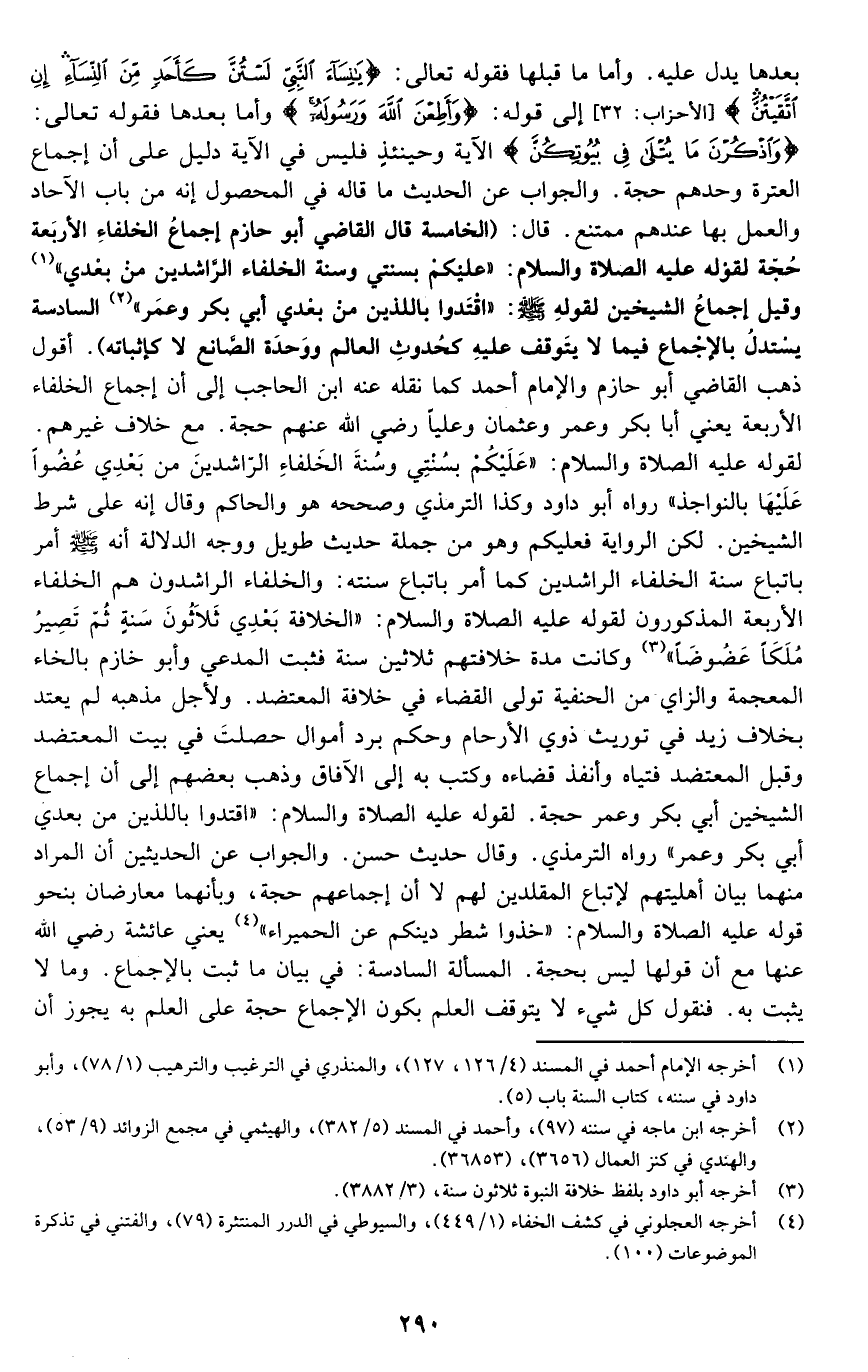 بعدها يدل عليه. وأما ما قبلها فقوله تعالى: {يَا نِسَاءَ النَّبِيِّ لَسْتُنَّ كَأَحَدٍ مِنَ النِّسَاءِ إِنِ اتَّقَيْتُنَّ} [الأحزاب: 32] إلى قوله: {وَأَطِعْنَ اللَّهَ وَرَسُولَهُ} وأما ما بعدها فقوله تعالى: {وَاذْكُرْنَ مَا يُتْلَى فِي بُيُوتِكُنَّ} الآية, وحينئذ فليس في الآية دليل على أن إجماع العترة وحدهم حجة. والجواب عن الحديث ما قاله في المحصول: إنه من باب الآحاد والعمل بها عندهم ممتنع. قال: "الخامسة: قال القاضي أبو حازم: إجماع الخلفاء الأربعة حجة؛ لقوله -عليه الصلاة والسلام: "عليكم بسنتي وسنة الخلفاء الراشدين من بعدي" 1 وقيل: إجماع الشيخين لقوله -صلى الله عليه وسلم: " اقتدوا باللذين من بعدي: أبي بكر وعمر" 2 والسادسة: يستدل بالإجماع فيما لا يتوقف عليه كحدوث العالم ووحدة الصانع لا كإثباته". أقول: ذهب القاضي أبو حازم والإمام أحمد كما نقله عنه ابن الحاجب إلى أن إجماع الخلفاء الأربعة, يعني أبا بكر وعمر وعثمان وعليا -رضي الله عنهم- حجة مع خلاف غيرهم؛ لقوله -عليه الصلاة والسلام: "عليكم بسنتي وسنة الخلفاء الراشدين من بعدي, عضوا عليها بالنواجذ" رواه أبو داود وكذا الترمذي وصححه هو والحاكم وقال: إنه على شرط الشيخين, لكن الرواية: "فعليكم" وهو من جملة حديث طويل. ووجه الدلالة أنه صلى الله عليه وسلم أمر باتباع سنة الخلفاء الراشدين كما أمر باتباع سنته, والخلفاء الراشدون هم الخلفاء الأربعة المذكورون لقوله -عليه الصلاة والسلام: "الخلافة بعدي ثلاثون سنة, ثم تصير ملكا عضوضا " 3 وكانت مدة خلافتهم ثلاثين سنة, فثبت المدعي وأبو خازم -بالخاء المعجمة والزاي- من الحنفية, تولى القضاء في خلافة المعتضد, ولأجل مذهبه لم يعتد بخلاف زيد في توريث ذوي الأرحام وحكم برد أموال حصلت في بيت المعتضد وقبل المعتضد فتياه, وأنفذ قضاءه, وكتب إلى الآفاق وذهب بعضهم إلى أن إجماع الشيخين أبي بكر وعمر حجة؛ لقوله عليه الصلاة والسلام: "اقتدوا باللذين من بعدي: أبي بكر وعمر" رواه الترمذي وقال: حديث حسن. والجواب عن الحديثين أن المراد منهما بيان أهليتهم لاتباع المقلدين لهم لا أن إجماعهم حجة، وبأنهما معارضان بنحو قوله عليه الصلاة والسلام: "خذوا شطر دينكم عن الحميراء" 4 يعني عائشة -رضي الله عنها- مع أن قولها ليس بحجة. المسألة السادسة: في بيان ما يثبت بالإجماع وما لا يثبت به، فنقول: كل شيء لا يتوقف العلم بكون الإجماع حجة على العلم به, يجوز أن