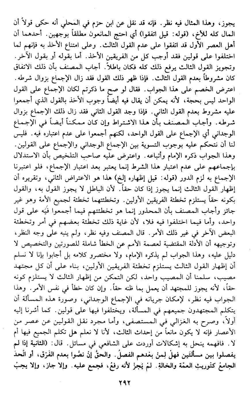 يجوز، وهذا المثال فيه نظر، فإنه قد نقل عن ابن حزم في المحلى أنه حكى قولا: أن المال كله للأخ. قوله: "قيل: اتفقوا" أي: احتج المانعون مطلقا بوجهين أحدهما: أن أهل العصر الأول قد اتفقوا على عدم القول الثالث وعلى امتناع الأخذ به, فإنهم لما اختلفوا على قولين فقد أوجب كلا من الفريقين الأخذ إما بقوله أو بقول الآخر, وتجويز القول الثالث يرفع ذلك كله فكان باطلا. وأجاب المصنف بأن ذلك الاتفاق كان مشروطا بعدم القول الثالث, فإذا ظهر ذلك القول فقد زال الإجماع بزوال شرطه. واعترض الخصم على هذا الجواب فقال: لو صح ما ذكرتم لكان الإجماع على القول الواحد ليس بحجة؛ لأنه يمكن أن يقال فيه أيضا: وجوب الأخذ بالقول الذي أجمعوا عليه مشروط بعدم القول الثاني, فإذا وجد القول الثاني فقد زال ذلك الإجماع بزوال شرطه. وأجاب المصنف بأن هذا الاشتراط وإن كان ممكنا أيضا في الإجماع الوجداني أي: الإجماع على القول الواحد، لكنهم أجمعوا على عدم اعتباره فيه, فليس لنا أن نتحكم عليه بوجوب التسوية بين الإجماع الوجداني والإجماع على القولين. وهذا الجواب ذكره الإمام وأتباعه, واعترض عليه صاحب التلخيص بأن الاستدلال بإجماعهم على عدم اعتبار هذا الشرط إنما يعتبر بعد اعتبار الإجماع، فلو اعتبرنا الإجماع به للزم الدور. قوله: "قيل: إظهاره ... إلخ" هذا هو الاعتراض الثاني، وتقريره أن إظهار القول الثالث إنما يجوز إذا كان حقا؛ لأن الباطل لا يجوز القول به, والقول بكونه حقا يستلزم تخطئة الفريقين الأولين وتخطئتهما تخطئة لجميع الأمة وهو غير جائز. وأجاب المصنف بأن المحذور إنما هو تخطئتهم فيما أجمعوا فيه على قول واحد، وأما فيما اختلفوا فيه فلا؛ لأن غاية ذلك تخطئة بعضهم في أمر وتخطئة البعض الآخر في غير ذلك الأمر. قال المصنف: وفيه نظر، ولم ينبه على وجه النظر، وتوجيهه أن الأدلة المقتضية لعصمة الأمم عن الخطأ شاملة للصورتين والتخصيص لا دليل عليه، وهذا الجواب لم يذكره الإمام ولا مختصرو كلامه, بل أجابوا بأنا لا نسلم أن إظهار القول الثالث يستلزم تخطئة الفريقين الأولين، بناء على أن كل مجتهد مصيب، سلمنا أن المصيب واحد، لكن التمكن من إظهار الثالث لا يستلزم كونه حقا؛ لأنه يجوز للمجتهد أن يعمل بما ظنه حقا, وإن كان خطأ في نفس الأمر. وهذا الجواب فيه نظر؛ لإمكان جريانه في الإجماع الوجداني، وصورة هذه المسألة أن يتكلم المجتهدون جميعهم في المسألة، ويختلفوا فيها على قولين كما أشرنا إليه أولا، وصرح به الغزالي في المستصفى، وأما مجرد نقل القولين عن عصر من الأعصار فإنه لا يكون مانعا من إحداث الثالث؛ لأنا لا نعلم هل تكلم الجميع فيها أم لا؟ فافهمه ينحلّ به إشكالات أوردت على الشافعي في مسائل. قال: "الثانية: إذا لم يفصلوا بين مسألتين فهل لمن بعدهم الفصل؟ والحق: إن نصوا بعدم الفرق، أو اتحد الجامع كتوريث العمة والخالة, لم يجز لأنه رفع، فجمع عليه, وإلا جاز، وإلا يجب