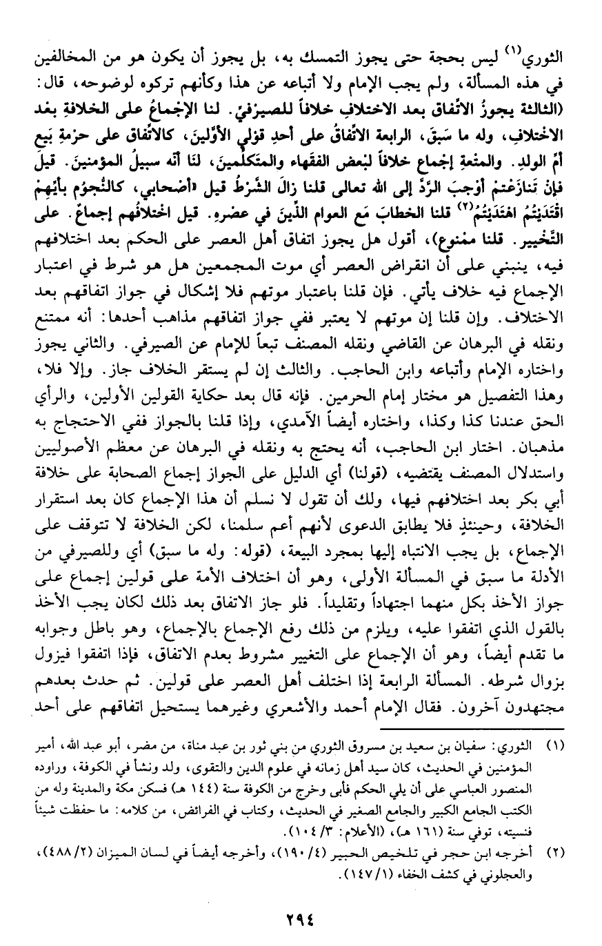 الثوري1 ليس بحجة حتى يجوز التمسك به، بل يجوز أن يكون هو من المخالفين في هذه المسألة، ولم يجب الإمام ولا أتباعه عن هذا وكأنهم تركوه لوضوحه. قال: "الثالثة: يجوز الاتفاق بعد الاختلاف خلافا للصيرفي. لنا الإجماع على الخلافة بعد الاختلاف، وله ما سبق. الرابعة: الاتفاق على أحد قولي الأولين، كالاتفاق على حرمة بيع أم الولد، والمتعة إجماع خلافا لبعض الفقهاء والمتكلمين، لنا أنه سبيل المؤمنين, قيل: فإن تنازعتم أوجب الرد إلى الله تعالى قلنا: زال الشرط قيل: "أصحابي كالنجوم, بأيهم اقتديتم اهتديتم" 2 قلنا: الخطاب مع العوام الذين في عصره, قيل: اختلافهم إجماع على التخيير, قلنا: ممنوع". أقول: هل يجوز اتفاق أهل العصر على الحكم بعد اختلافهم فيه, ينبني على أن انقراض العصر أي: موت المجمعين هل هو شرط في اعتبار الاجماع؟ فيه خلاف يأتي؛ فإن قلنا باعتبار موتهم فلا إشكال في جواز اتفاقهم بعد الاختلاف. وإن قلنا: إن موتهم لا يعتبر ففي جواز اتفاقهم مذاهب, أحدها: أنه ممتنع ونقله في البرهان عن القاضي ونقله المصنف تبعا للإمام عن الصيرفي. والثاني: يجوز, واختاره الإمام وأتباعه وابن الحاجب. والثالث: إن لم يستقر الخلاف جاز وإلا فلا، وهذا التفصيل هو مختار إمام الحرمين, فإنه قال بعد حكاية القولين الأولين: والرأي الحق عندنا كذا وكذا، واختاره أيضا الآمدي، وإذا قلنا بالجواز ففي الاحتجاج به مذهبان، اختار ابن الحاجب أنه يحتج به ونقله في البرهان عن معظم الأصوليين, واستدلال المصنف يقتضيه. "قولنا" أي: الدليل على الجواز إجماع الصحابة على خلافة أبي بكر بعد اختلافهم فيها، ولك أن تقول: لا نسلم أن هذا الإجماع كان بعد استقرار الخلافة، وحينئذ فلا يطابق الدعوى؛ لأنهم أعم, سلمنا لكن الخلافة لا تتوقف على الإجماع، بل يجب الانتباه إليها بمجرد البيعة. قوله: "وله ما سبق" أي: وللصيرفي من الأدلة ما سبق في المسألة الأولى، وهو أن اختلاف الأمة على قولين إجماع على جواز الأخذ بكل منهما اجتهادا وتقليدا. فلو جاز الاتفاق بعد ذلك لكان يجب الأخذ بالقول الذي اتفقوا عليه، ويلزم من ذلك رفع الإجماع بالإجماع وهو باطل, وجوابه ما تقدم أيضا، وهو أن الإجماع على التغيير مشروط بعدم الاتفاق، فإذا اتفقوا فيزول بزوال شرطه. المسألة الرابعة: إذا اختلف أهل العصر على قولين ثم حدث بعدهم مجتهدون آخرون, فقال الإمام أحمد والأشعري وغيرهما: يستحيل اتفاقهم على أحد