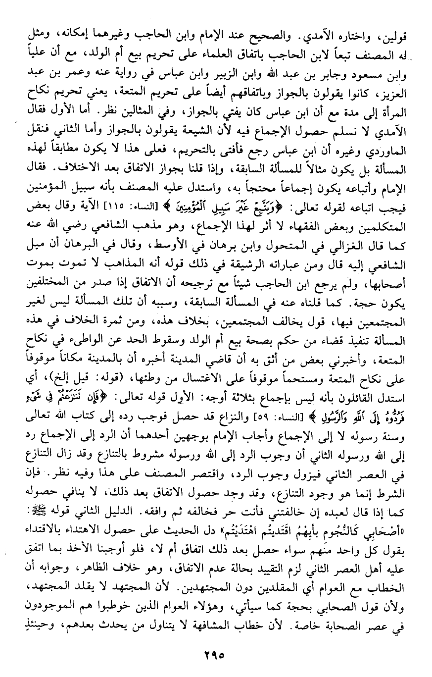 قولين، واختاره الآمدي. والصحيح عند الإمام وابن الحاجب وغيرهما إمكانه، ومثل له المصنف تبعا لابن الحاجب باتفاق العلماء على تحريم بيع أم الولد, مع أن عليا وابن مسعود وجابر بن عبد الله وابن الزبير وابن عباس في رواية عنه وعمر بن عبد العزيز، كانوا يقولون بالجواز, وباتفاقهم أيضا على تحريم المتعة، يعني: تحريم نكاح المرأة إلى مدة, مع أن ابن عباس كان يفتي بالجواز، وفي المثالين نظر. وأما الأول فقال الآمدي: لا نسلم حصول الإجماع فيه؛ لأن الشيعة يقولون بالجواز, وأما الثاني فنقل الماوردي وغيره أن ابن عباس رجع فأفتى بالتحريم، فعلى هذا لا يكون مطابقا لهذه المسألة بل يكون مثالا للمسألة السابقة، وإذا قلنا بجواز الاتفاق بعد الاختلاف، فقال الإمام وأتباعه: يكون إجماعا محتجا به، واستدل عليه المصنف بأنه سبيل المؤمنين فيجب اتباعه لقوله تعالى: {وَيَتَّبِعْ غَيْرَ سَبِيلِ الْمُؤْمِنِينَ} [النساء: 115] الآية وقال بعض المتكلمين وبعض الفقهاء: لا أثر لهذا الإجماع، وهو مذهب الشافعي -رضي الله عنه- كما قال الغزالي في المنخول وابن برهان في الأوسط، وقال في البرهان: إن ميل الشافعي إليه قال: ومن عباراته الرشيقة في ذلك قوله: إنها المذاهب لا تموت بموت أصحابها، ولم يرجع ابن الحاجب شيئا مع ترجيحه أن الاتفاق إذا صدر من المختلفين يكون حجة كما قلناه عنه في المسألة السابقة، وسببه أن تلك المسألة ليس لغير المجتمعين فيها قول يخالف المجتمعين بخلاف هذه، ومن ثمرة الخلاف في هذه المسألة تنفيذ قضاء من حكم بصحة بيع أم الولد وسقوط الحد عن الواطئ في نكاح المتعة، وأخبرني بعض من أثق به أن قاضي المدينة أخبره أن بالمدينة مكانا موقوفا على نكاح المتعة ومستحما موقوفا على الاغتسال من وطئها. قوله: "قيل ... إلخ" أي: استدل القائلون بأنه ليس بإجماع بثلاثة أوجه الأول: قوله تعالى: {فَإِنْ تَنَازَعْتُمْ فِي شَيْءٍ فَرُدُّوهُ إِلَى اللَّهِ وَالرَّسُولِ} [النساء: 59] والنزاع قد حصل, فوجب رده إلى كتاب الله تعالى وسنة رسوله, لا إلى الإجماع. وأجاب الإمام بوجهين أحدهما: أن الرد إلى الإجماع رد إلى الله ورسوله. الثاني: أن وجوب الرد إلى الله ورسوله مشروط بالتنازع وقد زال التنازع في العصر الثاني, فيزول وجوب الرد، واقتصر المصنف على هذا وفيه نظر، فإن الشرط إنما هو وجود التنازع، وقد وجد حصول الاتفاق بعد ذلك، ولا ينافي حصوله كما إذا قال لعبده: إن خالفتني فأنت حر, فخالفه ثم وافقه. الدليل الثاني: قوله -صلى الله عليه وسلم: "أصحابي كالنجوم, بأيهم اقتديتم اهتديتم" دل الحديث على حصول الاهتداء بالاقتداء بقول كل واحد منهم, سواء حصل بعد ذلك اتفاق أم لا، فلو أوجبنا الأخذ بما اتفق عليه أهل العصر الثاني للزم التقييد بحالة عدم الاتفاق، وهو خلاف الظاهر، وجوابه أن الخطاب مع العوام أي: المقلدين دون المجتهدين؛ لأن المجتهد لا يقلد المجتهد، ولأن قول الصحابي بحجة كما سيأتي، وهؤلاء العوام الذين خُوطبوا هم الموجودون في عصر الصحابة خاصة؛ لأن خطاب المشافهة لا يتناول من يحدث بعدهم، وحينئذٍ