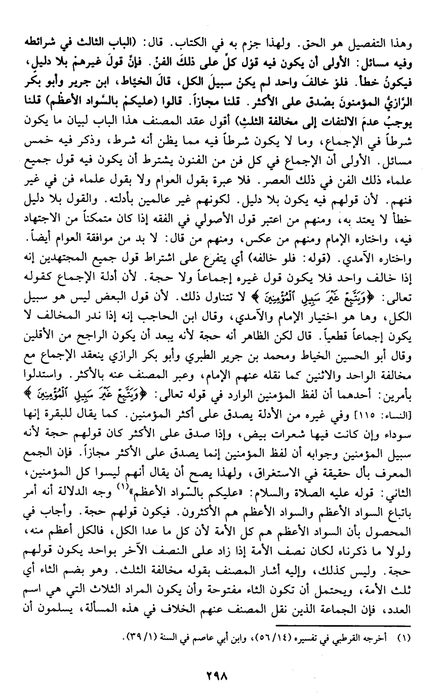 قال: "الباب الثالث: في شرائطه وفيه مسائل: الأولى: أن يكون فيه قول كل على ذلك الفن، فإن قول غيرهم بلا دليل، فيكون خطأ، فلو خالف واحد لم يكن سبيل الكل. قال الخياط وابن جرير وأبو بكر الرازي: المؤمنون يصدق على الأكثر. قلنا: مجازا. قالوا: "عليكم بالسواد الأعظم" قلنا: يوجب عدم الالتفات إلى مخالفة الثلث". أقول: عقد المصنف هذا الباب لبيان ما يكون شرطا في الإجماع، وما لا يكون شرطا فيه مما يظن أنه شرط، وذكر فيه خمس مسائل, الأولى: أن الإجماع في كل فن من الفنون يشترط أن يكون فيه قول جميع علماء ذلك الفن في ذلك العصر, فلا عبرة بقول العوام ولا بقول علماء فن في غير فنهم؛ لأن قولهم فيه يكون بلا دليل؛ لكونهم غير عالمين بأدلته. والقول بلا دليل خطأ لا يعتد به، ومنهم من اعتبر قول الأصولي في الفقه إذا كان متمكنا من الاجتهاد فيه, واختاره الإمام ومنهم من عكس, ومنهم من قال: لا بد من موافقة العوام أيضا, واختاره الآمدي. قوله: "فلو خالفه" أي: يتفرع على اشتراط قول جميع المجتهدين: إنه إذا خالف واحد فلا يكون قول غيره إجماعا ولا حجة؛ لأن أدلة الإجماع كقوله تعالى: {وَيَتَّبِعْ غَيْرَ سَبِيلِ الْمُؤْمِنِينَ} لا تتناول ذلك؛ لأن قول البعض ليس هو سبيل الكل، وها هو اختيار الإمام والآمدي، وقال ابن الحاجب: إنه إذا ندر المخالف لا يكون إجماعا قطعيا. قال: لكن الظاهر أنه حجة؛ لأنه يبعد أن يكون الراجح من الأقلين وقال أبو الحسين الخياط ومحمد بن جرير الطبري وأبو بكر الرازي: ينعقد الإجماع مع مخالفة الواحد والاثنين كما نقله عنهم الإمام، وعبر المصنف عنه بالأكثر, واستدلوا بأمرين أحدهما: أن لفظ المؤمنين الوارد في قوله تعالى: {وَيَتَّبِعْ غَيْرَ سَبِيلِ الْمُؤْمِنِينَ} [النساء: 115] وفي غيره من الأدلة, يصدق على أكثر المؤمنين كما يقال للبقرة: إنها سوداء وإن كانت فيها شعرات بيض، وإذا صدق على الأكثر كان قولهم حجة؛ لأنه سبيل المؤمنين, وجوابه أن لفظ المؤمنين إنما يصدق على الأكثر مجازا, فإن الجمع المعرف بال حقيقة في الاستغراق؛ ولهذا يصح أن يقال: إنهم ليسوا كل المؤمنين. الثاني: قوله -عليه الصلاة والسلام: "عليكم بالسواد الأعظم" 1 ووجه الدلالة أنه أمر باتباع السواد الأعظم والسواد الأعظم هم الأكثرون, فيكون قولهم حجة. وأجاب في المحصول بأن السواد الأعظم هم كل الأمة؛ لأن كل ما عدا الكل، فالكل أعظم منه، ولولا ما ذكرناه لكان نصف الأمة إذا زاد على النصف الآخر بواحد, يكون قولهم حجة وليس كذلك، وإليه أشار المصنف بقوله: مخالفة الثلث, وهو بضم الثاء أي: ثلث الأمة، ويحتمل أن تكون الثاء مفتوحة وأن يكون المراد الثلاثة التي هي اسم العدد، فإن الجماعة الذين نقل المصنف عنهم الخلاف في هذه المسألة، يسلمون أن