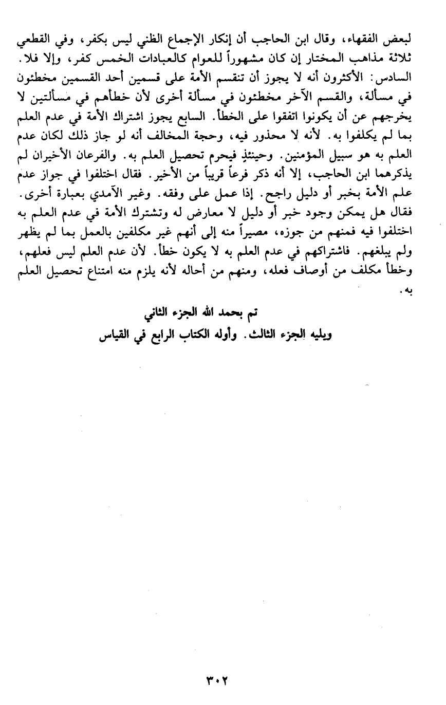 لبعض الفقهاء، وقال ابن الحاجب: إن إنكار الإجماع الظني ليس بكفر، وفي القطعي ثلاثة مذاهب, المختار إن كان مشهورا للعوام كالعبادات الخمس كفر، وإلا فلا. السادس: الأكثرون أنه لا يجوز أن تنقسم الأمة على قسمين, أحد القسمين مخطئون في مسألة، والقسم الآخر مخطئون في مسألة أخرى؛ لأن خطأهم في مسألتين لا يخرجهم عن أن يكونوا اتفقوا على الخطأ. السابع: يجوز اشتراك الأمة في عدم العلم بما لم يكلفوا به؛ لأنه لا محذور فيه, وحجة المخالف أنه لو جاز ذلك لكان عدم العلم به هو سبيل المؤمنين, وحينئذ فيحرم تحصيل العلم به. والفرعان الأخيران لم يذكرهما ابن الحاجب، إلا أنه ذكر فرعا قريبا من الآخير فقال: اختلفوا في جواز عدم علم الأمة بخبر أو دليل راجح, إذا عمل على وفقه. وغير الآمدي بعبارة أخرى فقال: هل يمكن وجود خبر أو دليل لا معارض له, وتشترك الأمة في عدم العلم به؟ اختلفوا فيه فمنهم من جوزه مصيرا منه إلى أنهم غير مكلفين بالعمل بما لم يظهر ولم يبلغهم, فاشتراكهم في عدم العلم به لا يكون خطأ؛ لأن عدم العلم ليس فعلهم، وخطأ مكلف من أوصاف فعله، ومنهم من أحاله؛ لأنه يلزم منه امتناع تحصيل العلم به.