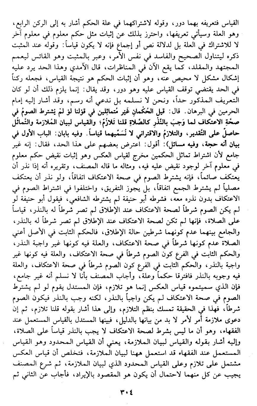 القياس فتعريفه بهما دور، وقوله: لاشتراكهما في علة الحكم أشار به إلى الركن الرابع، وهو العلة وسيأتي تعريفها، واحترز بذلك عن إثبات مثل حكم معلوم في معلوم آخر لا للاشتراك في العلة, بل لدلالة نص أو إجماع فإنه لا يكون قياسا. وقوله: عند المثبت ذكره ليتناول الصحيح والفاسد في نفس الأمر، وعبر بالمثبت وهو القائس ليعمم المجتهد والمقلد، كما يقع الآن في المناظرات، قال الآمدي: وهذا الحد يرد عليه إشكال مشكل لا محيص عنه، وهو أن إثبات الحكم هو نتيجة القياس، فجعله ركنا في الحد يقتضي توقف القياس عليه وهو دور، وقد يقال: إنما يلزم ذلك أن لو كان التعريف المذكور حدا، ونحن لا نسلمه بل ندعي أنه رسم, وقد أشار إليه إمام الحرمين في البرهان. قال: قيل: "الحكمان غير متماثلين في قولنا لو لم يشترط الصوم في صحة الاعتكاف لما وجب بالنذر كالصلاة قلنا: تلازم، والقياس لبيان الملازمة والتماثل حاصل على التقدير، والتلازم والاقتراني لا نسميهما قياسا. وفيه بابان:
