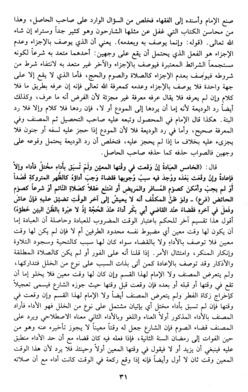 صنع الإمام وأسنده إلى الفقهاء فخلص من السؤال الوارد على صاحب الحاصل، وهذا من محاسن الكتاب التي غفل عن مثلها الشارحون, وهو كثير جدا وستراه إن شاء الله تعالى. قوله: "وإنما يوصف به وبعدمه" يعني: أن الذي يوصف بإلإجزاء وعدم الإجزاء هو الفعل الذي يحتمل أن يقع على وجهين, أحدهما متعدّ به شرعا لكونه مستجمعا الشرائط المعتبرة فيوصف بالإجزاء, والآخر غير متعد به لانتفاء شرط من شروطه فيوصف بعدم الإجزاء, كالصلاة والصوم والحج، فأما الذي لا يقع إلا على جهة واحدة فلا يوصف بالإجزاء وعدمه كمعرفة الله تعالى, فإنه إن عرفه بطريق ما فلا كلام وإن لم يعرفه فلا يقال: عرفه معرفة غير مجزئة؛ لأن الفرض أنه ما عرف، وكذلك أيضا رد الوديعة؛ لأنه إما أن يردها إلى المودع أو لا، فإن ردها فلا كلام وإلا فلا رد البتة. هكذا قال الإمام في المحصول وتبعه عليه صاحب التحصيل ثم المصنف وفي المعرفة صحيح، وأما في رد الوديعة فلا لأن المودع إذا حجز عليه لسفه أو جنون فلا يجزئ عليه بخلاف ما إذا لم يحجز عليه، فتخلص أن رد الوديعة يحتمل وقوعه على وجهين فالصواب حذفه كما حذفه صاحب الحاصل.