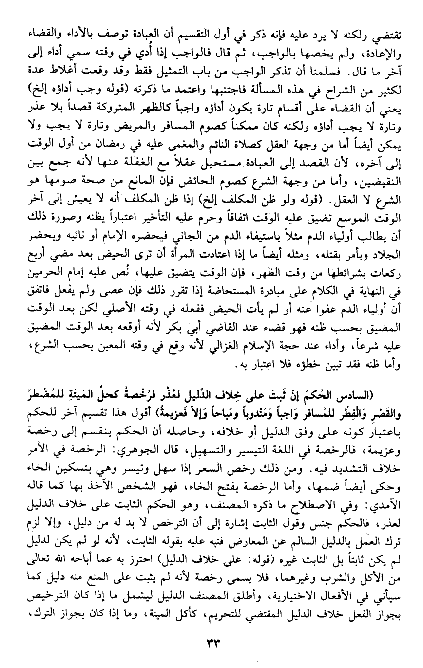 "السادس: الحكم إن ثبت على خلاف الدليل لعذر فرخصة, كحل الميتة للمضطر والقصر والفطر للمسافر واجبا ومندوبا ومباحا, وإلا فعزيمة" أقول: هذا تقسيم آخر للحكم باعتبار كونه على وفق الدليل أو خلافه، وحاصله: أن الحكم ينقسم إلى رخصة وعزيمة، فالرخصة في اللغة التيسير والتسهيل، قال الجوهري: الرخصة في الأمر خلاف التشديد فيه, ومن ذلك: رخص السعر إذا سهل وتيسر وهي بتسكين الخاء وحكي أيضا ضمها، وأما الرخصة بفتح الخاء، فهو الشخص الآخذ بها كما قاله الآمدي. وفي الاصطلاح ما ذكره المصنف، وهو الحكم الثابت على خلاف الدليل لعذر، فالحكم جنس وقول الثابت إشارة إلى أن الترخص لا بد له من دليل، وإلا لزم ترك العمل بالدليل السالم عن المعارض, فنبه عليه بقوله الثابت؛ لأنه لو لم يكن لدليل لم يكن ثابتا بل الثابت غيره. قوله: "على خلاف الدليل" احترز به عما أباحه الله تعالى من الأكل والشرب وغيرهما، فلا يسمى رخصة لأنه لم يثبت على المنع منه دليل كما سيأتي في الأفعال الاختيارية، وأطلق المصنف الدليل ليشمل ما إذا كان الترخيص بجواز الفعل خلاف الدليل المقتضي للتحريم، كأكل الميتة، وما إذا كان بجواز الترك،