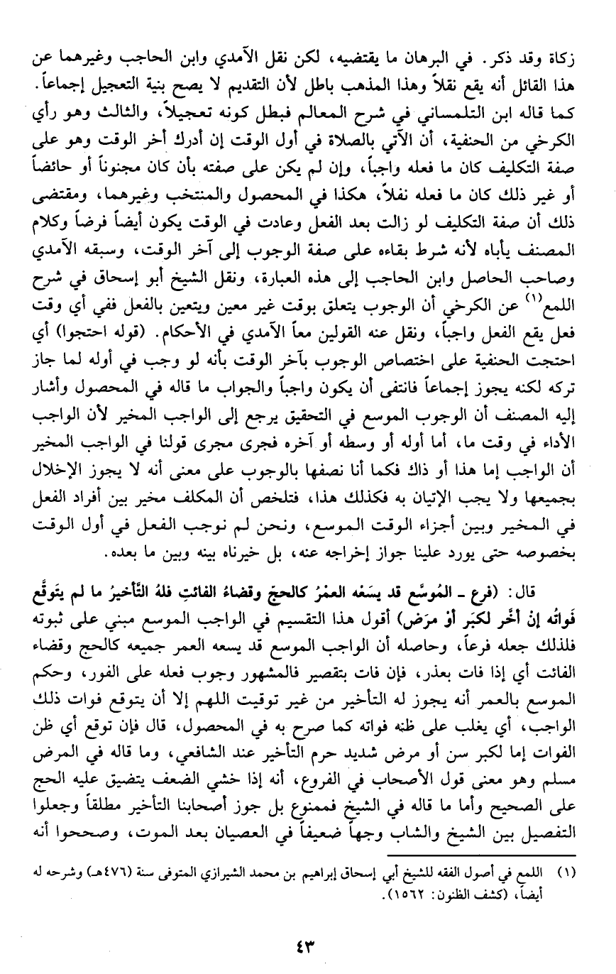 1 اللمع في أصول الفقه للشيخ أبي إسحاق إبراهيم بن محمد الشيرازي, المتوفى سنة "476هـ" وشرحه له أيضا، "كشف الظنون: 1562".
