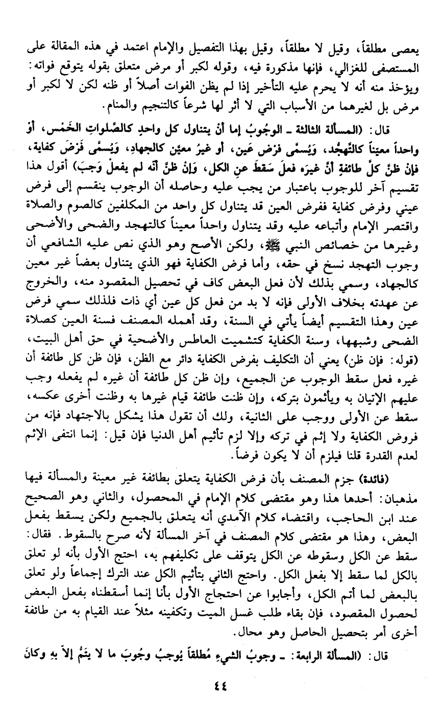 قال: "المسألة الثالثة: الوجوب إما أن يتناول كل واحد كالصلوات الخمس، أو واحدا معينا كالتهجد، ويسمى فرض عين، أو غير معين كالجهاد، ويسمى فرض كفاية، فإن ظن كل طائفة أن غيره فعل سقط عن الكل، وإن ظن أنه لم يفعل وجب" أقول: هذا تقسيم آخر للوجوب باعتبار من يجب عليه, وحاصله: أن الوجوب ينقسم إلى فرض عيني وفرض كفاية, ففرض العين قد يتناول كل واحد من المكلفين كالصوم والصلاة واقتصر الإمام وأتباعه عليه, وقد يتناول واحدا معينا كالتهجد والضحى والأضحى وغيرها من خصائص النبي صلى الله عليه وسلم، ولكن الأصح وهو الذي نص عليه الشافعي أن وجوب التهجد نسخ في حقه، وأما فرض الكفاية فهو الذي يتناول بعضا غير معين كالجهاد، وسمي بذلك لأن فعل البعض كافٍ في تحصيل المقصود منه، والخروج عن عهدته بخلاف الأولى, فإنه لا بد من فعل كل عين أي: ذات؛ فلذلك سمي فرض عين وهذا التقسيم أيضا يأتي في السنة، وقد أهمله المصنف فسنة العين كصلاة الضحى وشبهها، وسنة الكفاية كتشميت العاطس والأضحية في حق أهل البيت. قوله: "فإن ظن" يعني: أن التكليف بفرض الكفاية دائر مع الظن، فإن ظن كل طائفة أن غيره فعل سقط الوجوب عن الجميع، وإن ظن كل طائفة أن غيره لم يفعله وجب عليهم الإتيان به ويأثمون بتركه، وإن ظنت طائفة قيام غيرها به وظنت أخرى عكسه، سقط عن الأولى ووجب على الثانية، ولك أن تقول: هذا يشكل بالاجتهاد فإنه من فروض الكفاية, ولا إثم في تركه, وإلا لزم تأثيم أهل الدنيا, فإن قيل: إنما انتفى الإثم لعدم القدرة قلنا: فيلزم أن لا يكون فرضا.