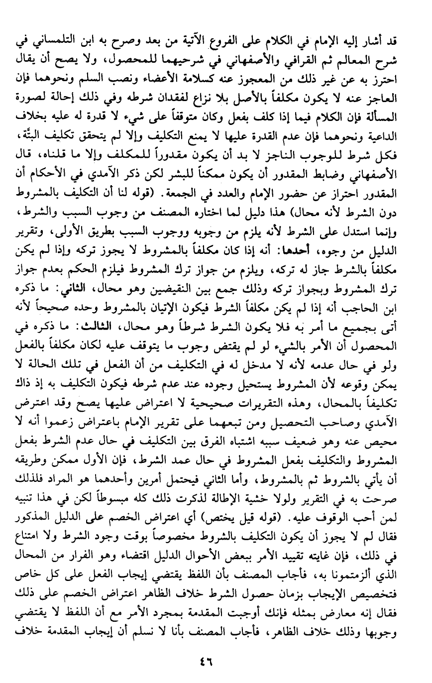قد أشار إليه الإمام في الكلام على الفروع الآتية من بعد, وصرح به ابن التلمساني في شرح المعالم ثم القرافي والأصفهاني في شرحيهما للمحصول، ولا يصح أن يقال: احترز به عن غير ذلك من المعجوز عنه كسلامة الأعضاء ونصب السلم ونحوهما, فإن العاجز عنه لا يكون مكلفا بالأصل بلا نزاع لفقدان شرطه وفي ذلك إحالة لصورة المسألة, فإن الكلام فيما إذا كلف بفعل وكان متوقفا على شيء لا قدرة له عليه بخلاف الداعية ونحوها, فإن عدم القدرة عليها لا يمنع التكليف وإلا لم يتحقق تكليف البتة, فكل شرط للوجوب الناجز لا بد أن يكون مقدورا للمكلف وإلا ما قلناه، قال الأصفهاني: وضابط المقدور أن يكون ممكنا للبشر, لكن ذكر الآمدي في الأحكام أن المقدور احتراز عن حضور الإمام والعدد في الجمعة. قوله: "لنا أن التكليف بالمشروط دون الشرط؛ لأنه محال" هذا دليل لما اختاره المصنف من وجوب السبب والشرط، وإنما استدل على الشرط؛ لأنه يلزم من وجوبه ووجوب السبب بطريق الأولى، وتقرير الدليل من وجوه، أحدها: أنه إذا كان مكلفا بالمشروط لا يجوز تركه وإذا لم يكن مكلفا بالشرط جاز له تركه، ويلزم من جواز ترك المشروط فيلزم الحكم بعدم جواز ترك المشروط وبجواز تركه, وذلك جمع بين النقيضين وهو محال، الثاني, ما ذكره ابن الحاجب: أنه إذا لم يكن مكلفا الشرط, فيكون الإتيان بالمشروط وحده صحيحا؛ لأنه أتى بجميع ما أمر به فلا يكون الشرط شرطا وهو محال، والثالث, ما ذكره في المحصول: أن الأمر بالشيء لو لم يقتض وجوب ما يتوقف عليه لكان مكلفا بالفعل ولو في حال عدمه؛ لأنه لا مدخل له في التكليف من أن الفعل في تلك الحالة لا يمكن وقوعه لأن المشروط يستحيل وجوده عند عدم شرطه, فيكون التكليف به إذ ذاك تكليفا بالمحال, وهذه التقريرات صحيحة لا اعتراض عليها يصح وقد اعترض الآمدي وصاحب التحصيل ومن تبعهما على تقرير الإمام باعتراض زعموا أنه لا محيص عنه وهو ضعيف, سببه اشتباه الفرق بين التكليف في حال عدم الشرط بفعل المشروط والتكليف بفعل المشروط في حال عمد الشرط، فإن الأول ممكن وطريقه أن يأتي بالشرط ثم بالمشروط، وأما الثاني فيحتمل أمرين, وأحدهما هو المراد؛ فلذلك صرحت به في التقرير ولولا خشية الإطالة لذكرت ذلك كله مبسوطا لكن في هذا تنبيه لمن أحب الوقوف عليه. قوله: "قيل: يختص" أي: اعتراض الخصم على الدليل المذكور فقال: لم لا يجوز أن يكون التكليف بالشروط مخصوصا بوقت وجود الشرط ولا امتناع في ذلك، فإن غايته تقييد الأمر ببعض الأحوال الدليل اقتضاء وهو الفرار من المحال الذي ألزمتمونا به، فأجاب المصنف بأن اللفظ يقتضي إيجاب الفعل على كل خاص فتخصيص الإيجاب بزمان حصول الشرط خلاف الظاهر اعتراض الخصم على ذلك فقال: إنه معارض بمثله فإنك أوجبت المقدمة بمجرد الأمر مع أن اللفظ لا يقتضي وجوبها, وذلك خلاف الظاهر، فأجاب المصنف بأنا لا نسلم أن إيجاب المقدمة خلاف