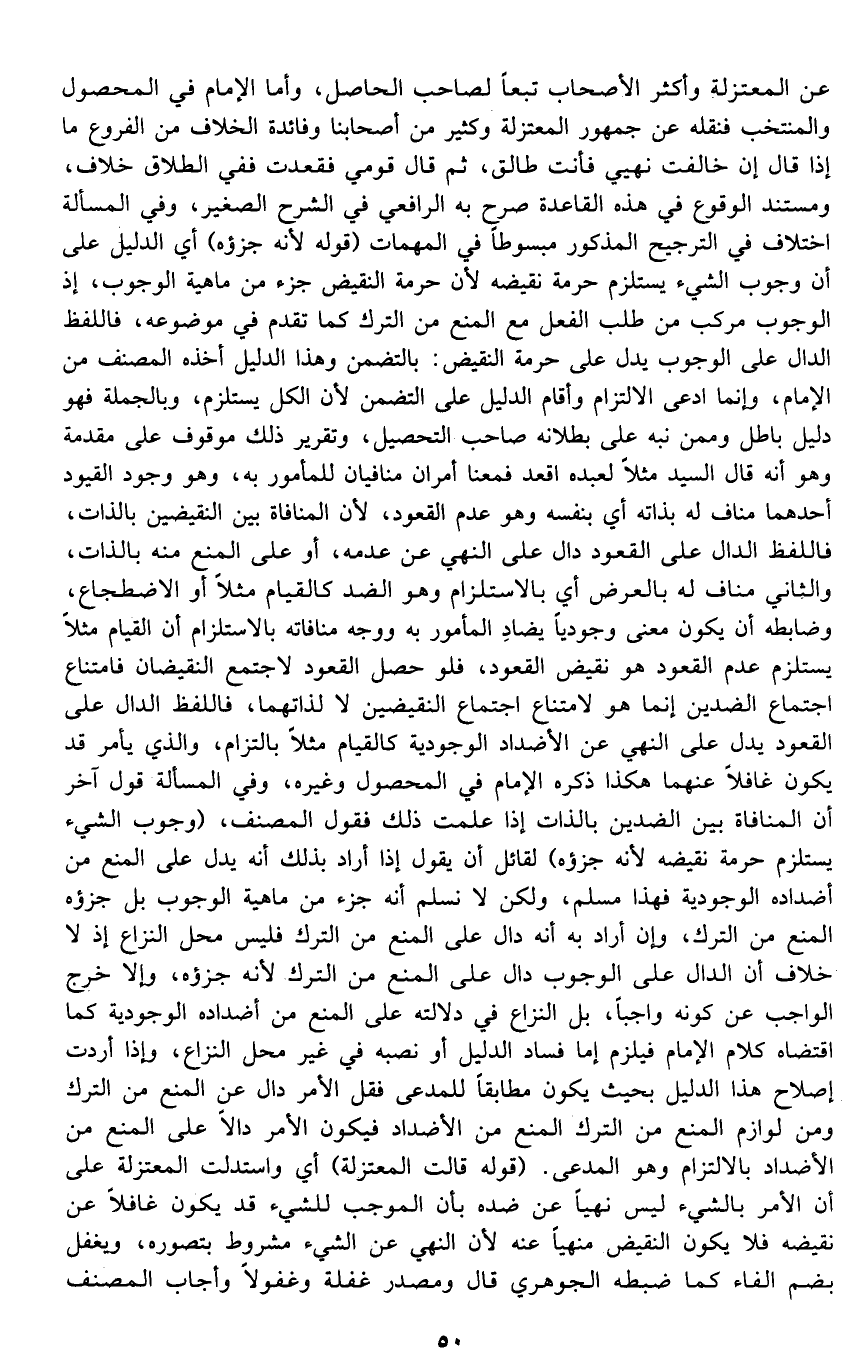 عن المعتزلة, وأكثر الأصحاب تبع لصاحب الحاصل، وأما الإمام في المحصول والمنتخب فنقله عن جمهور المعتزلة وكثير من أصحابنا, وفائدة الخلاف من الفروع ما إذا قال: إن خالفت نهيي فأنت طالق، ثم قال: قومي فقعدت ففي الطلاق خلاف، ومستند الوقوع في هذه القاعدة صرح به الرافعي في الشرح الصغير, وفي المسألة اختلاف في الترجيح المذكور مبسوط في المهمات. قوله: "لأنه جزؤه" أي: الدليل على أن وجوب الشيء يستلزم حرمة نقيضه؛ لأن حرمة النقيض جزء من ماهية الوجوب، إذ الوجوب مركب من طلب الفعل مع المنع من الترك كما تقدم في موضوعه، فاللفظ الدال على الوجوب يدل على حرمة النقيض بالتضمن, وهذا الدليل أخذه المصنف من الإمام، وإنما ادعى الالتزام وأقام الدليل على التضمن لأن الكل يستلزم، وبالجملة فهو دليل باطل وممن نبه على بطلانه صاحب التحصيل، وتقرير ذلك موقوف على مقدمة وهو أنه قال السيد مثلا لعبده: اقعد, فمعنا أمران منافيان للمأمور به وهو وجود القيود, أحدهما: مناف له بذاته أي بنفسه وهو عدم القعود؛ لأن المنافاة بين النقيضين بالذات، فاللفظ الدال على القعود دال على النهي عن عدمه، أو على المنع منه بالذات، والثاني: منافٍ له بالعرض أي: بالاستلزام وهو الضد كالقيام مثلا أو الاضطجاع، وضابطه أن يكون معنى وجوديا يضاد المأمور به, ووجه منافاته بالاستلزام أن القيام مثلا يستلزم عدم القعود هو نقيض القعود، فلو حصل القعود لاجتمع النقيضان فامتناع اجتماع الضدين إنما هو لامتناع اجتماع النقيضين لا لذاتهما، فاللفظ الدال على القعود يدل على النهي عن الأضداد الوجودية كالقيام مثلا بالتزام، والذي يأمر قد يكون غافلا عنهما هكذا ذكره الإمام في المحصول وغيره، وفي المسألة قول آخر: أن المنافاة بين الضدين بالذات إذا علمت ذلك فقول المصنف: "وجوب الشيء يستلزم حرمة نقيضه؛ لأنه جزؤه" لقائل أن يقول: إذا أراد بذلك أنه يدل على المنع من أضداده الوجودية فهذا مسلم، ولكن لا نسلم أنه جزء من ماهية الوجوب بل جزؤه المنع من الترك، وإن أراد به أنه دال على المنع من الترك فليس محل النزاع, إذ لا خلاف أن الدال على الوجوب دال على المنع من الترك لأنه جزؤه، وإلا خرج الواجب عن كونه واجبا، بل النزاع في دلالته على المنع من أضداده الوجودية كما اقتضاه كلام الإمام فيلزم إما فساد الدليل أو نصبه في غير محل النزاع، وإذا أردت إصلاح هذا الدليل بحيث يكون مطابقا للمدعى فقل: الأمر دال عن المنع من الترك, ومن لوازم المنع من الترك المنع من الأضداد فيكون الأمر دالا على المنع من الأضداد بالالتزام وهو المدعى. قوله: "قالت المعتزلة" أي: واستدلت المعتزلة على أن الأمر بالشيء ليس نهيا عن ضده بأن الموجب للشيء قد يكون غافلا عن نقيضه, فلا يكون النقيض منهيا عنه؛ لأن النهي عن الشيء مشروط بتصوره، ويغفل بضم الفاء كما ضبطه الجوهري قال: ومصدرها غفلة وغفولا وأجاب المصنف