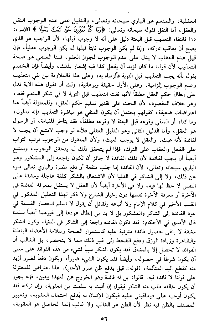 العقلية، والمنعم هو البارئ سبحانه وتعالى، والدليل على عدم الوجوب النقل والعقل، أما النقل فقوله سبحانه وتعالى: {وَمَا كُنَّا مُعَذِّبِينَ حَتَّى نَبْعَثَ رَسُولًا} [الإسراء: 15] فانتفاء التعذيب قبل البعثة دليل على أنه لا وجوب قبلها؛ لأن الواجب هو الذي يصح أن يعاقب تاركه، وإذا لم يكن الوجوب ثابتا قبلها لم يكن الوجوب عقليا، فإن قيل: عدم العقاب لا يدل على عدم الوجوب لجواز العفو، قلنا: المنفي هو صحة التعذيب؛ لأن قولنا: ما كان لزيد أن يفعل كذا فيه إشعار بذلك، وأيضا فإن الخصم يقول بأنه يجب التعذيب قبل التوبة فألزمناه به, وعلى هذا فالملازمة بين نفي التعذيب وعدم الوجوب إلزامية، وعلى الأول حقيقة وبرهانية، ولك أن تقول: هذه الآية تدل على إبطال حكم العقل مطلقا؛ لأنها نفت التعذيب قبل التوبة لا في شكر المنعم فقط، وهو خلاف المقصود؛ لأن البحث على تقدير تسليم حكم العقل، وللمعتزلة أيضا هنا اعتراضات ضعيفة، كقولهم: يحتمل أن يكون المنفي هو مباشرة التعذيب فإنه مدلول، وما كنا أو المنفي وقوعه قبل البعثة لا وقوعه مطلقا، فقد يتأخر للقيامة، أو الرسول هو العقل، وأما الدليل الثاني وهو الدليل العقلي فلأنه لو وجب لامتنع أن يجب لا لفائدة لأنه عبث، والعقل لا يوجب العبث، ولأن المعقول من الوجوب ترتب الثواب على الفعل والعقاب على الترك، فإذا لم يتحقق ذلك لم يتحقق الوجوب، ويمتنع أيضا أن يجب لفائدة؛ لأن تلك الفائدة لا جائز أن تكون راجعة إلى المشكور وهو البارئ سبحانه وتعالى؛ لأن الفائدة إما جلب منفعة أو دفع مضرة والبارئ تعالى منزه عن ذلك، ولا إلى الشاكر في الدنيا؛ لأن الاشتغال بالشكر كلفة عاجلة ومشقة على النفس لا حظ لها فيه، ولا في الآخرة أيضا؛ لأن العقل لا يستقل بمعرفة الفائدة في الآخرة أو معرفة الآخرة نفسها دون إخبار الشارع ولا ذكر لهذا التعليل المذكور في القسم الأخير في كلام الإمام ولا أتباعه, ولقائل أن يقول: لا نسلم انحصار القسمة في عود الفائدة إلى الشاكر والمشكور بل لا بد من إبطال عودها إلى غيرهما أيضا سلمنا, قال الآمدي في الأحكام: فقد تكون الفائدة راجعة إلى الشاكر في الدنيا، وكون الشكر مشقة لا ينفي حصول فائدة مترتبة عليه كاستمرار الصحة وسلامة الأعضاء الباطنة والظاهرة وزيادة الرزق ودفع القحط, إلى غير ذلك مما لا ينحصر، بل الغالب أن الفوائد لا تحصل إلا بالمشاق فقد يكون الشكر سببا لشيء من هذه الفوائد على معنى أن يكون شرطا في حصوله، وأيضا فقد يكون الشيء ضررًا، ويكون دفعا لضرر أزيد منه كقطع اليد المتألمة. قوله: "قيل: يدفع ظن ضرر الأجل" هذا اعتراض للمعتزلة على قولنا: لا فائدة فيه. قالوا: بل له فائدة وهو الخروج عن العهدة بيقين، فإنه يجوز أن يكون خالقه طلب منه الشكر فيقول: إن أتيت به سلمت من العقوبة, وإن تركته فقد يكون أوجبه علي فيعاقبني عليه فيكون الإتيان به يدفع احتمال العقوبة، وتعبير المصنف بالظن فيه نظر؛ لأن الظن هو الغالب ولا غالب إنما الحاصل هو العقوبة،