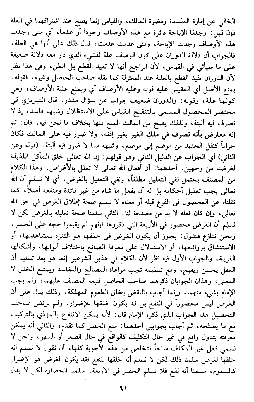 الخالي عن أمارة المفسدة ومضرة المالك, والقياس إنما يصح عند اشتراكهما في العلة, فإن قيل: وجدنا الإباحة دائرة مع هذه الأوصاف وجودا أو عدما، أي: متى وجدت هذه الأوصاف وجدت الإباحة, ومتى عدمت عدمت، فدل ذلك على أنها هي العلة, فالجواب: أن دلالة الدوران على كون الوصف علة للشيء الذي دار معه دلالة ضعيفة على ما سيأتي في القياس؛ لأن الراجح أنها لا تفيد القطع بل الظن، وفي هذا نظر لأن الدوران يفيد القطع بالعلية عند المعتزلة كما نقله صاحب الحاصل وغيره، فقوله: بمنع الأصل أي: المقيس عليه وقوله: وعليه الأوصاف أي: وبمنع علية الأوصاف، وهي كونها علة، وقوله: والدوران ضعيف جواب عن سؤال مقدر. قال التبريزي في مختصر المحصول المسمى بالتنقيح: القياس على الاستظلال وشبهه فاسد، إذ لا تصرف فيه البتة، ولذلك يصح من المالك المنع منها بخلاف ما نحن فيه، قال: ثم إنه معارض بأنه تصرف في ملك الغير بغير إذنه، ولا ضرر فيه على الملك فكان حراما كنقل الحديد من موضع إلى موضع، وشبهه مما لا ضرر فيه البته. قوله: "وعن الثاني" أي: الجواب عن الدليل الثاني وهو قولهم: إن الله تعالى خلق المآكل اللذيذة لغرضنا من وجهين, أحدهما: أن أفعال الله تعالى لا تعلل بالأغراض، وهذا الكلام من المصنف يحتمل نفي التعليل مطلقا، ونفي التعليل بالغرض، أي: لا نسلم أن الله تعالى يجب تعليل أحكامه بل له أن يفعل ما شاء من غير فائدة ومنفعة أصلا، كما نقلناه عن المحصول في الفرع قبله أو معناه: لا نسلم صحة إطلاق الغرض في حق الله تعالى، وإن كان فعله لا بد من مصلحة لنا. الثاني: سلمنا صحة تعليله بالغرض لكن لا نسلم أن الغرض محصور في الأربعة التي ذكروها, فإنهم لم يقيموا حجة على الحصر، ونحن ننازع فنقول: يجوز أن يكون الغرض في خلقها هو التنزه بمشاهدتها، أو الاستنشاق بروائحها، أو الاستدلال على معرفة الصانع باختلاف ألوانها، وأشكالها الغريبة، والجواب الأول فيه نظر؛ لأن الكلام في هذين الشرعين إنما هو بعد تسليم أن العقل يحسن ويقبح، ومع تسليمه تجب مراعاة المصالح والمفاسد ويمتنع الخلق لا المعنى، وهذان الجوابان ذكرهما صاحب الحاصل فتبعه المصنف عليهما، ولم يجب الإمام بشيء منهما, وإنما أجاب بالنقض بخلق الطعوم المهلكة، وذلك يدل على أن الغرض ليس محصورا في النفع بل قد يكون خلقها للإضرار، ولم يرتض صاحب التحصيل هذا الجواب الذي ذكره الإمام قال: لأنه يمكن الانتفاع بالمؤذي بالتركيب مع ما يصحله, ثم أجاب بجوابين, أحدهما: منع الحصر كما تقدم، والثاني: أنه يمكن معرفته بتناول واقع في غير حال التكليف كالواقع في حال الصغر أو السهو، ونحن لا نسمي فعل غير المكلف مباحا, فتخلص من هذه الأجوبة كلها، أن نقول: لا نسلم أنه خلقها لغرض سلمنا ذلك لكن لا نسلم أنه خلقها للنفع, فقد يكون الغرض هو الإضرار كالسموم، سلمنا أنه نفع فلا نسلم الحصر في الأربعة، سلمنا انحصاره لكن لا يدل