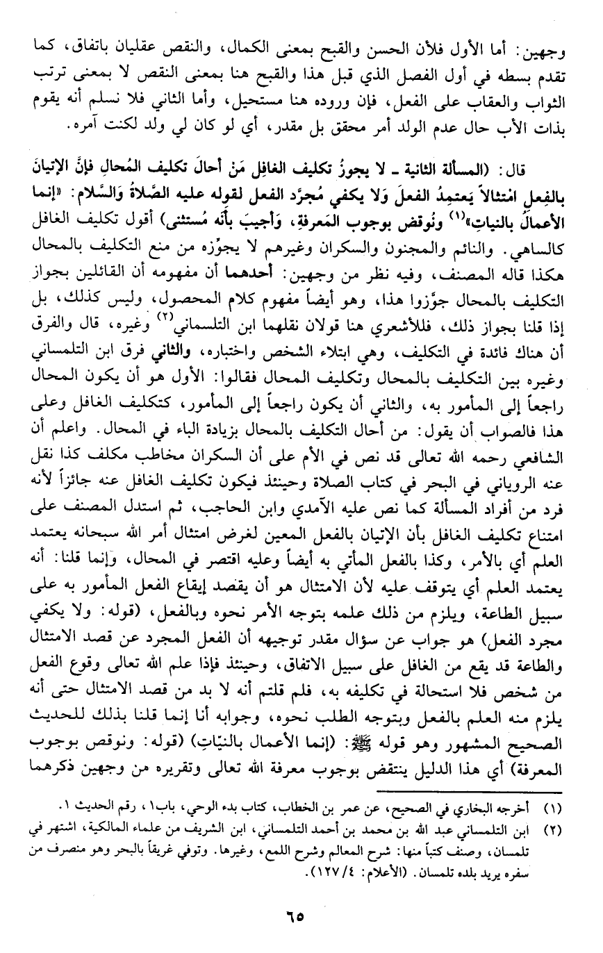 قال: "المسألة الثانية: لا يجوز تكليف الغافل من أحال تكليف المحال, فإن الإتيان بالفعل امتثالا يعتمد الفعل ولا يكفي مجرد الفعل؛ لقوله عليه الصلاة والسلام: "إنما الأعمال بالنيات" 1 ونوقض بوجوب المعرفة، وأجيب بأنه مستثنى" أقول: تكليف الغافل كالساهي والنائم والمجنون والسكران وغيرهم لا يجوزه من منع التكليف بالمحال, هكذا قاله المصنف، وفيه نظر من وجهين, أحدهما: أن مفهومه أن القائلين بجواز التكليف بالمحال جوزوا هذا، وهو أيضا مفهوم كلام المحصول، وليس كذلك، بل إذا قلنا بجواز ذلك, فللأشعري هنا قولان نقلهما ابن التلمساني2 وغيره, قال: والفرق أن هناك فائدة في التكليف، وهي ابتلاء الشخص واختباره، والثاني: فرق ابن التلمساني وغيره بين التكليف بالمحال وتكليف المحال فقالوا: الأول هو أن يكون المحال راجعا إلى المأمور به, والثاني: أن يكون راجعا إلى المأمور، كتكليف الغافل, وعلى هذا فالصواب أن يقول: من أحال التكليف بالمحال بزيادة الباء في المحال. واعلم أن الشافعي -رحمه الله تعالى- قد نص في الأم على أن السكران مخاطب مكلف كذا نقل عنه الروياني في البحر في كتاب الصلاة, وحينئذ فيكون تكليف الغافل عنه جائزا؛ لأنه فرد من أفراد المسألة كما نص عليه الآمدي وابن الحاجب، ثم استدل المصنف على امتناع تكليف الغافل بأن الإتيان بالفعل المعين لغرض امتثال أمر الله سبحانه يعتمد العلم أي بالأمر, وكذا بالفعل المأتي به أيضا وعليه اقتصر في المحال, وإنما قلنا: إنه يعتمد العلم أي: يتوقف عليه؛ لأن الامتثال هو أن يقصد إيقاع الفعل المأمور به على سبيل الطاعة، ويلزم من ذلك علمه بتوجه الأمر نحوه وبالفعل. قوله: "ولا يكفي مجرد الفعل" هو جواب عن سؤال مقدر توجيهه أن الفعل المجرد عن قصد الامتثال والطاعة قد يقع من الغافل على سبيل الاتفاق، وحينئذ فإذا علم الله تعالى وقوع الفعل من شخص فلا استحالة في تكليفه به، فلم قلتم: إنه لا بد من قصد الامتثال حتى إنه يلزم منه العلم بالفعل وبتوجه الطلب نحوه، وجوابه: أنا إنما قلنا بذلك للحديث الصحيح المشهور وهو قوله -صلى الله عليه وسلم: "إنما الأعمال بالنيات". قوله: "ونوقض بوجوب المعرفة" أي: هذا الدليل ينتقض بوجوب معرفة الله تعالى وتقريره من وجهين ذكرهما
