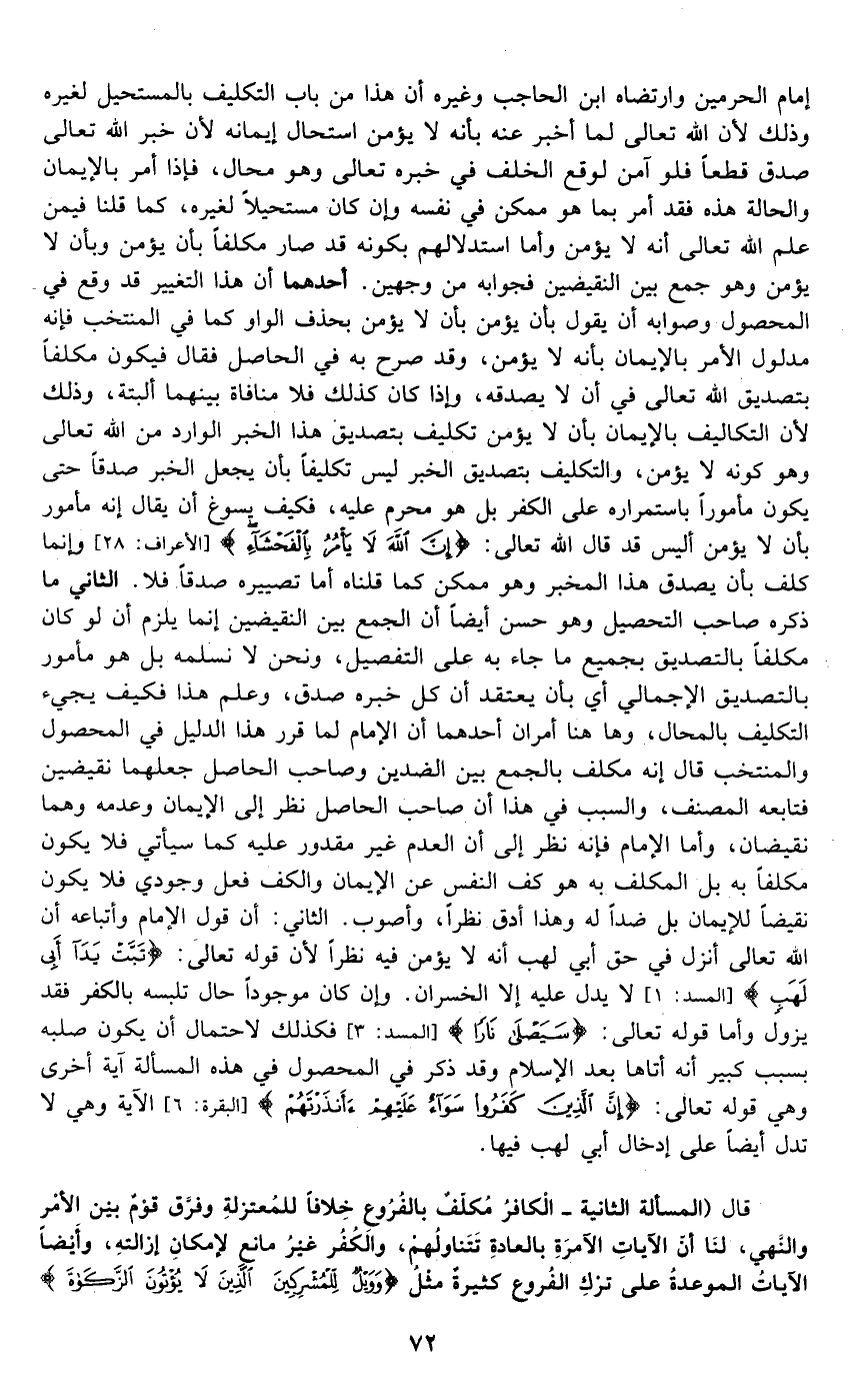 إمام الحرمين وارتضاه ابن الحاجب وغيره أن هذا من باب التكليف بالمستحيل لغيره؛ وذلك لأن الله تعالى لما أخبر عنه بأنه لا يؤمن استحال إيمانه؛ لأن خبر الله تعالى صدق قطعا, فلو آمن لوقع الخلف في خبره تعالى وهو محال, فإذا أمر بالإيمان والحالة هذه فقد أمر بما هو ممكن في نفسه وإن كان مستحيلا لغيره، كما قلنا فيمن علم الله تعالى أنه لا يؤمن, وأما استدلالهم بكونه قد صار مكلفا بأن يؤمن وبأن لا يؤمن وهو جمع بين النقيضين فجوابه من وجهين, أحدهما: أن هذا التغيير قد وقع في المحصول وصوابه أن يقول بأن يؤمن, بأن لا يؤمن بحذف الواو كما في المنتخب, فإنه مدلول الأمر بالإيمان بأنه لا يؤمن، وقد صرح به في الحاصل فقال: فيكون مكلفا بتصديق الله تعالى في أن لا يصدقه، وإذا كان كذلك فلا منافاة بينهما البتة؛ وذلك لأن التكاليف بالإيمان بأن لا يؤمن تكليف بتصديق هذا الخبر الوارد من الله تعالى وهو كونه لا يؤمن، والتكليف بتصديق الخبر ليس تكليفا بأن يجعل الخبر صدقا حتى يكون مأمورا باستمراره على الكفر بل هو محرم عليه، فكيف يسوغ أن يقال: إنه مأمور بأن لا يؤمن؟ أليس قد قال الله تعالى: {إِنَّ اللَّهَ لا يَأْمُرُ بِالْفَحْشَاءِ} [الأعراف: 28] ؟ وإنما كلف بأن يصدق هذا المخبر وهو ممكن كما قلناه, أما تصييره صدقا فلا. الثاني ما ذكره صاحب التحصيل وهو حسن أيضا: أن الجمع بين النقيضين إنما يلزم أن لو كان مكلفا بالتصديق بجميع ما جاء به على التفصيل, ونحن لا نسلمه بل هو مأمور بالتصديق الإجمالي أي: بأن يعتقد أن كل خبره صدق، وعلم هذا فكيف يجيء التكليف بالمحال، وههنا أمران أحدهما: أن الإمام لما قرر هذا الدليل في المحصول والمنتخب قال: إنه مكلف بالجمع بين الضدين, وصاحب الحاصل جعلهما نقيضين فتابعه المصنف, والسبب في هذا أن صاحب الحاصل نظر إلى الإيمان وعدمه وهما نقيضان، وأما الإمام فإنه نظر إلى أن العدم غير مقدور عليه كما سيأتي, فلا يكون مكلفا به بل المكلف به هو كف النفس عن الإيمان والكف فعل وجودي فلا يكون نقيضا للإيمان بل ضدا له وهذا أدق نظرا وأصوب. الثاني: أن قول الإمام وأتباعه: إن الله تعالى أنزل في حق أبي لهب أنه لا يؤمن فيه نظرا لأن قوله تعالى: {تَبَّتْ يَدَا أَبِي لَهَبٍ} [المسد: 1] لا يدل عليه إلا الخسران, وإن كان موجودا حال تلبسه بالكفر فقد يزول, وأما قوله تعالى: {سَيَصْلَى نَارًا} [المسد: 3] فكذلك لاحتمال أن يكون صلبه بسبب كبير أنه أتاها بعد الإسلام, وقد ذكر في المحصول في هذه المسألة آية أخرى وهي قوله تعالى: {إِنَّ الَّذِينَ كَفَرُوا سَوَاءٌ عَلَيْهِمْ أَأَنْذَرْتَهُمْ} [البقرة: 6] الآية, وهي لا تدل أيضا على إدخال أبي لهب فيها.