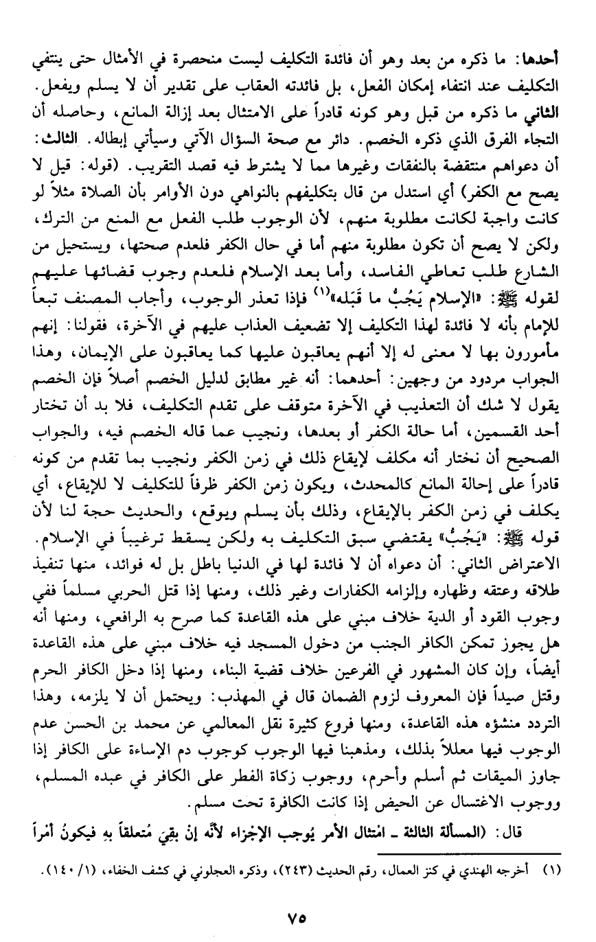 أحدها: ما ذكره من بعد, وهو أن فائدة التكليف ليست منحصرة في الأمثال حتى ينتفي التكليف عند انتفاء إمكان الفعل, بل فائدته العقاب على تقدير أن لا يسلم ويفعل. الثاني: ما ذكره من قبل وهو كونه قادرا على الامتثال بعد إزالة المانع، وحاصله أن التجاء الفرق الذي ذكره الخصم دائر مع صحة السؤال الآتي وسيأتي إبطاله. الثالث: أن دعواهم منتقضة بالنفقات وغيرها مما لا يشترط فيه قصد التقريب. قوله: "قيل: لا يصح مع الكفر" أي: استدل من قال بتكليفهم بالنواهي دون الأوامر بأن الصلاة مثلا لو كانت واجبة, لكانت مطلوبة منهم؛ لأن الوجوب طلب الفعل مع المنع من الترك، ولكن لا يصح أن تكون مطلوبة منهم, أما في حال الكفر فلعدم صحتها، ويستحيل من الشارع طلب تعاطي الفاسد، وأما بعد الإسلام فلعدم وجوب قضائها عليهم؛ لقوله -صلى الله عليه وسلم: "الإسلام يجبّ ما قبله" 1 فإذا تعذر الوجوب، وأجاب المصنف تبعا للإمام بأنه لا فائدة لهذا التكليف إلا تضعيف العذاب عليهم في الآخرة، فقولنا: إنهم مأمورون بها لا معنى له إلا أنهم يعاقبون عليها كما يعاقبون على الإيمان، وهذا الجواب مردود من وجهين, أحدهما: أنه غير مطابق لدليل الخصم أصلا فإن الخصم يقول لا شك: إن التعذيب في الآخرة متوقف على تقدم التكليف, فلا بد أن تختار أحد القسمين، إما حالة الكفر أو بعدها، ونجيب عما قاله الخصم فيه، والجواب الصحيح أن نختار أنه مكلف لإيقاع ذلك في زمن الكفر, ونجيب بما تقدم من كونه قادرا على إحالة المانع كالمحدث، ويكون زمن الكفر ظرفا للتكليف لا للإيقاع، أي: يكلف في زمن الكفر بالإيقاع، وذلك بأن يسلم ويوقع، والحديث حجة لنا؛ لأن قوله -صلى الله عليه وسلم: "يجب" يقتضي سبق التكليف به ولكن يسقط ترغيبا في الإسلام. الاعتراض الثاني: أن دعواه أن لا فائدة لها في الدنيا باطلة بل لها فوائد، منها تنفيذ طلاقة وعتقه وظهاره وإلزامه الكفارات وغير ذلك، ومنها إذا قتل الحربي مسلما ففي وجوب القود أو الدية خلاف مبني على هذه القاعدة كما صرح به الرافعي، ومنها أنه هل يجوز تمكن الكافر الجنب من دخول المسجد؟ فيه خلاف مبني على هذه القاعدة أيضا، وإن كان المشهور في الفرعين خلاف قضية البناء، ومنها إذا دخل الكافر الحرم وقتل صيدا فإن المعروف لزوم الضمان, قال في المهذب: ويحتمل أن لا يلزمه، وهذا التردد منشؤه هذه القاعدة، ومنها فروع كثيرة نقل المعالمي عن محمد بن الحسن عدم الوجوب فيها معللا بذلك، ومذهبنا فيها الوجوب كوجوب دم الإساءة على الكافر إذا جاوز الميقات, ثم أسلم وأحرم، ووجوب زكاة الفطر على الكافر في عبده المسلم، ووجوب الاغتسال عن الحيض إذا كانت الكافرة تحت مسلم.