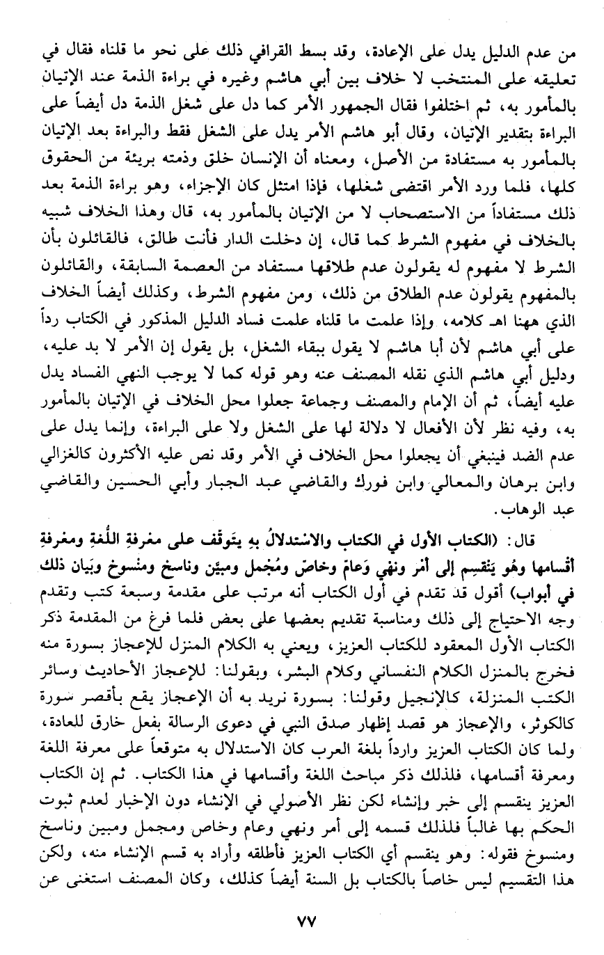 قال: "الكتاب الأول في الكتاب والاستدلال به يتوقف على معرفة اللغة ومعرفة أقسامها, وهو ينقسم إلى: أمر ونهي وعام وخاص ومجمل ومبين وناسخ ومنسوخ, وبيان ذلك في أبواب" أقول: قد تقدم في أول الكتاب أنه مرتب على مقدمة وسبعة كتب, وتقدم وجه الاحتياج إلى ذلك ومناسبة تقديم بعضها على بعض, فلما فرغ من المقدمة ذكر الكتاب الأول المعقود للكتاب العزيز, ويعني به الكلام المنزل للإعجاز بسورة منه, فخرج بالمنزل الكلام النفساني وكلام البشر، وبقولنا: للإعجاز, الأحاديث وسائر الكتب المنزلة كالإنجيل, وقولنا: بسورة نريد به أن الإعجاز يقع بأقصر سورة كالكوثر، والإعجاز هو قصد إظهار صدق النبي في دعوى الرسالة بفعل خارق للعادة، ولما كان الكتاب العزيز واردا بلغة العرب كان الاستدلال به متوقعا على معرفة اللغة ومعرفة أقسامها؛ فلذلك ذكر مباحث اللغة وأقسامها في هذا الكتاب. ثم إن الكتاب العزيز ينقسم إلى خبر وإنشاء لكن نظر الأصولي في الإنشاء دون الإخبار لعدم ثبوت الحكم بها غالب؛ فلذلك قسمه إلى أمر ونهي وعام وخاص ومجمل ومبين وناسخ ومنسوخ فقوله: وهو ينقسم أي: الكتاب العزيز فأطلقه وأراد به قسم الإنشاء منه، ولكن هذا التقسيم ليس خاصا بالكتاب بل السنة أيضا كذلك، وكان المصنف استغنى عن