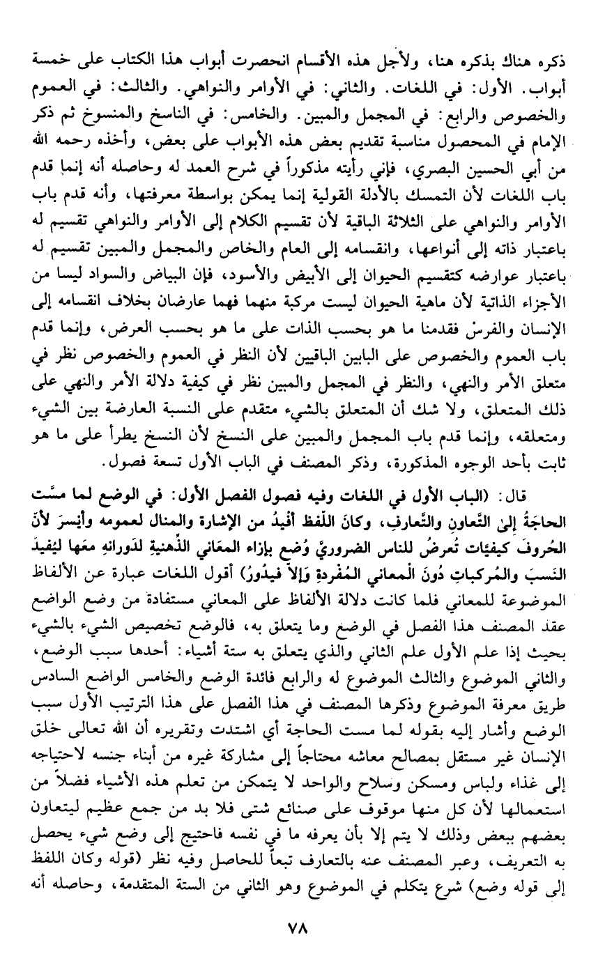 ذكره هناك بذكره هنا، ولأجل هذه الأقسام انحصرت أبواب هذا الكتاب على خمسة أبواب, الأول: في اللغات، والثاني: في الأوامر والنواهي, والثالث: في العموم والخصوص, والرابع: في المجمل والمبين, والخامس: في الناسخ والمنسوخ, ثم ذكر الإمام في المحصول مناسبة تقديم بعض هذه الأبواب على بعض، وأخذه رحمه الله من أبي الحسين البصري، فإني رأيته مذكورا في شرح العمد له, وحاصله أنه إنما قدم باب اللغات؛ لأن التمسك بالأدلة القولية إنما يمكن بواسطة معرفتها، وأنه قدم باب الأوامر والنواهي على الثلاثة الباقية؛ لأن تقسيم الكلام إلى الأوامر والنواهي تقسيم له باعتبار ذاته إلى أنواعها، وانقسامه إلى العام والخاص والمجمل والمبين تقسيم له باعتبار عوارضه كتقسيم الحيوان إلى الأبيض والأسود، فإن البياض والسواد ليسا من الأجزاء الذاتية؛ لأن ماهية الحيوان ليست مركبة منهما فهما عارضان بخلاف انقسامه إلى الإنسان والفرس, فقدمنا ما هو بحسب الذات على ما هو بحسب العرض، وإنما قدم باب العموم والخصوص على البابين الباقيين؛ لأن النظر في العموم والخصوص نظر في متعلق الأمر والنهي، والنظر في المجمل والمبين نظر في كيفية دلالة الأمر والنهي على ذلك المتعلق، ولا شك أن المتعلق بالشيء متقدم على النسبة العارضة بين الشيء ومتعلقه، وإنما قدم باب المجمل والمبين على النسخ؛ لأن النسخ يطرأ على ما هو ثابت بأحد الوجوه المذكورة، وذكر المصنف في الباب الأول تسعة فصول.